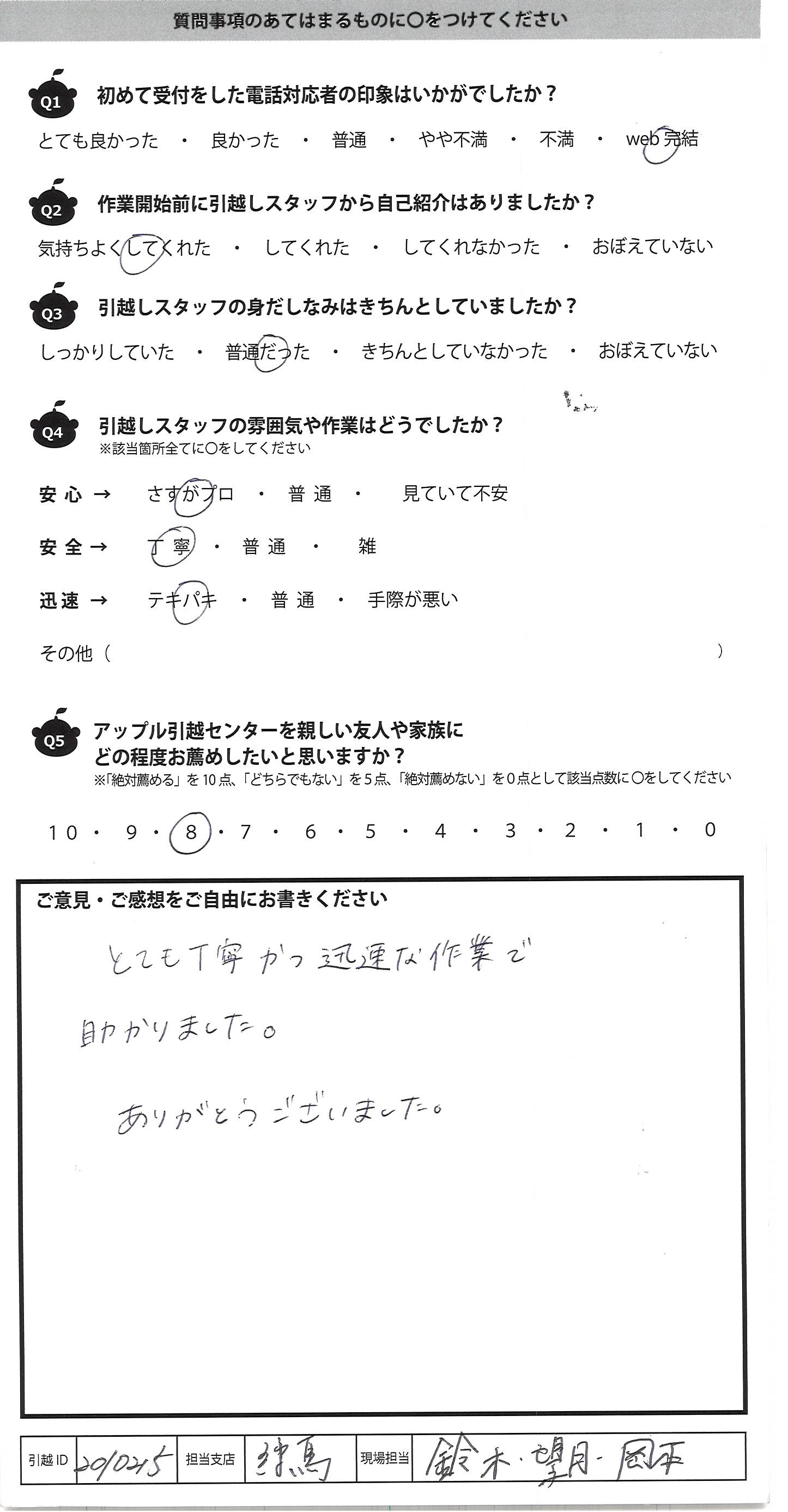 A.一軒家の引越しで荷物が多く不安でしたが テキパキと運びだしてくださり 予想より早く引越し作業を終える ことができました ありがとうございました
