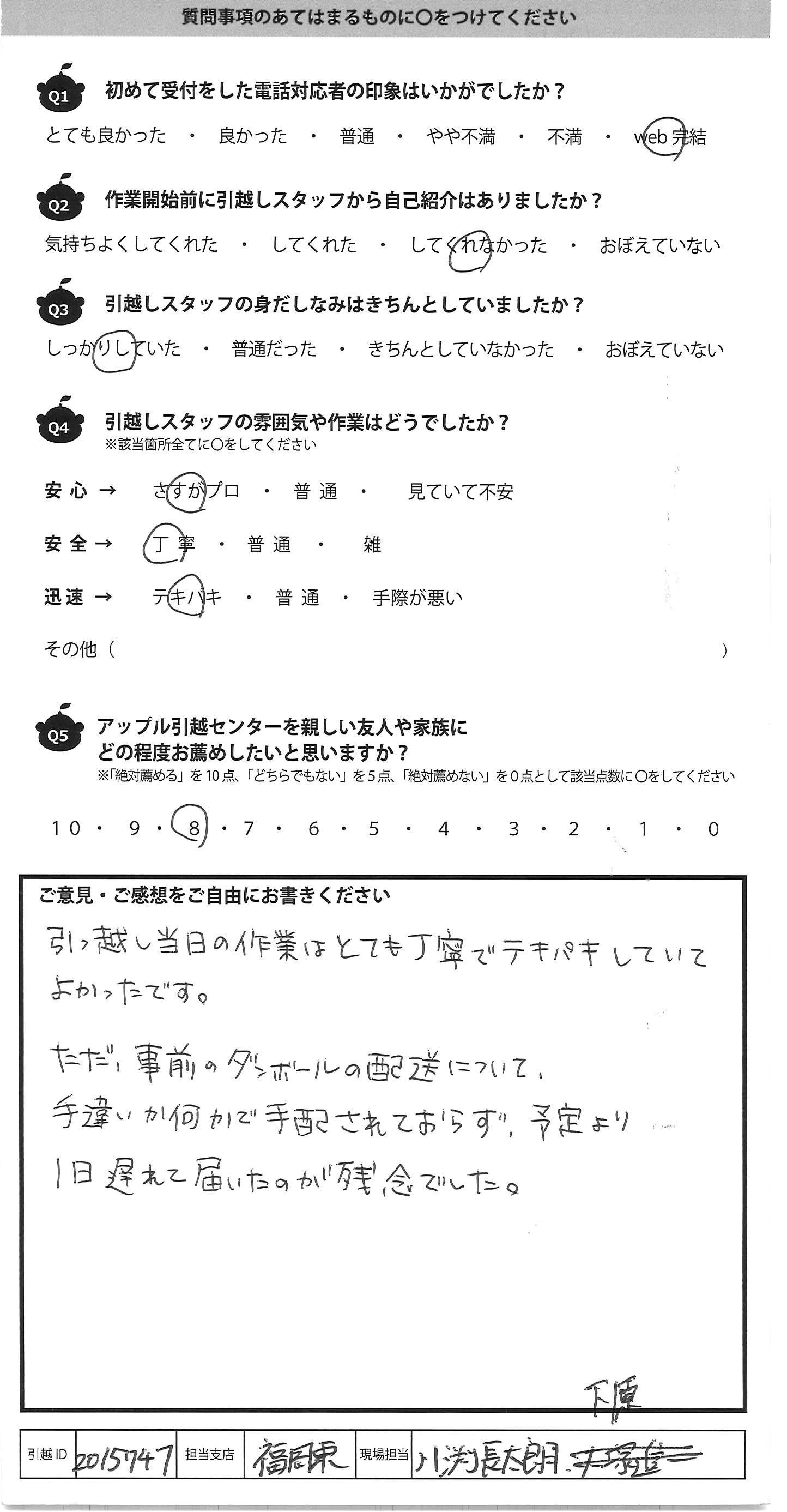 A.引っ越し当日の作業はとても丁寧でテキパキしていて よかったです ただ、事前のダンボールの配送について 手違いか何かで手配されておらず、予定より 1日遅れて届いたが、残念でした