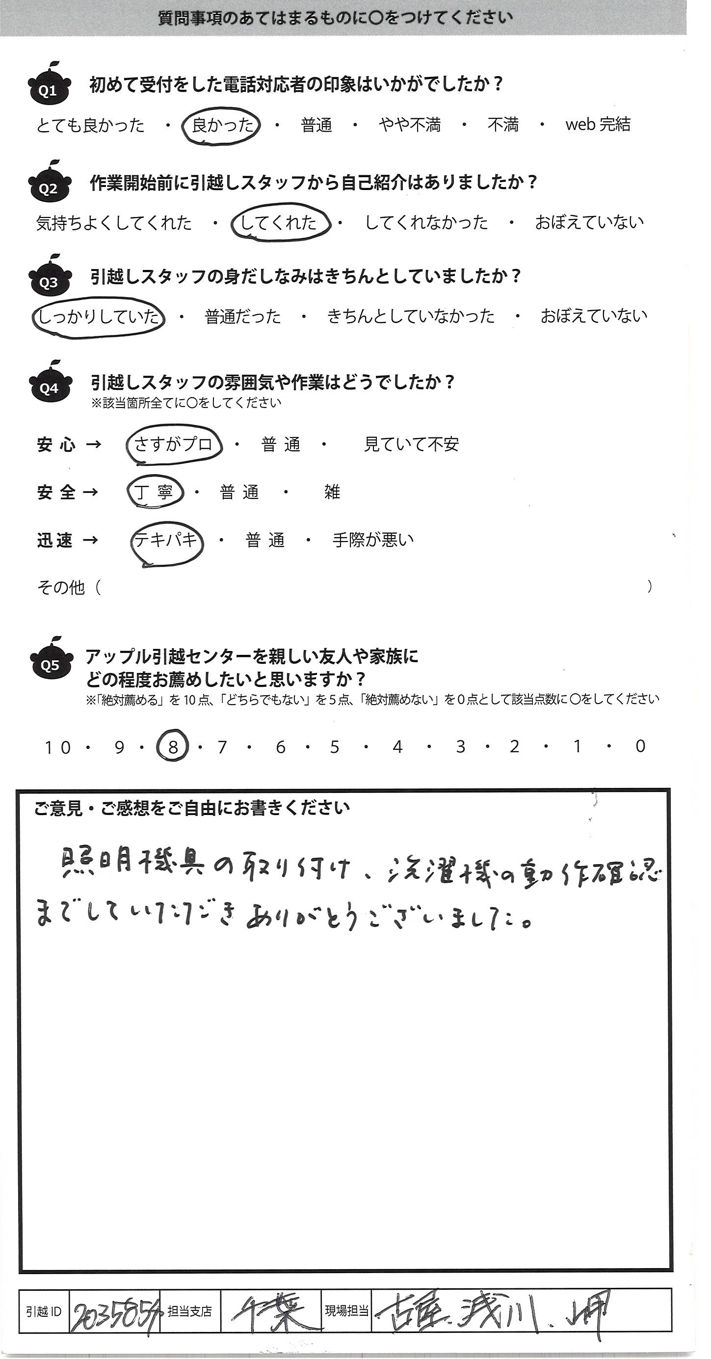 A.照明機具の取り付け、洗濯機の動作確認 までしていただきありがとうございました