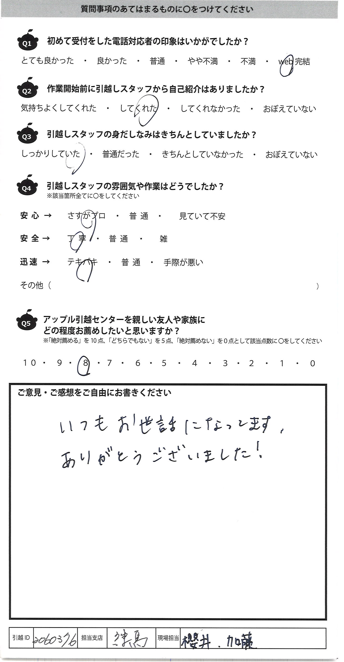 A.ありがとうございました。 気持ちよく引越しを終えることが出来ました。