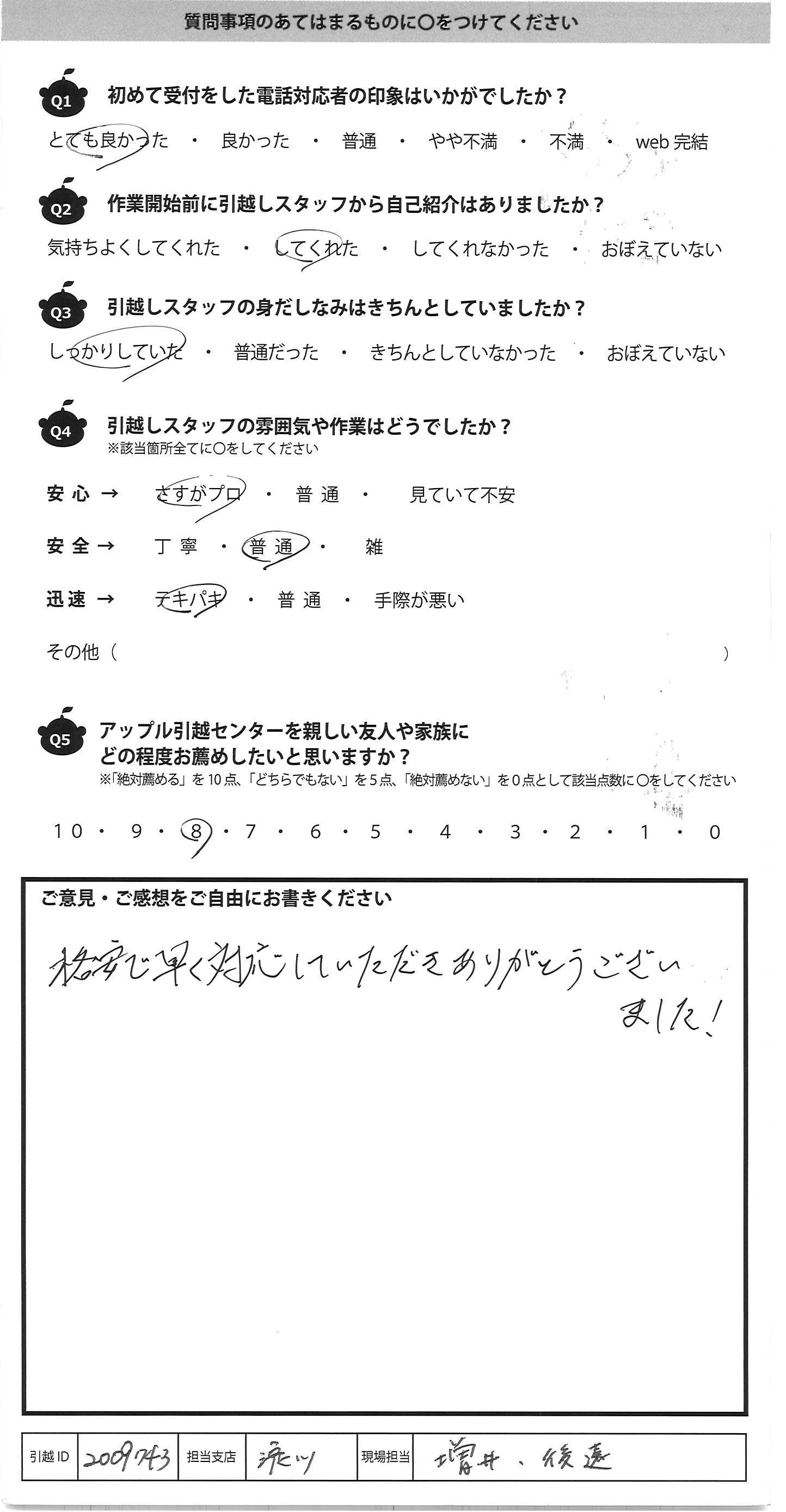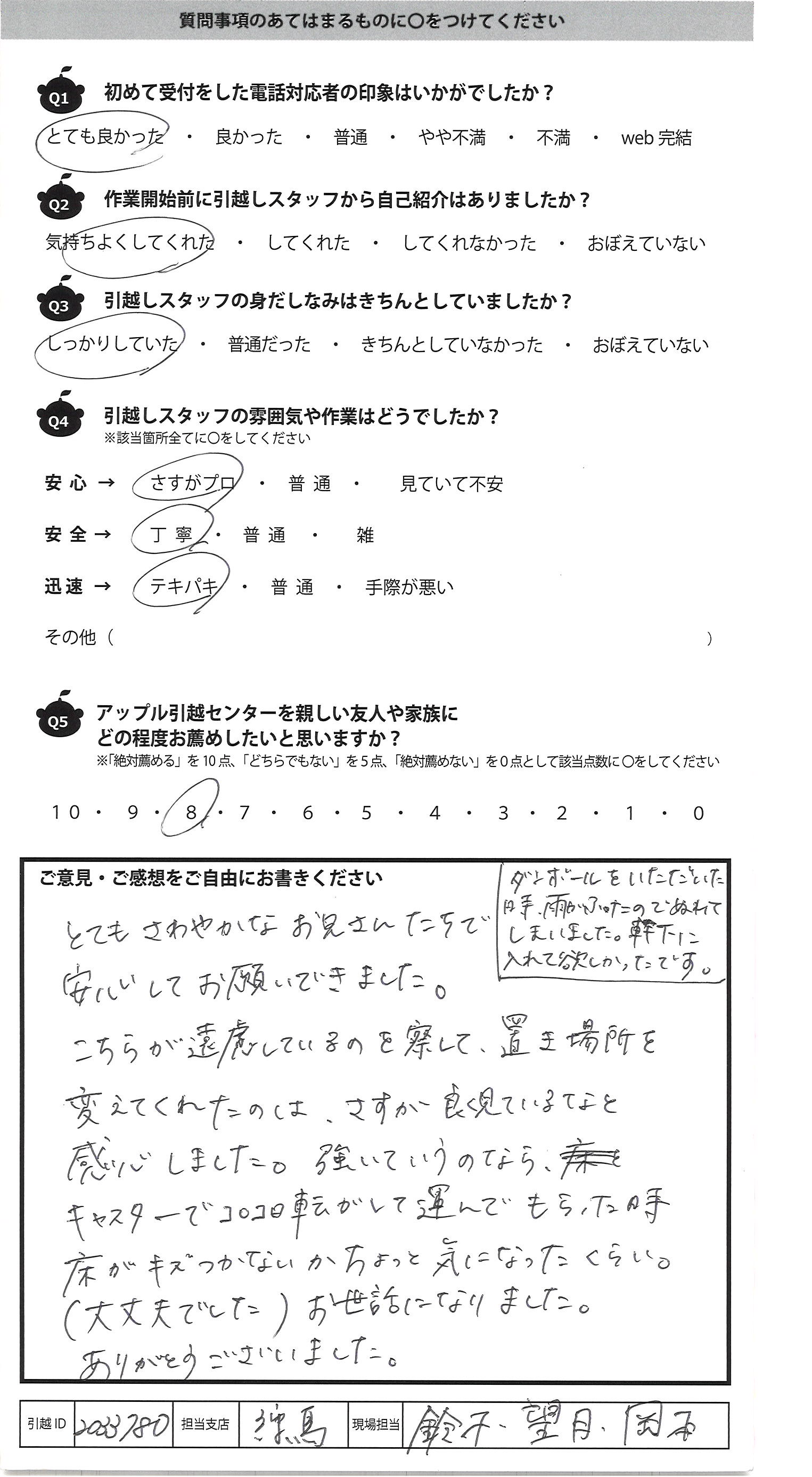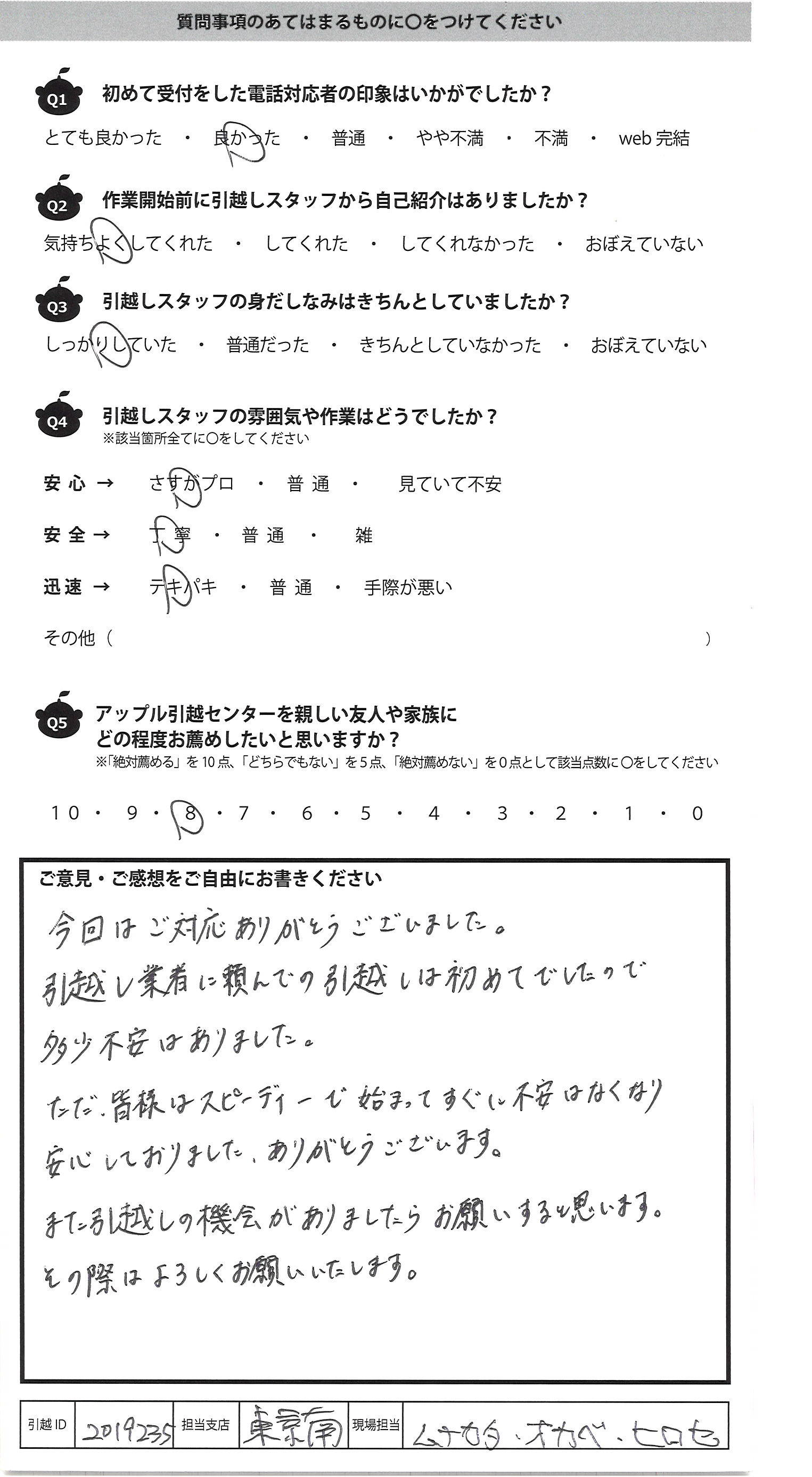 A.今回はご対応ありがとうございました 引越し業者に頼んでの引越しは初めてでしたので 多少不安はありました ただ皆様はスピーディーで始まってすぐに不安はなくなり 安心しておりました。ありがとうございます また引越しの機会がありましたらお願いすると思います その際は宜しくお願い致します