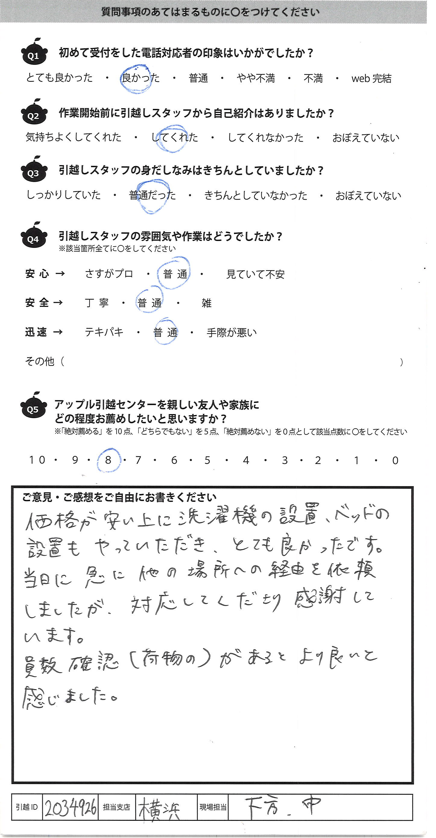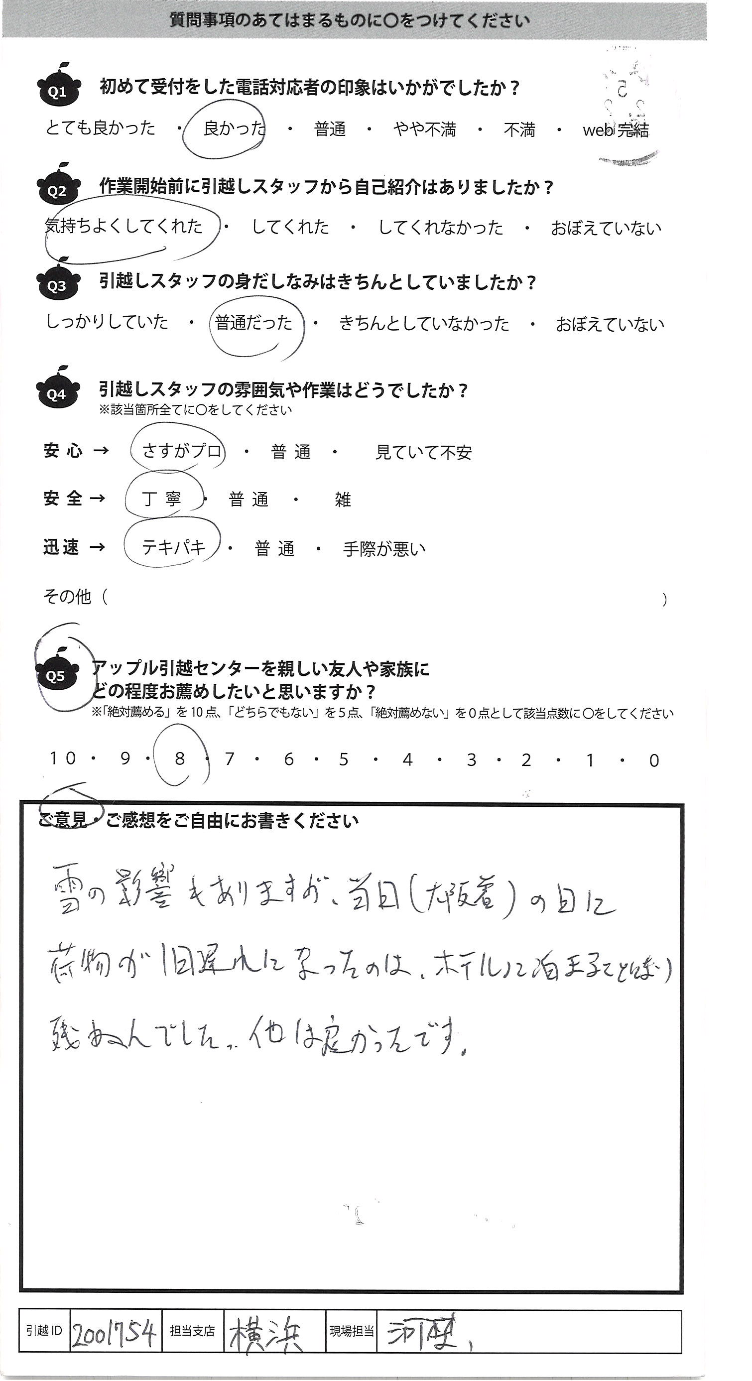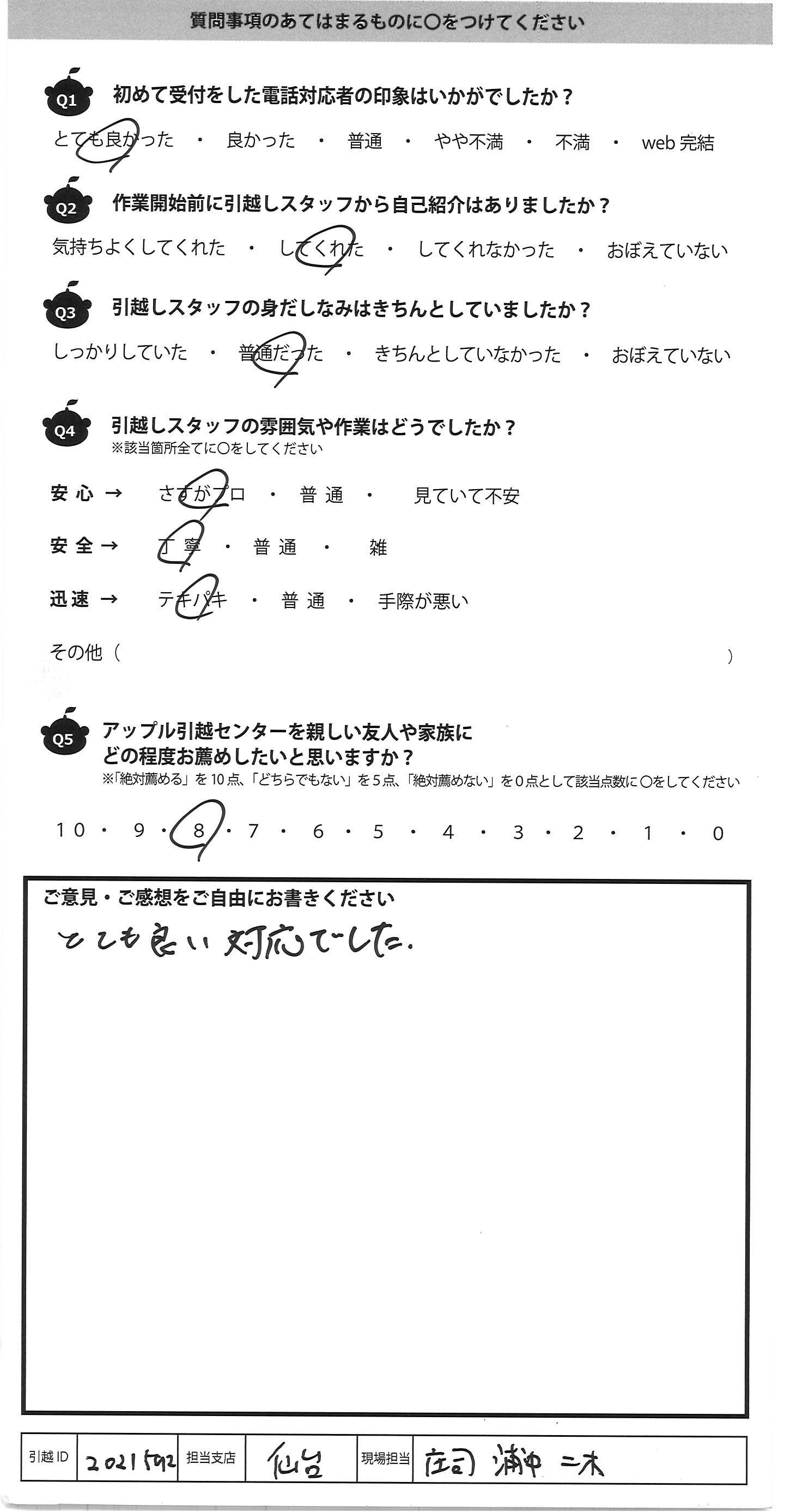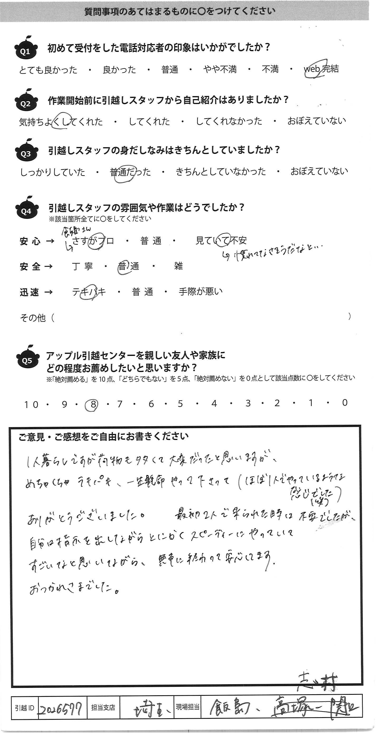 A.今回はご対応ありがとうございました 引越し業者に頼んでの引越しは初めてでしたので 多少不安はありました ただ皆様はスピーディーで始まってすぐに不安はなくなり 安心しておりました。ありがとうございます また引越しの機会がありましたらお願いすると思います その際は宜しくお願い致します