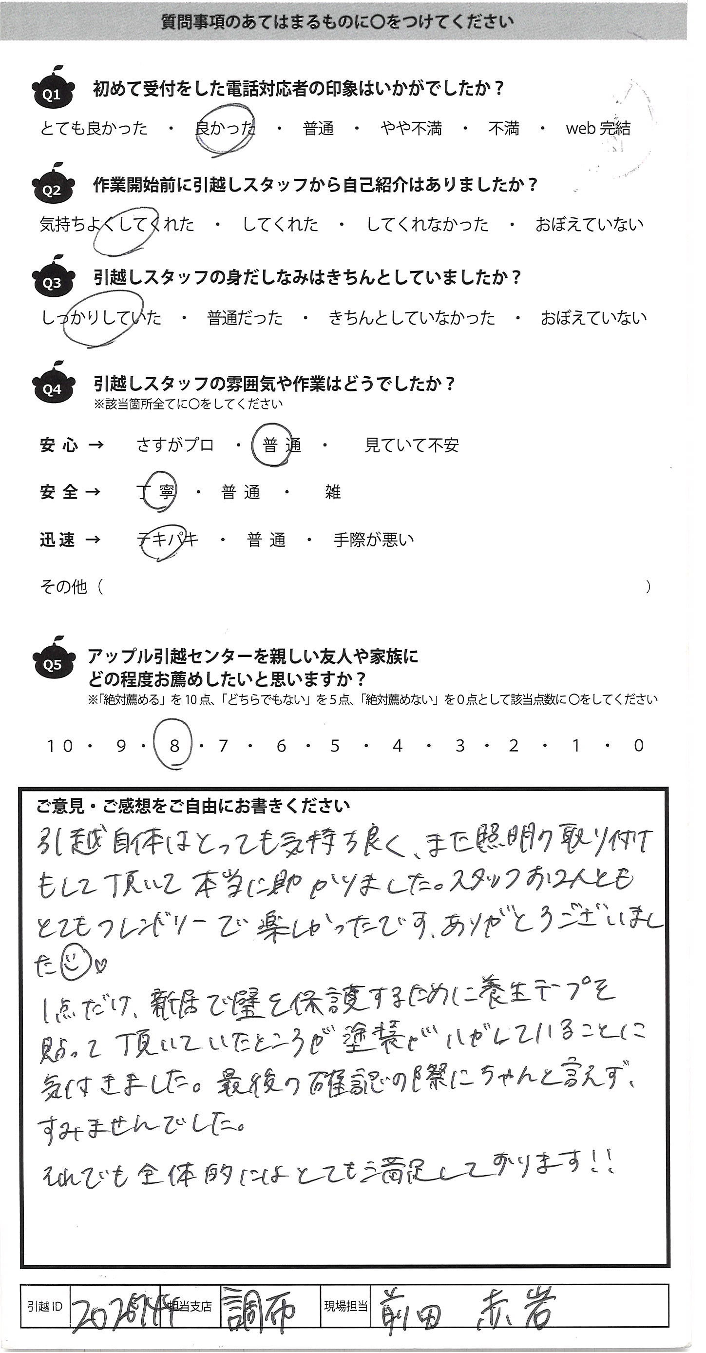 A.引越自体はとっても気持ち良く、また照明の取り付け 模して頂いて本当に助かりました。スタッフお2人とも とてもフレンドリーで楽しかったです。ありがとうございました 1点だけ、頂いて新居で壁を保護するために養生テープを 貼って頂いていたところが塗装がハガれていることに 気づきました。最後の確認の際にちゃんと言えず すみませんでした。 それでも全体的にはとても満足しております