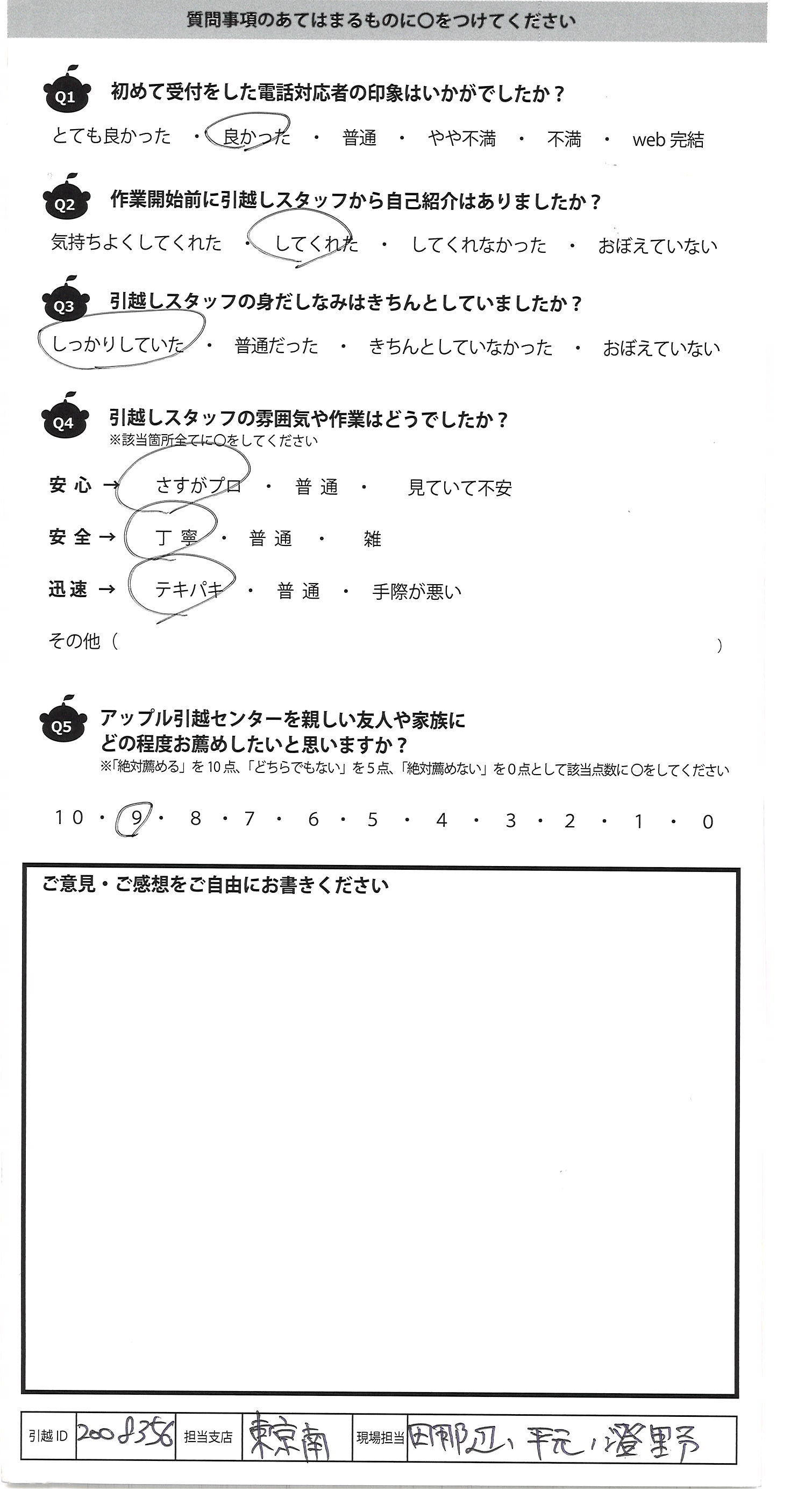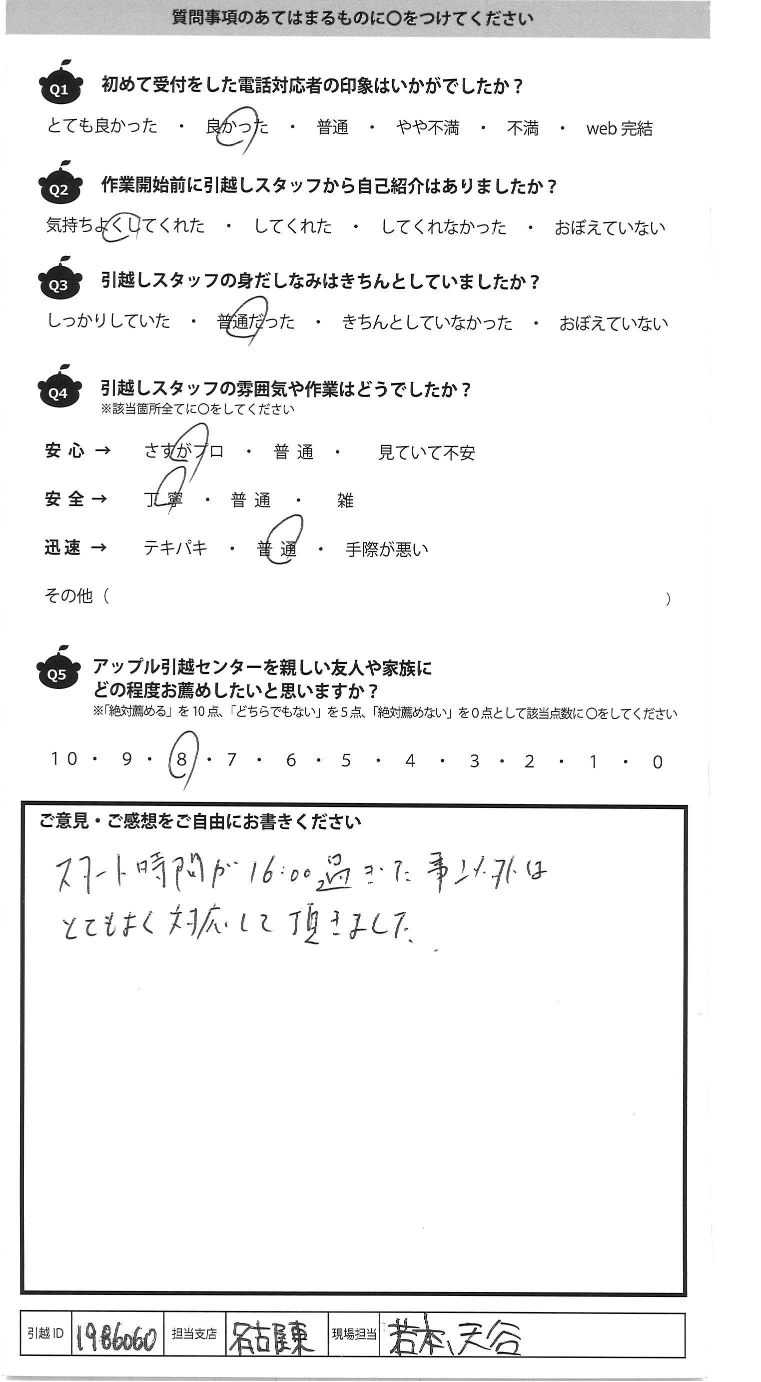 A.引っ越し時間が当初予定から早まり(前の引っ越し案件 が速く終わったとのことで)こちらの荷造りが終わって いなかったのですが、箱詰めを一部手伝っていただき 想定よりもかなり早い時間に引っ越しを終える ことができました 暗くなる前に終えたほうがよいと気を遣っていただき また準備で疲弊していたらこちらに対し、テキパキと サポート下さり、大変ありがたかったです