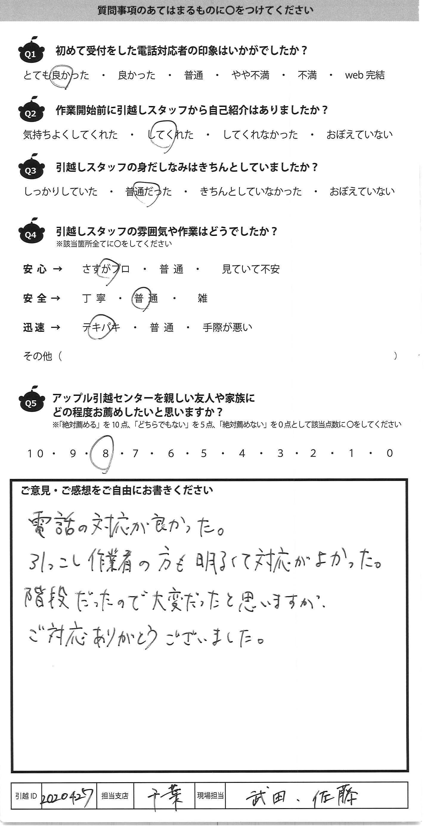 A.電話の対応が良かった 引っこし作業着の方も明るくて対応がよかった 階段だったので、大変だったと思いますが ご対応ありがとうございました