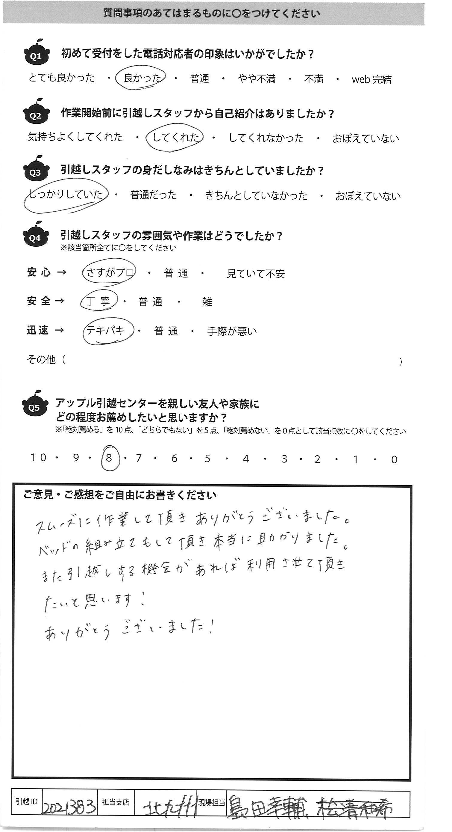 A.スムーズに作業して頂きありがとうございました ベッドの組み立てもして頂き、本当に助かりました また引越しする機会があれば利用させて頂き たいと思います! ありがとうございました!