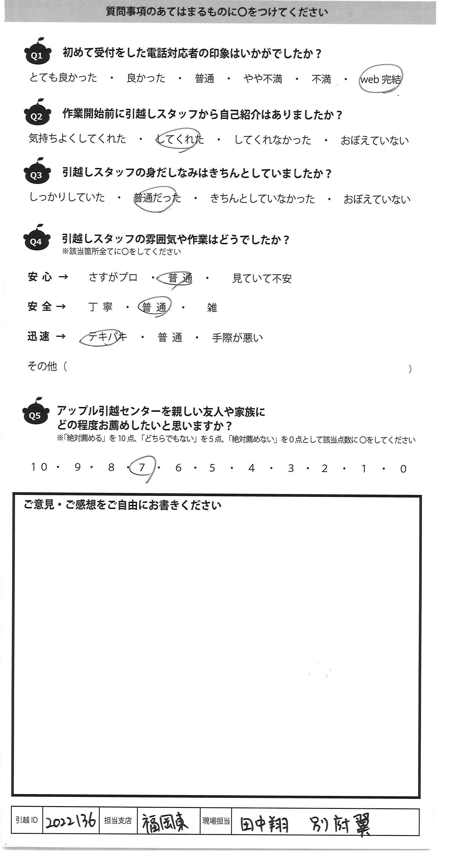 A.WEBで完結できるので、仕事の合間に諸々の チェックができて便利でした チャットで問い合わせもできるので、梱包の 仕方など分からないところも気軽に聞けました 当日もテキパキとしつつ丁寧に作業して いただけて助かりました ありがとうございました