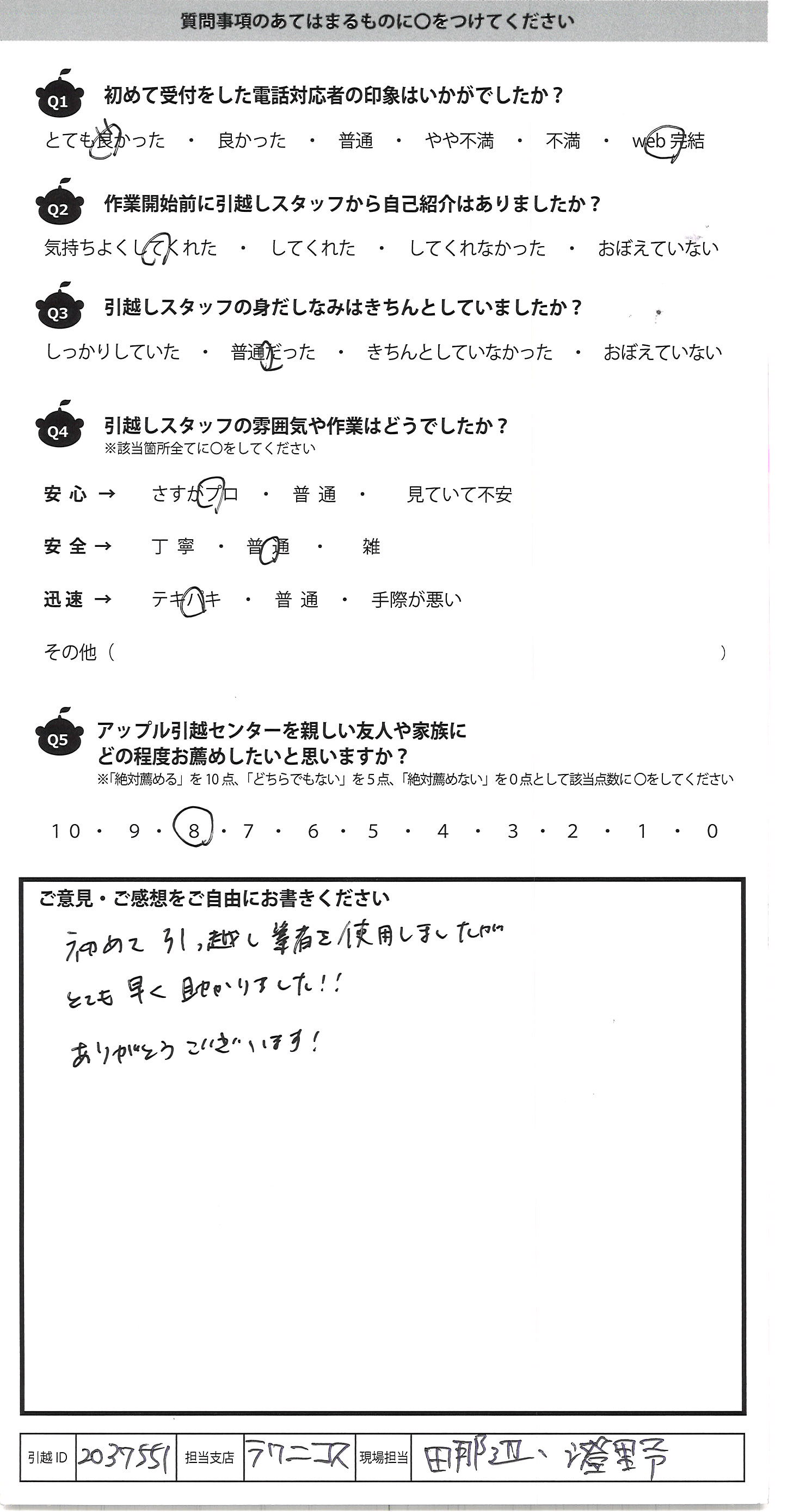 A.初めて引っ越し業者使用しましたが とても早く助かりました!! ありがとうございます!