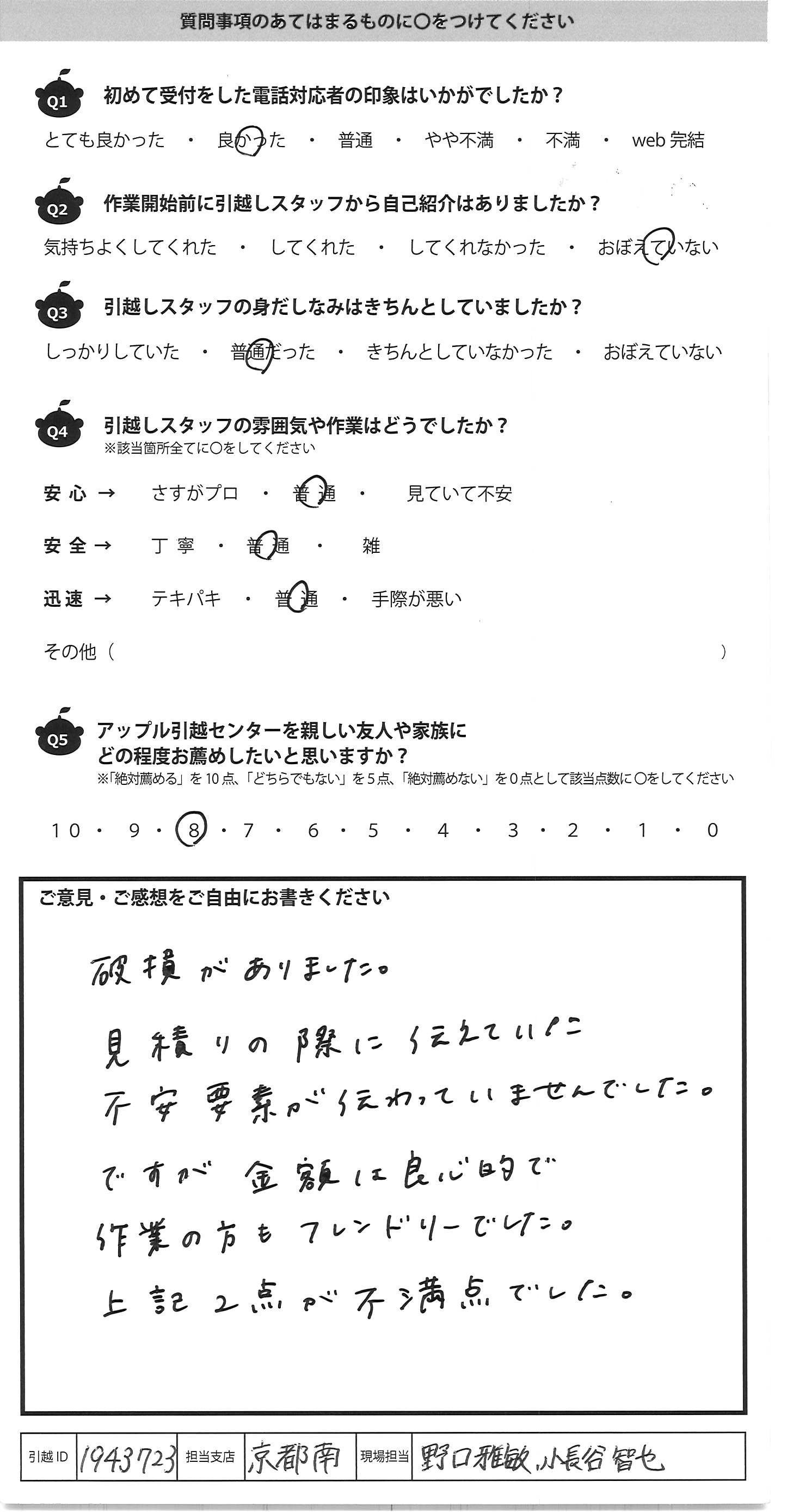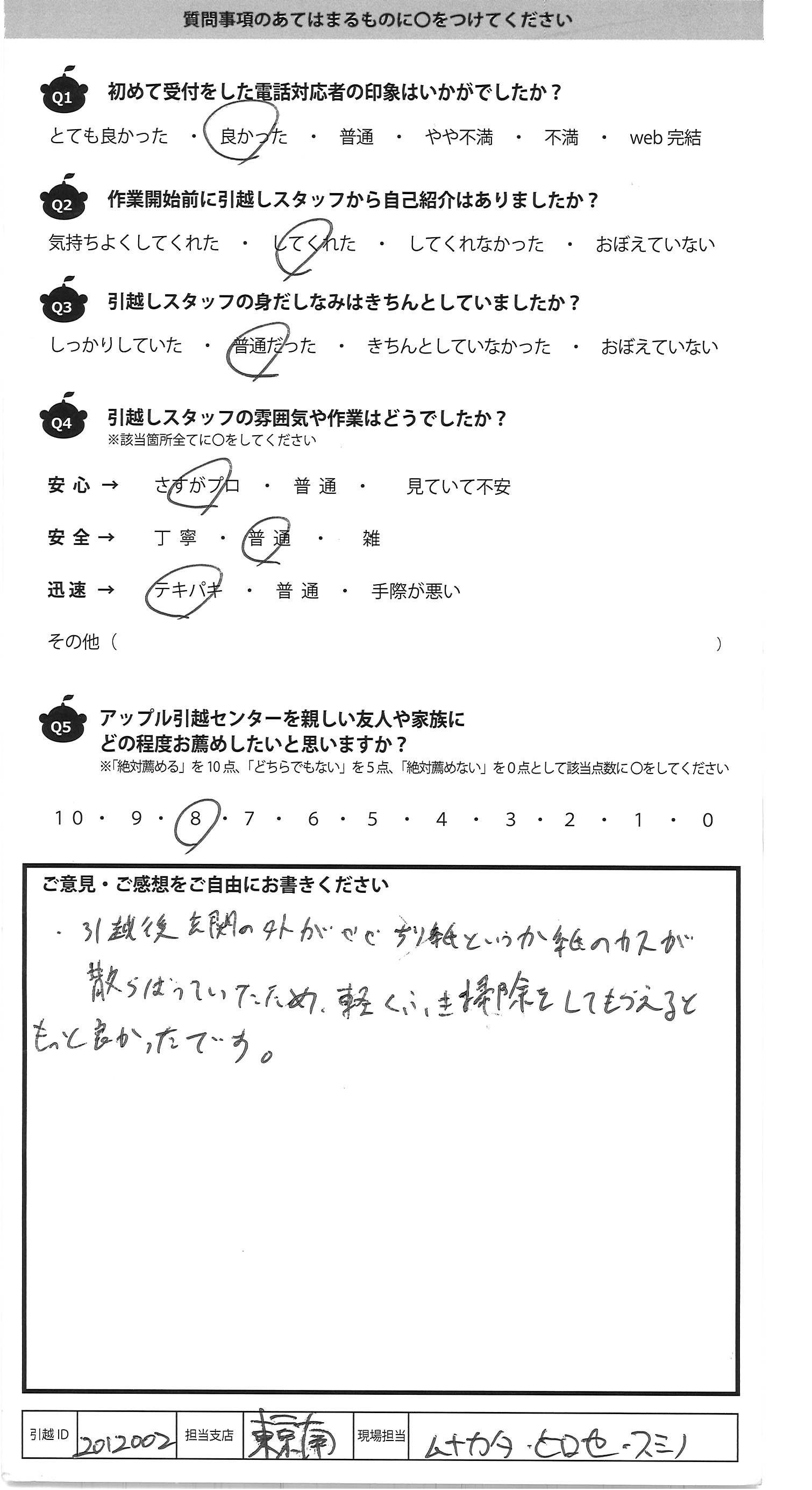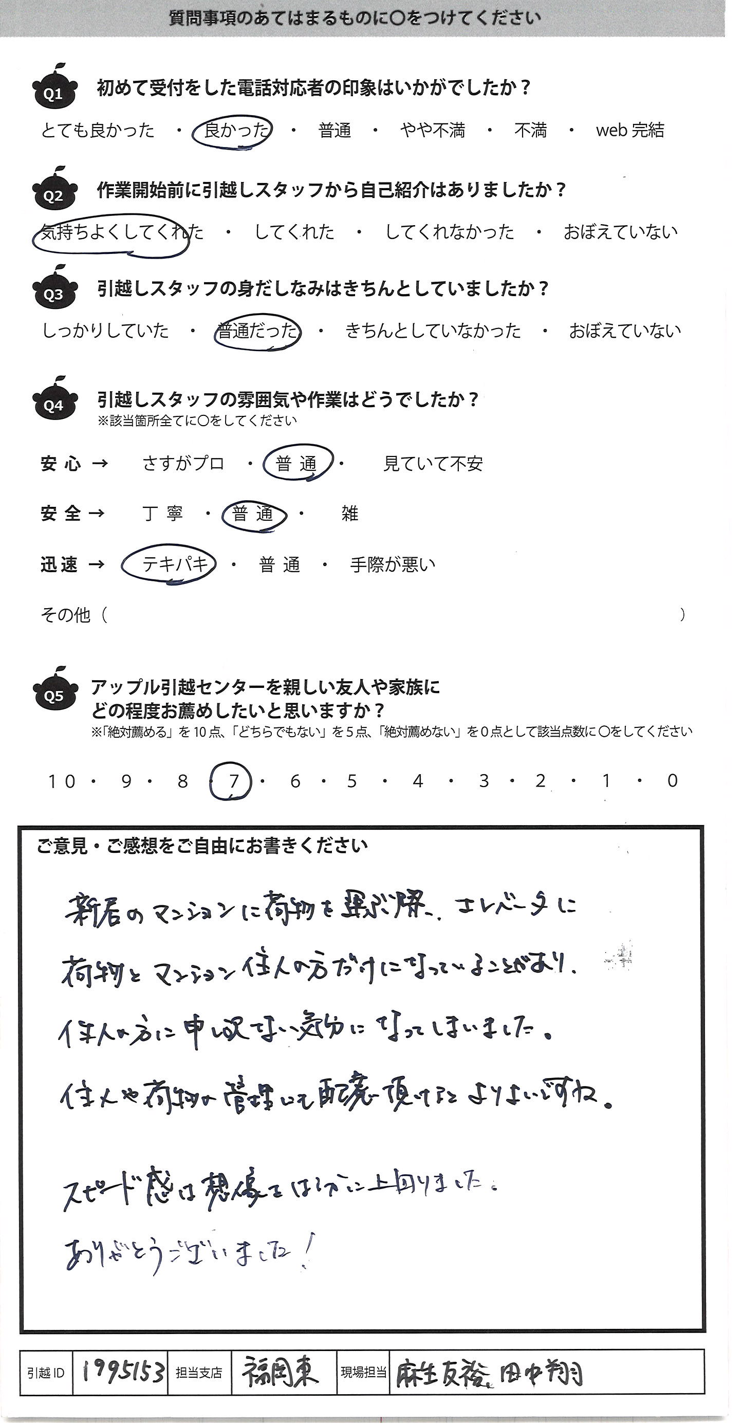 A.新居のマンションに荷物を運ぶ際、エレベータに 荷物とマンション住民の方だけになっていることがあり、 住民の方に申し訳ない気分になってしまいました 住人や荷物が管理にも配慮頂けるとよりよいですね スピード感は想像はるかに上回りました ありがとうございました!