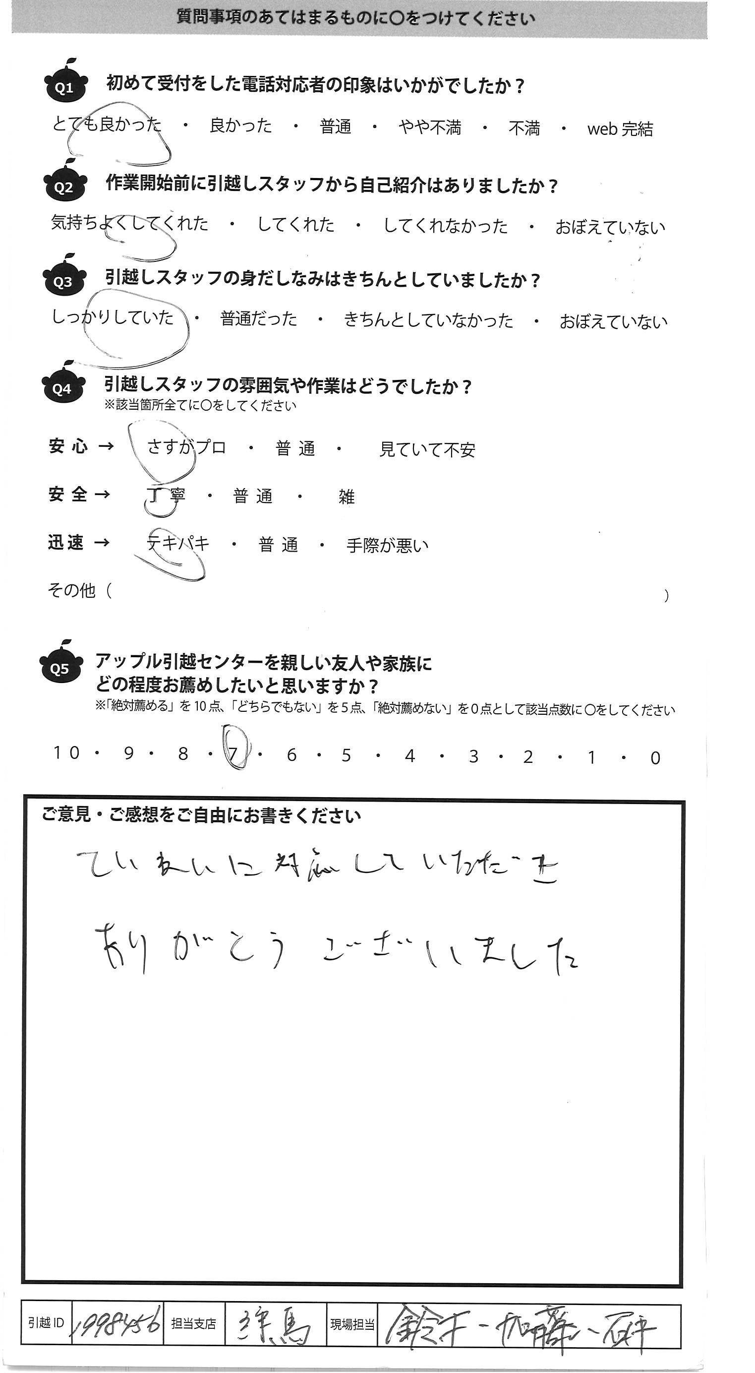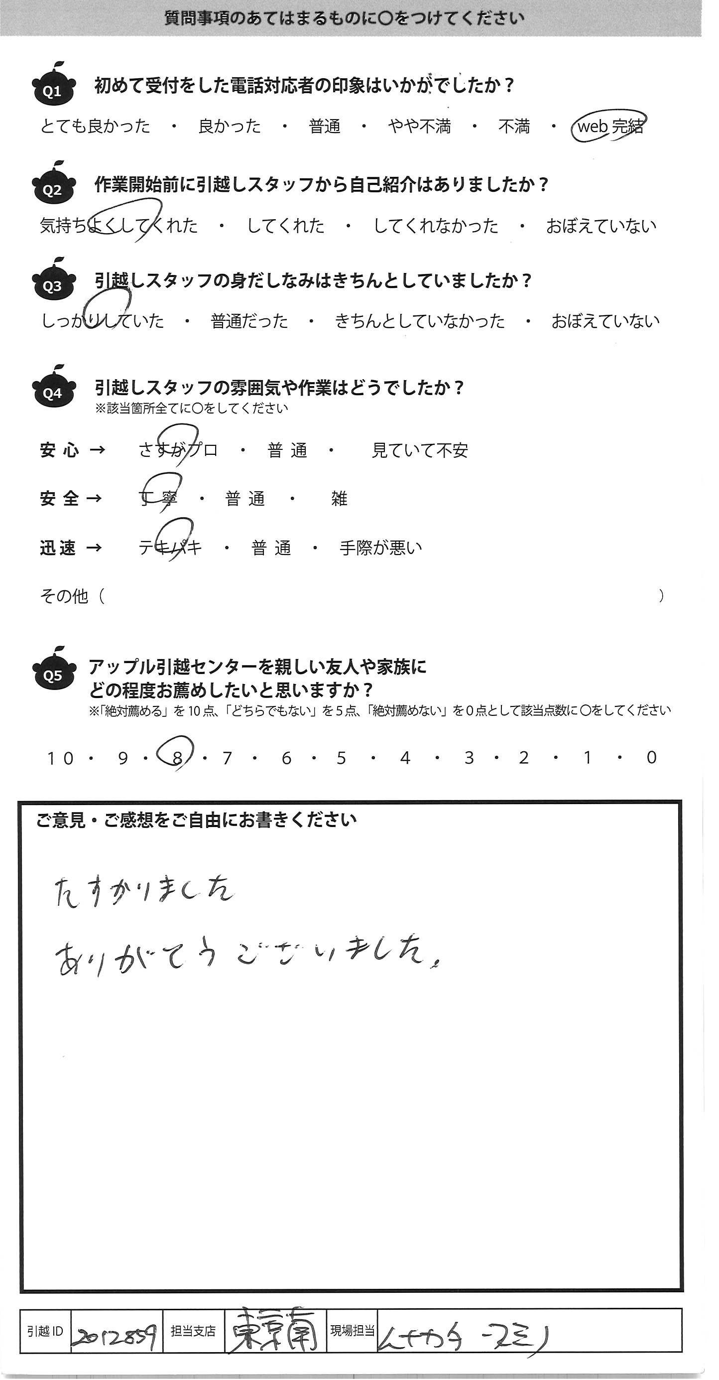 A.とても気さくで感じのよいスタッフさんが 対応してくださいました 引っこしは数年に1回あるかないかで不安が 大きい中、丁寧な対応で安心して お任せできました 今回で2回目の利用でしたが また次回もお願いしたいと思います これからもお仕事がんばってください 見積もりや 予約がネットで 完結できるのが 本当に便利でした