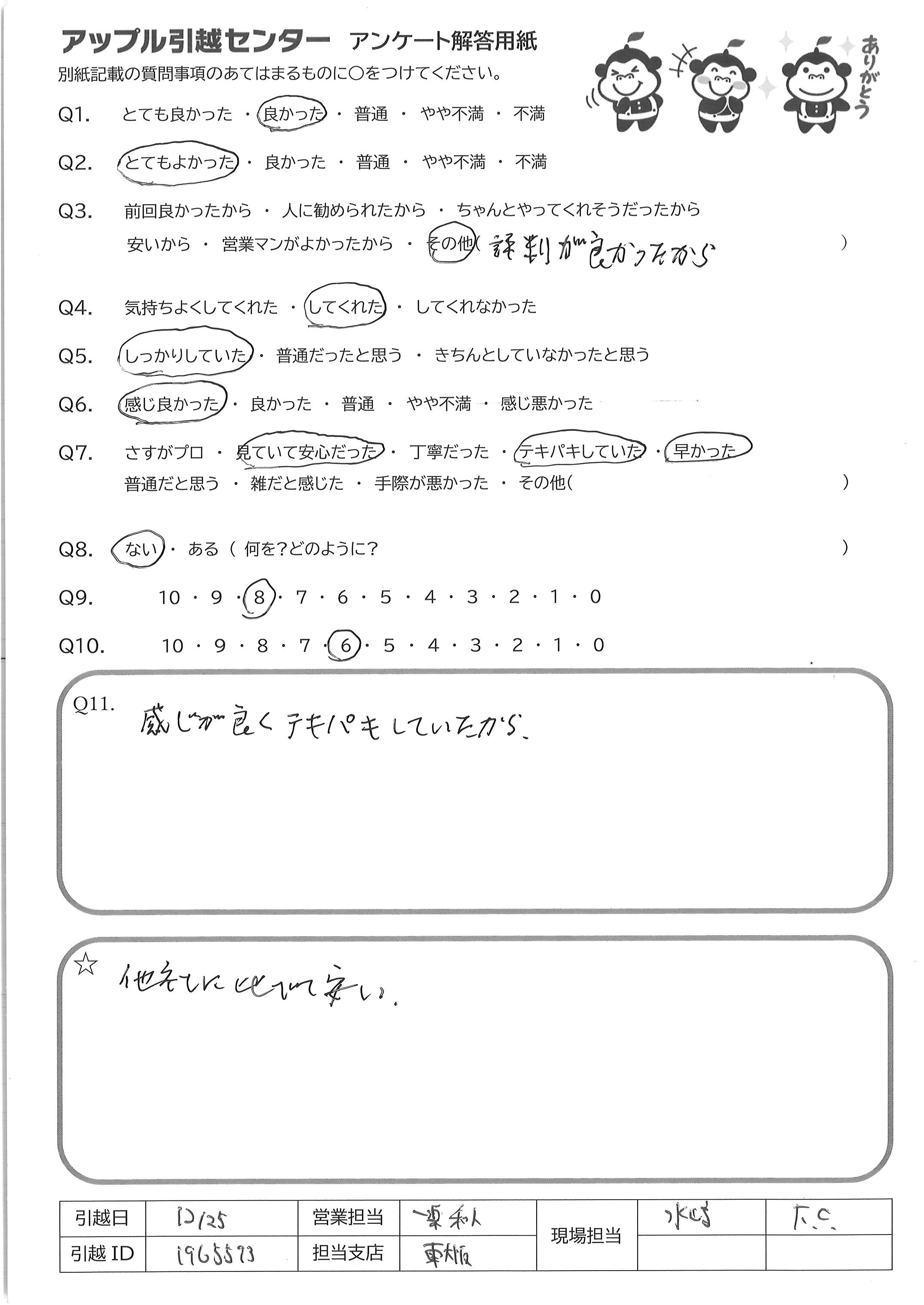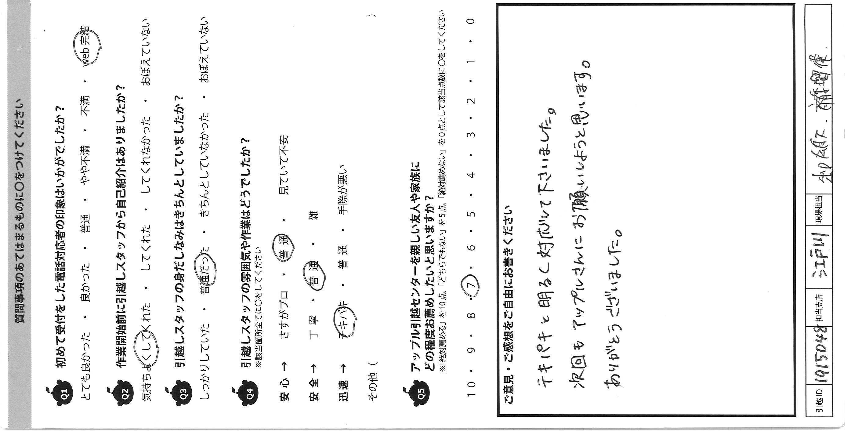 A.テキパキと明るく対応してくださいました 次回もアップルさんにお願いしようと思います ありがとうございました
