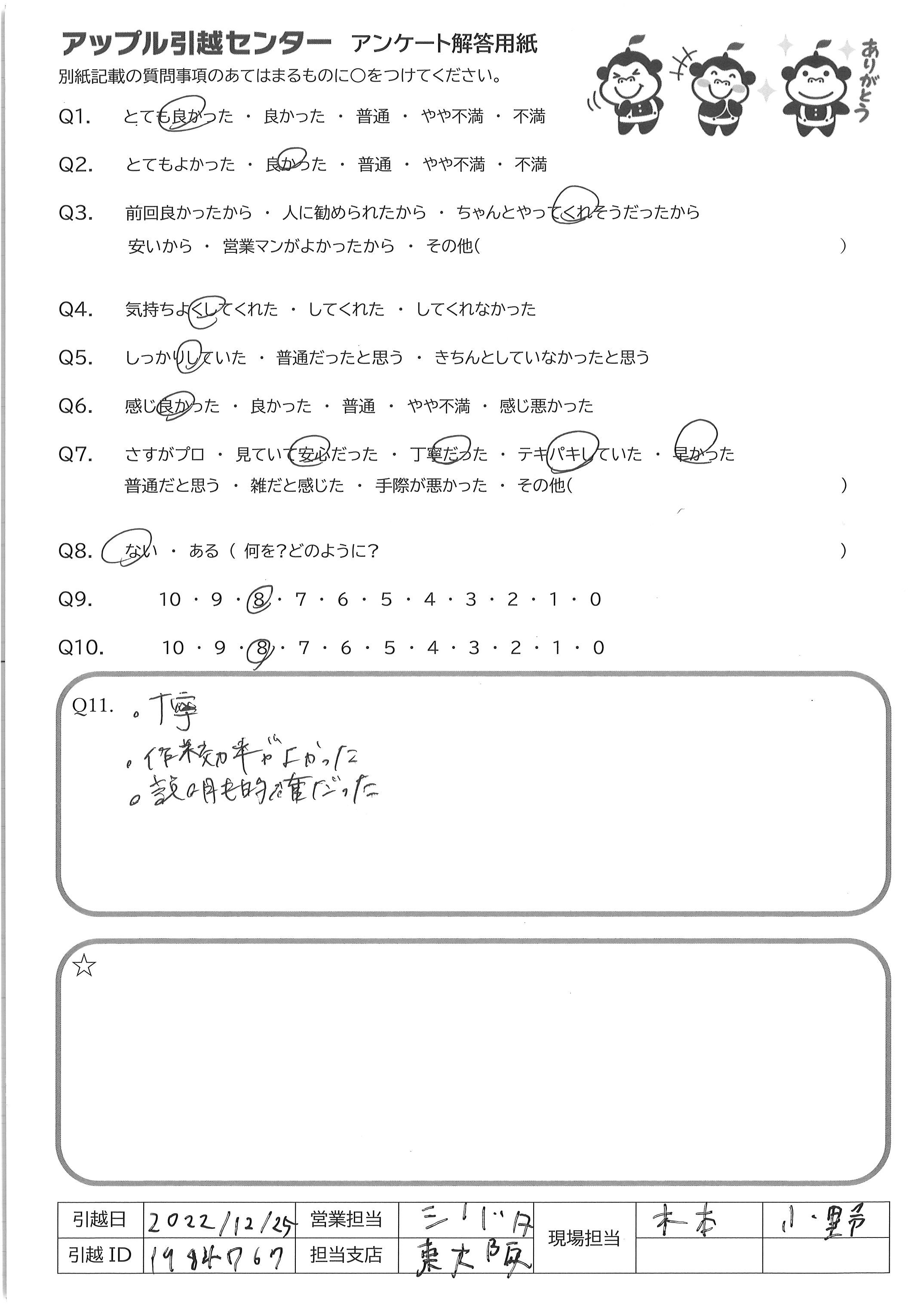 引越し日:2022年12月25日 エリア:大阪府大阪市東成区