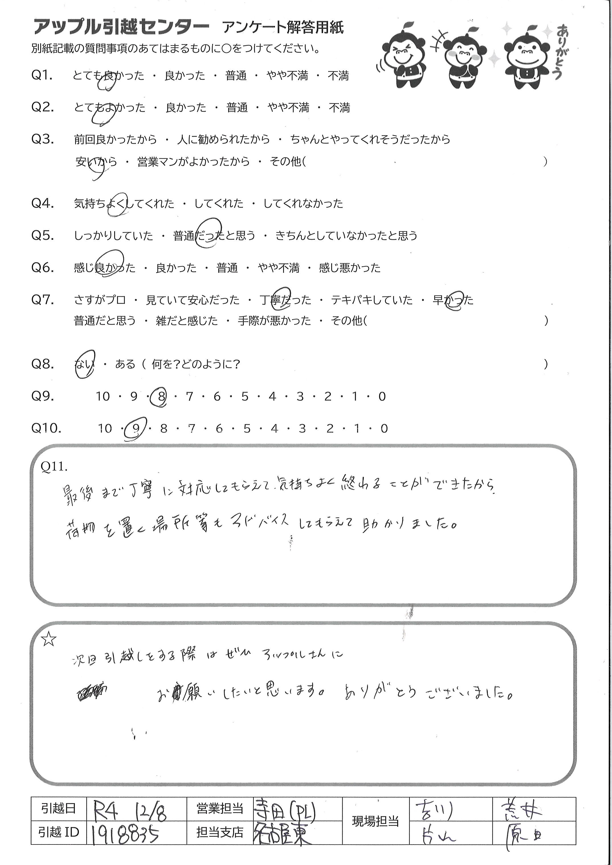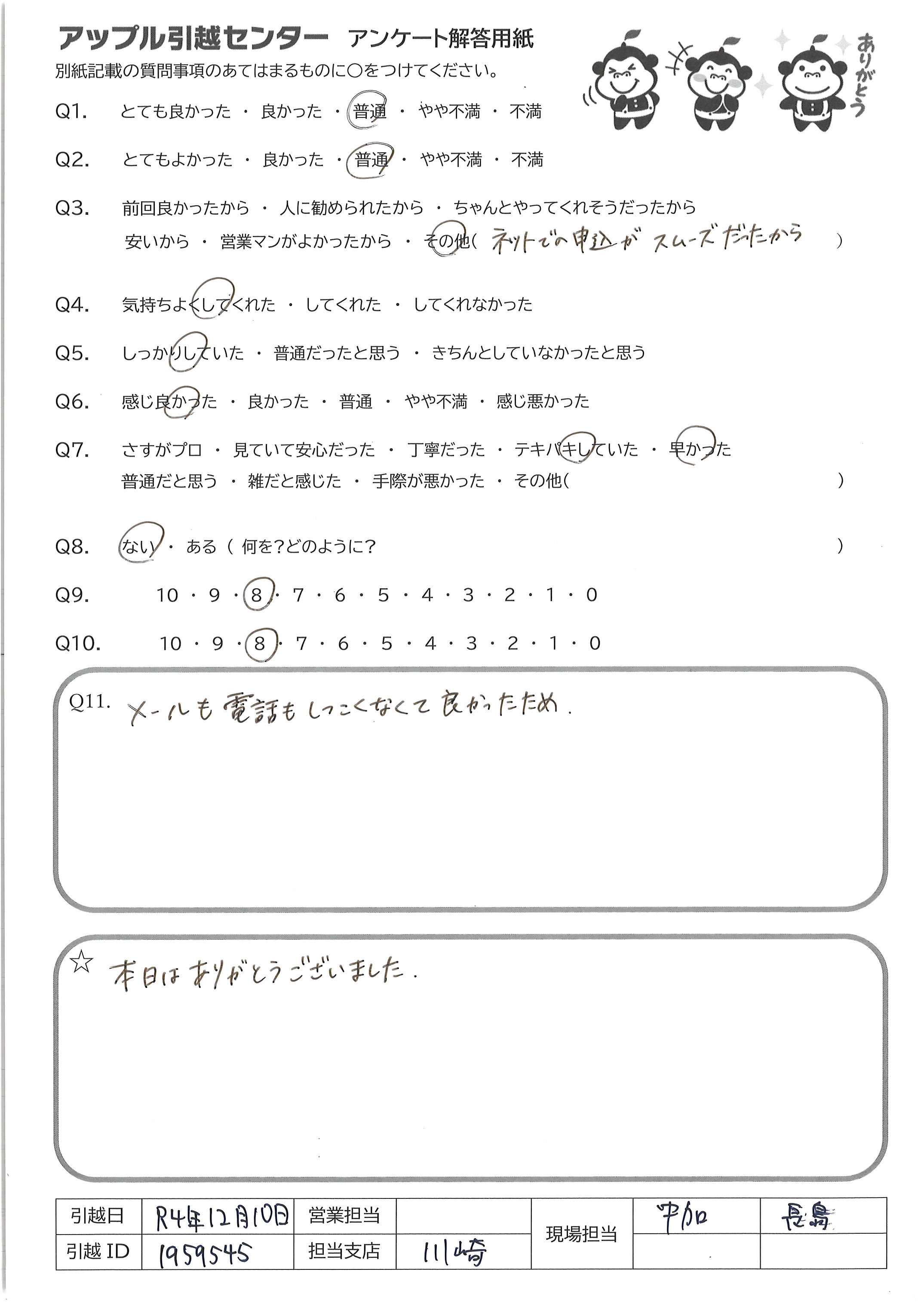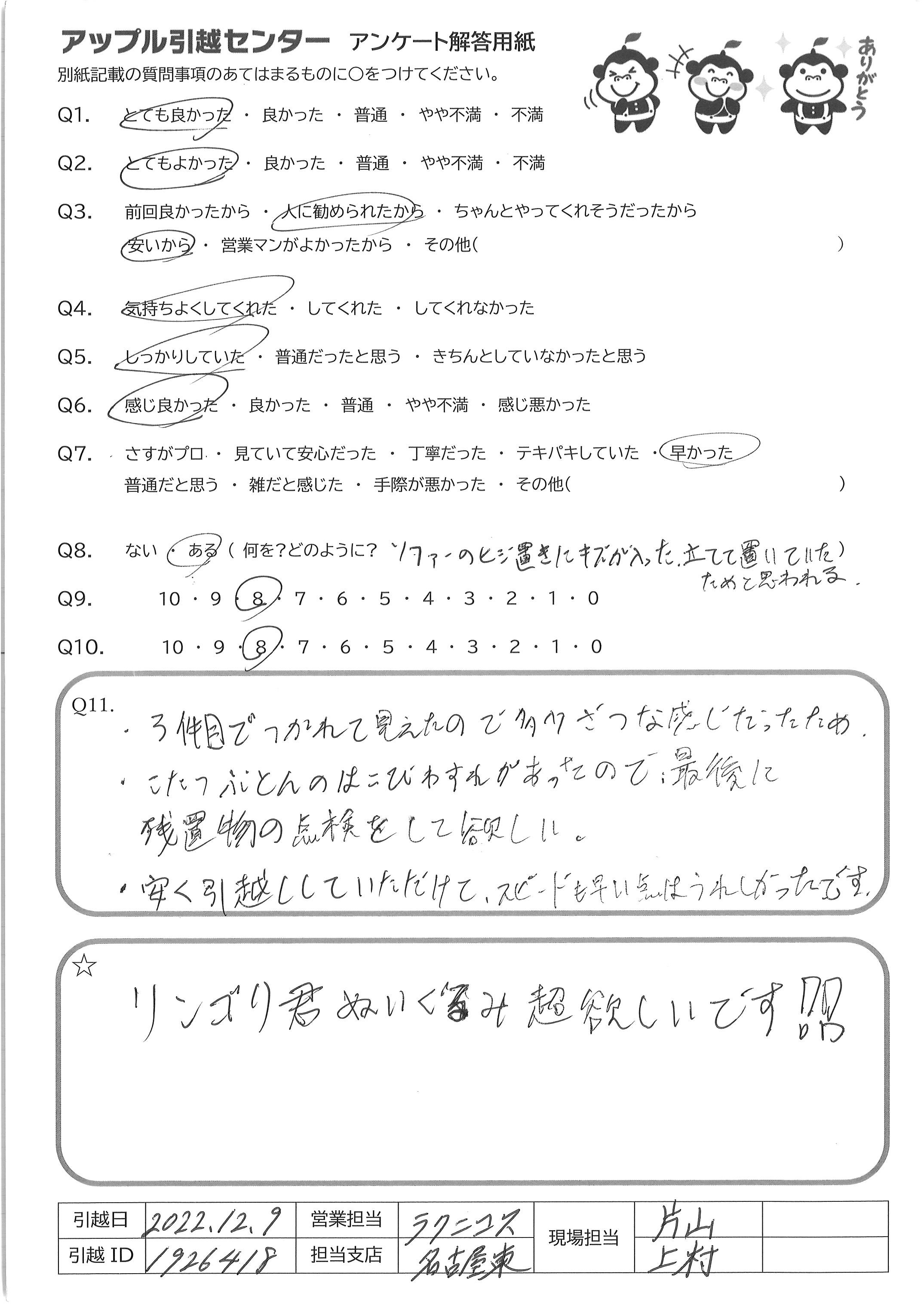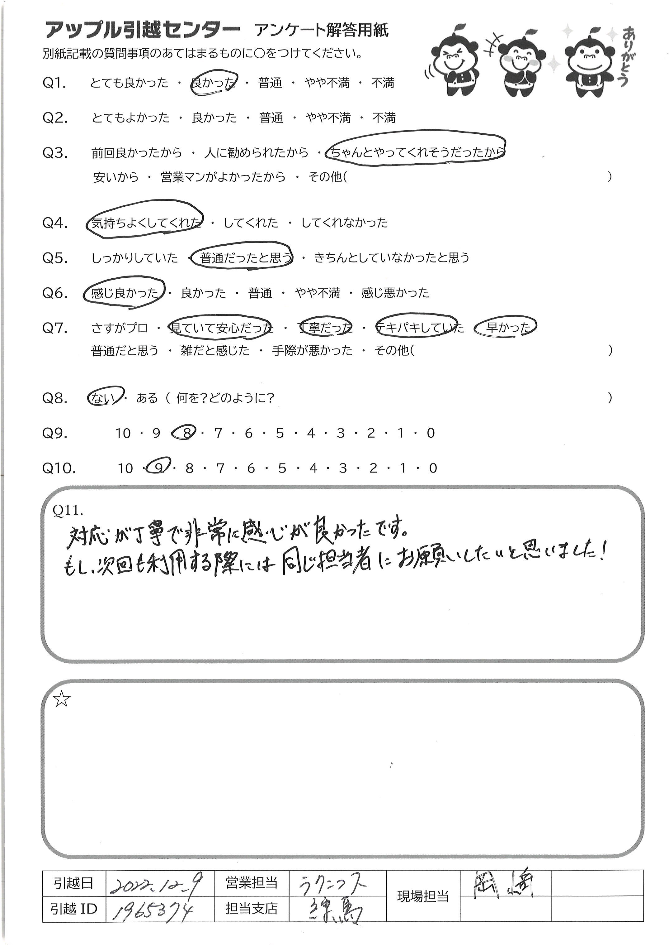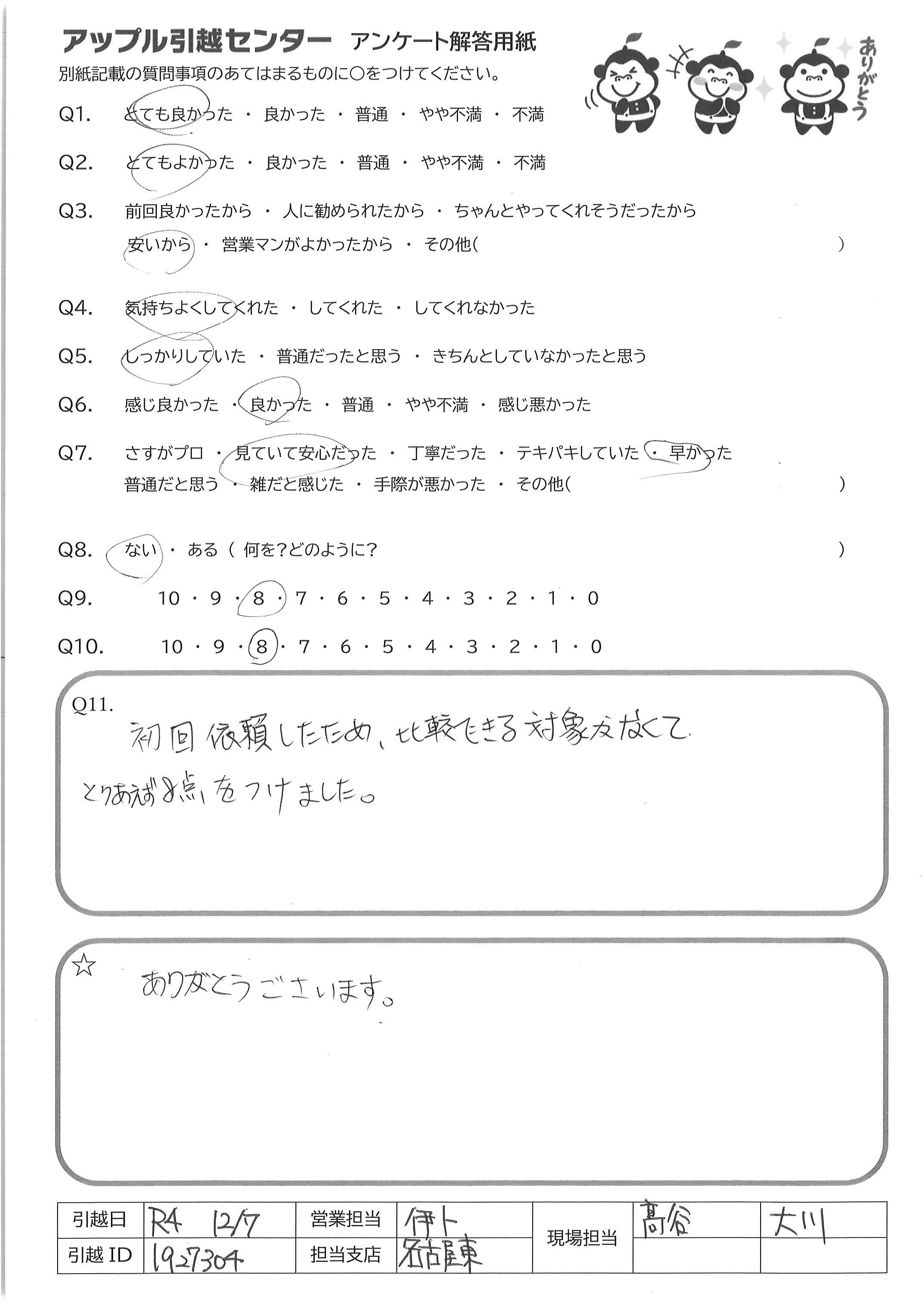 A.次回引越しをする際は、ぜひ、アップルさんに おねがいしたいと思います。ありがとうございました