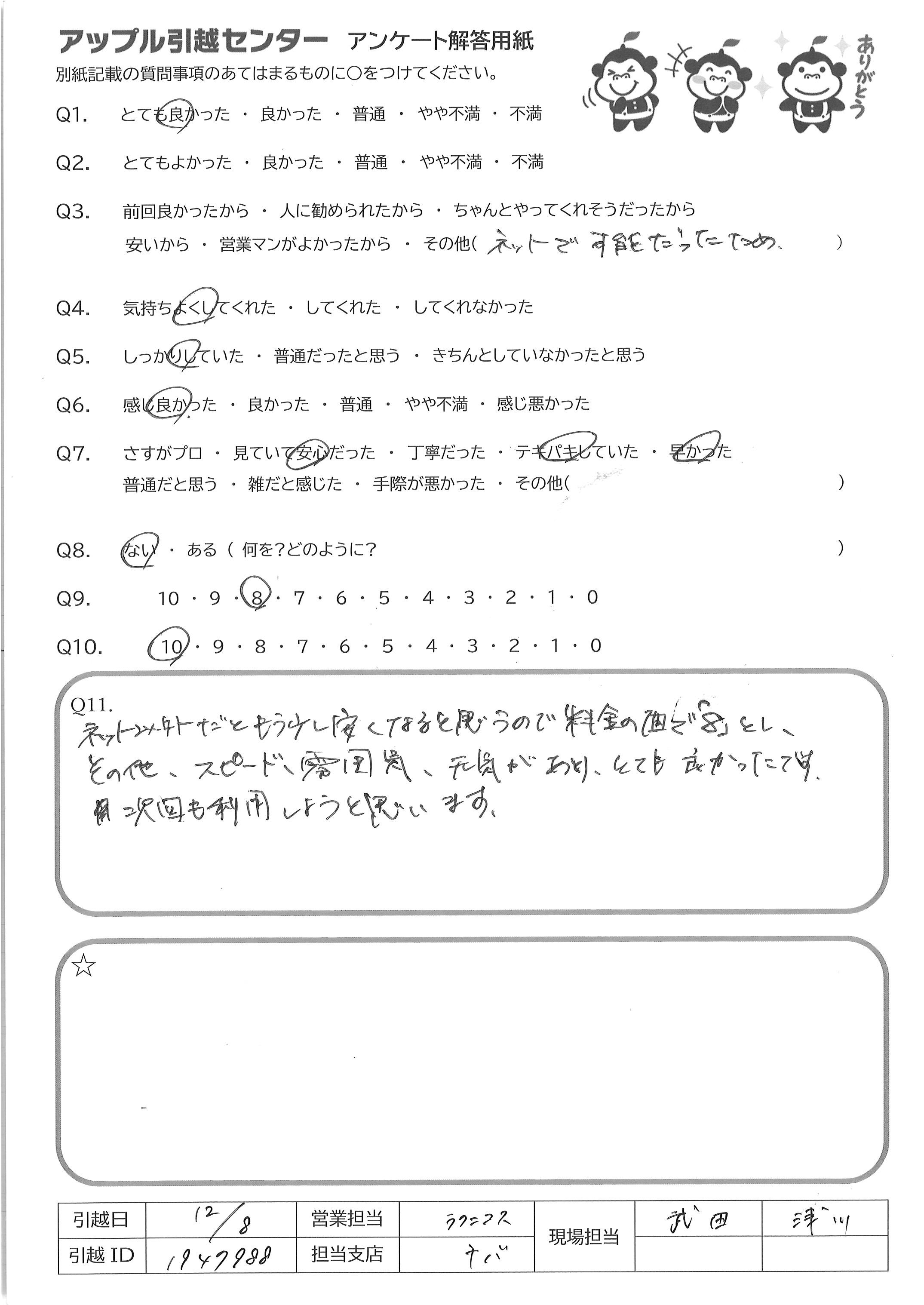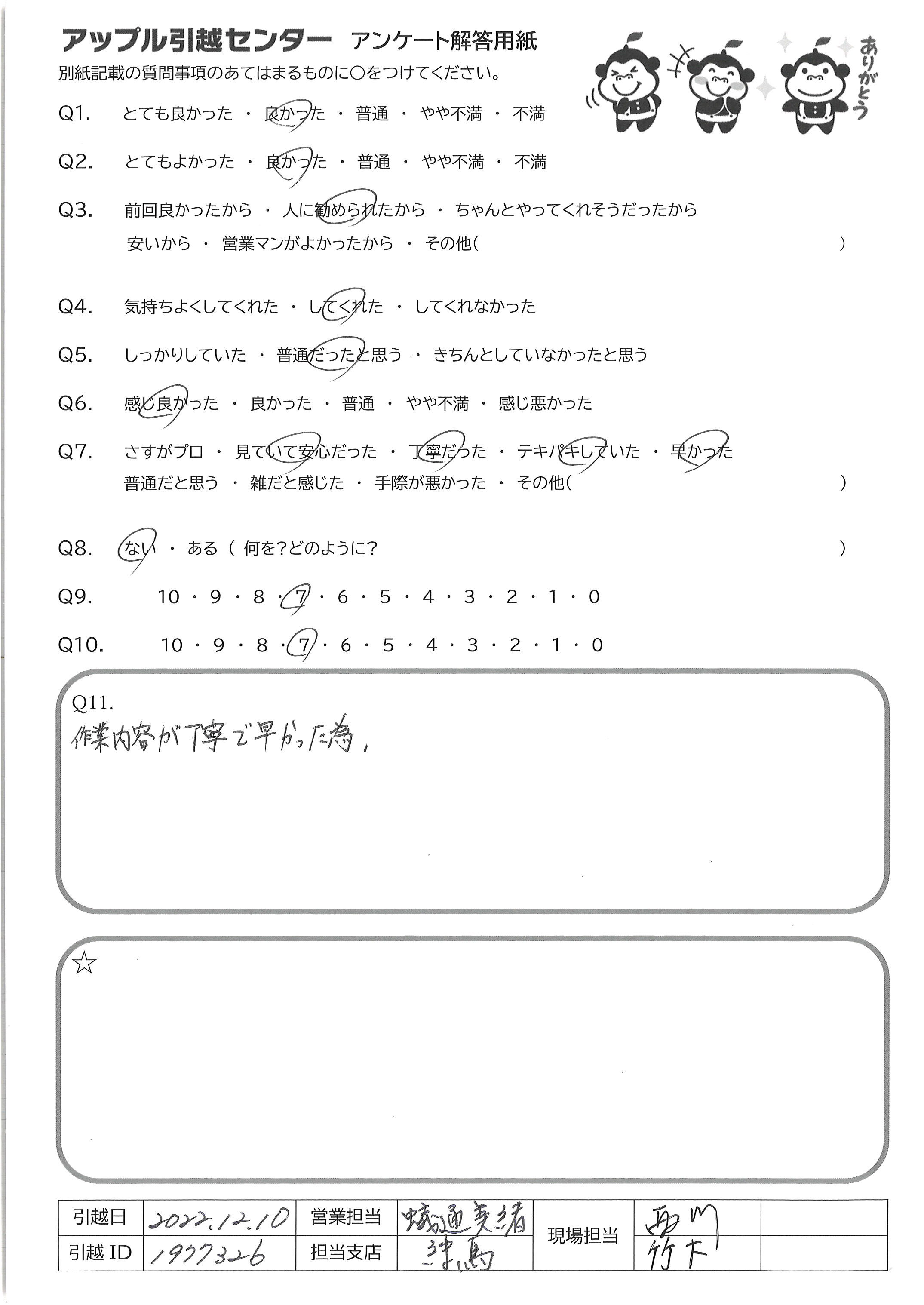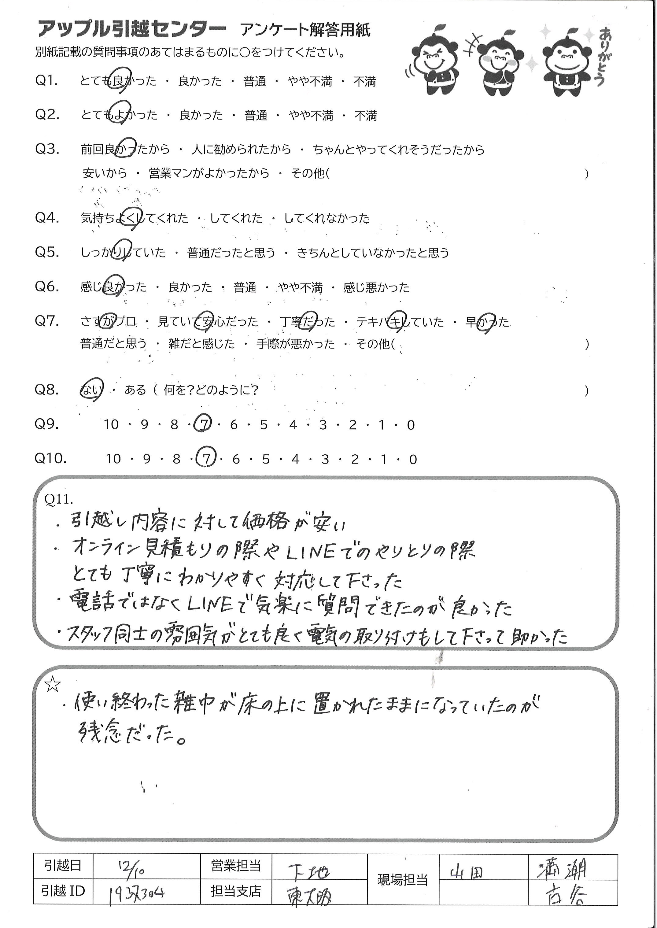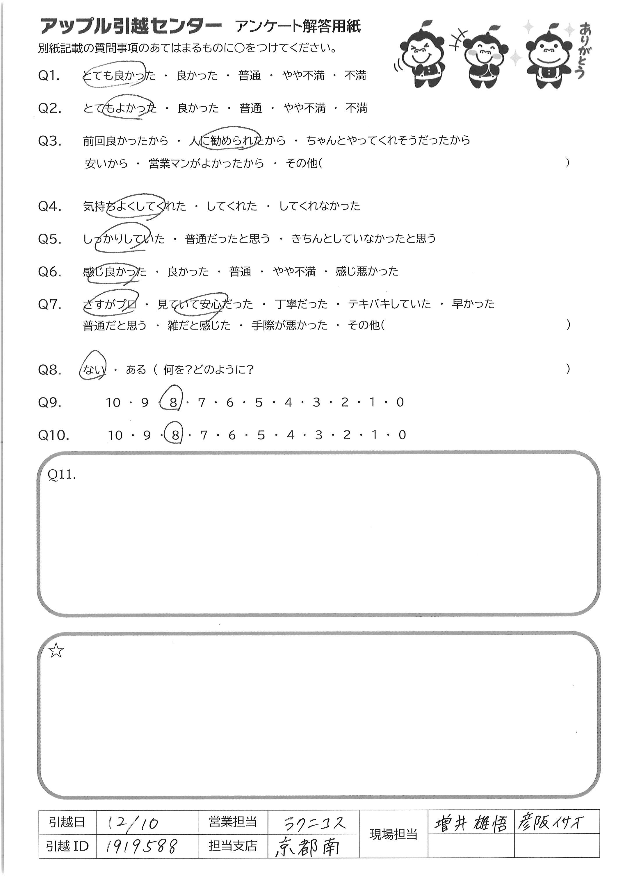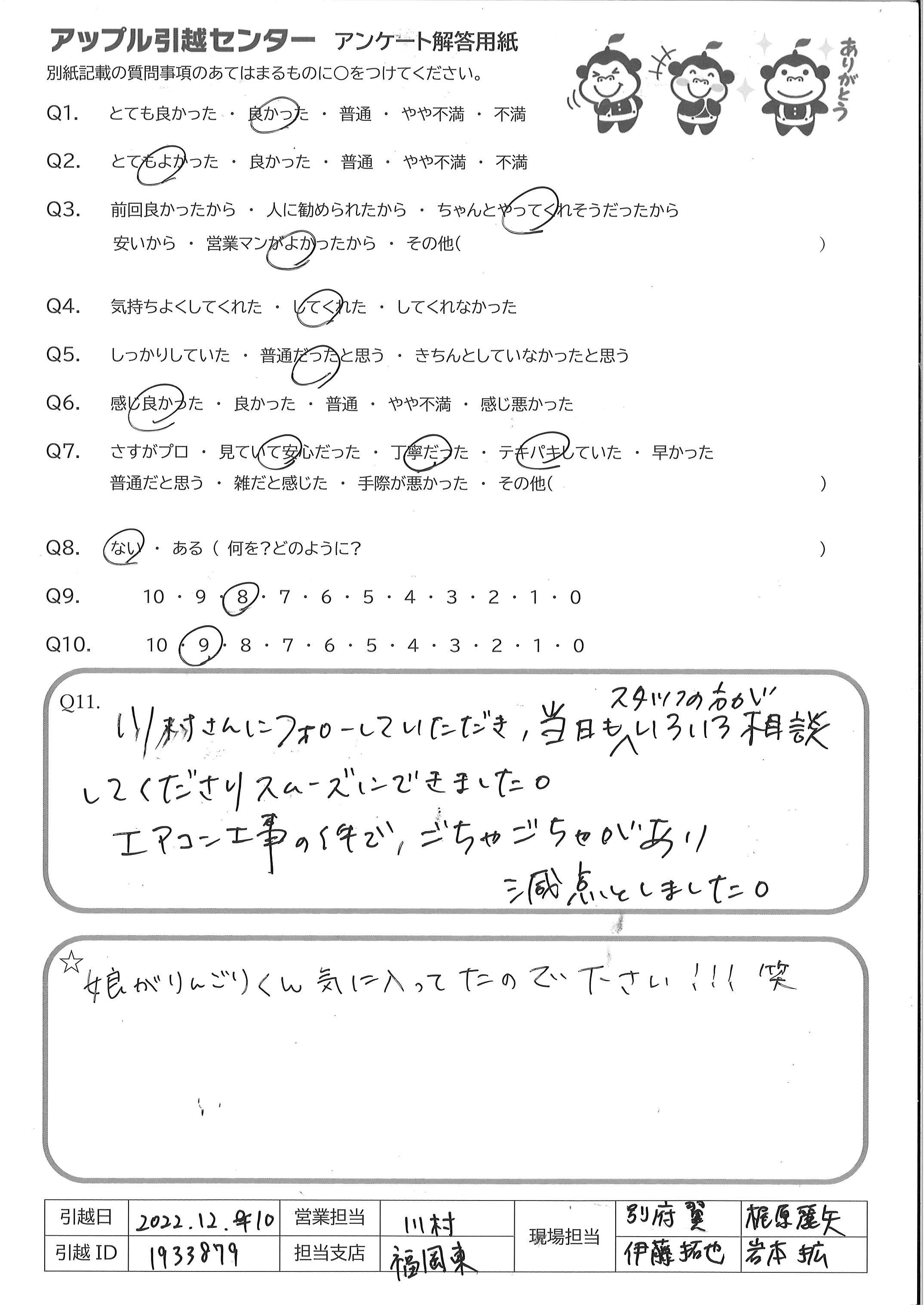 A.次回引越しをする際は、ぜひ、アップルさんに おねがいしたいと思います。ありがとうございました