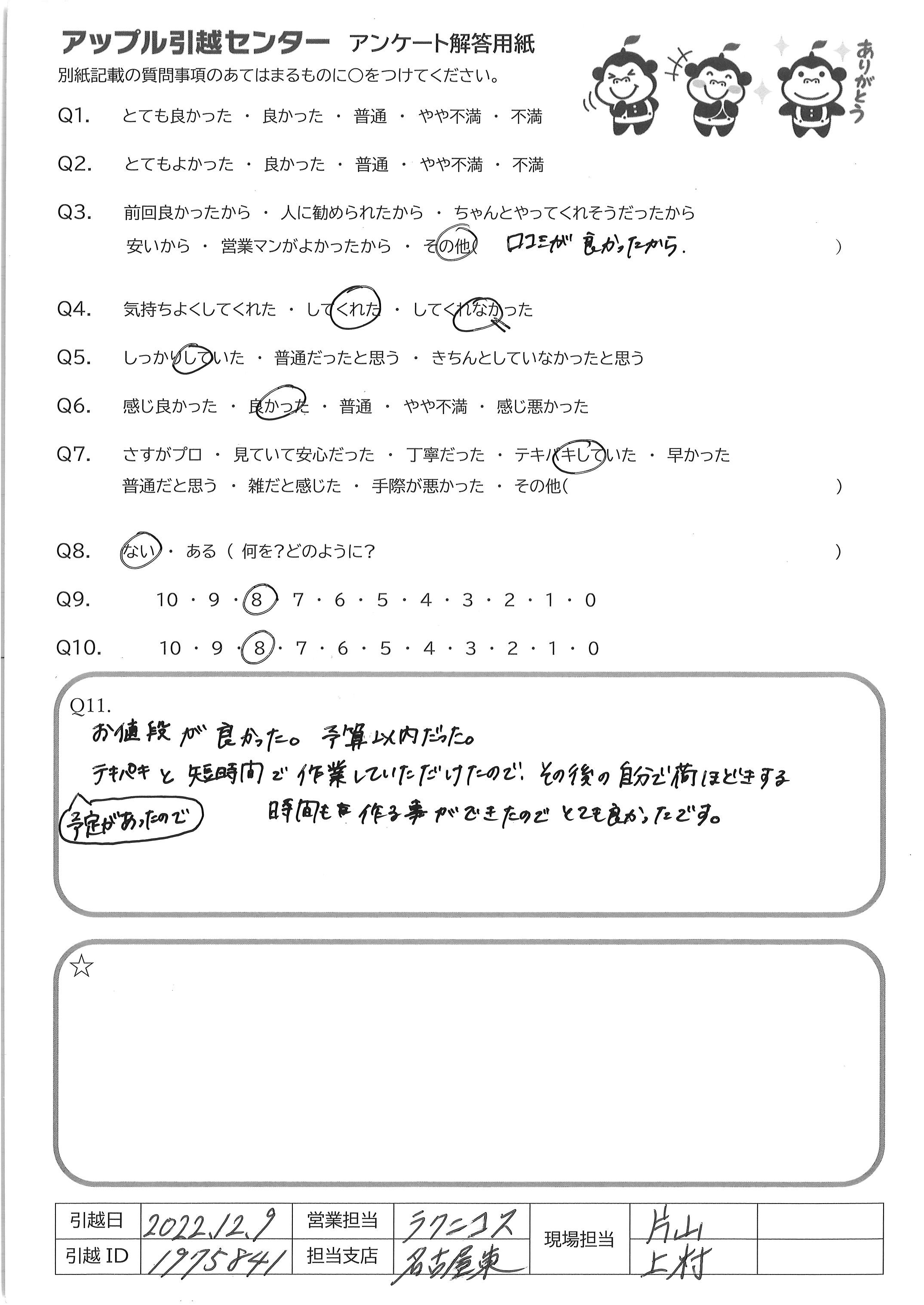 A.お値段が良かった。予算いないだった テキパキと短時間で作業していただけたので、その後の自分で荷ほどきする 時間も作る事ができたので、とても良かったです