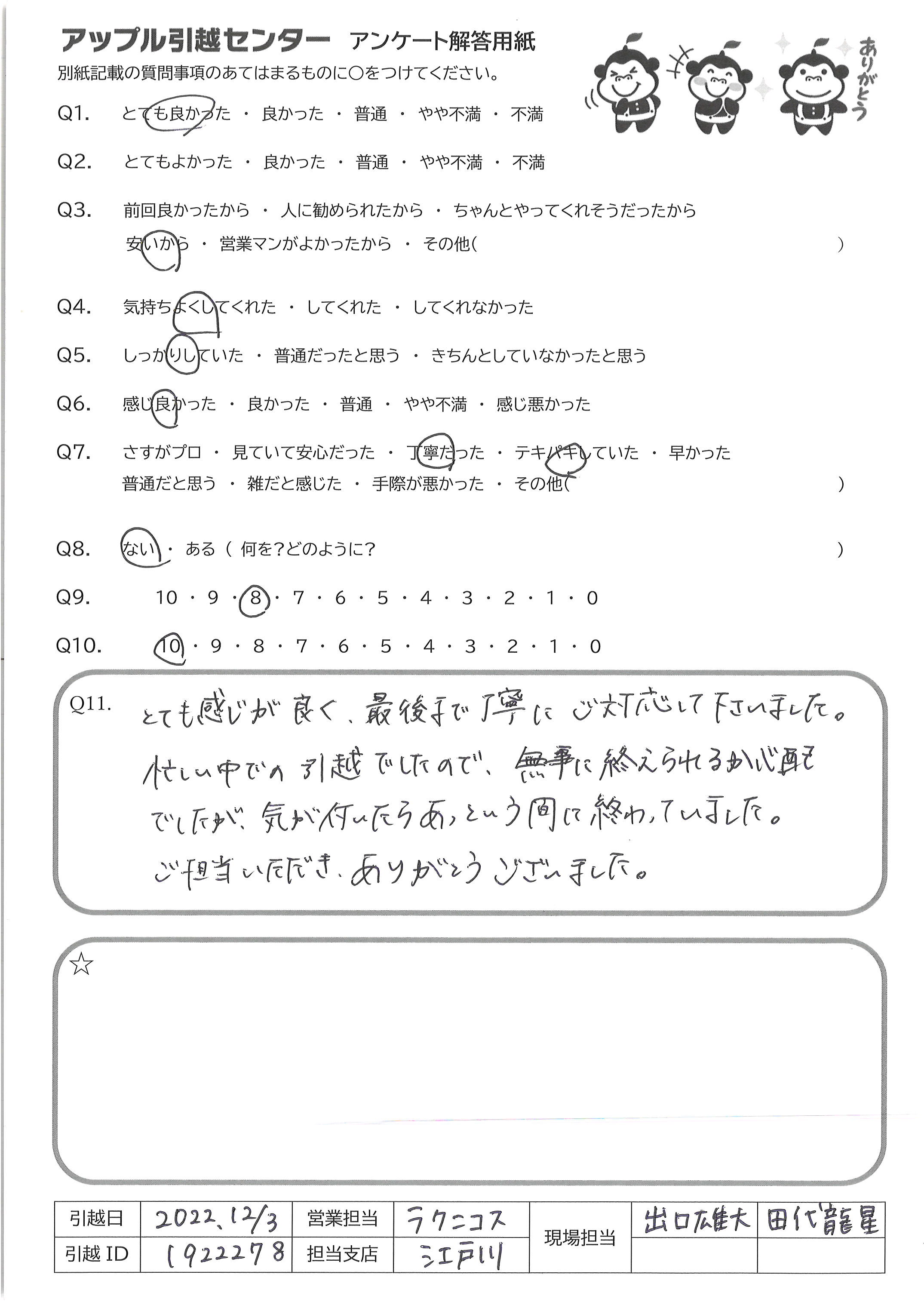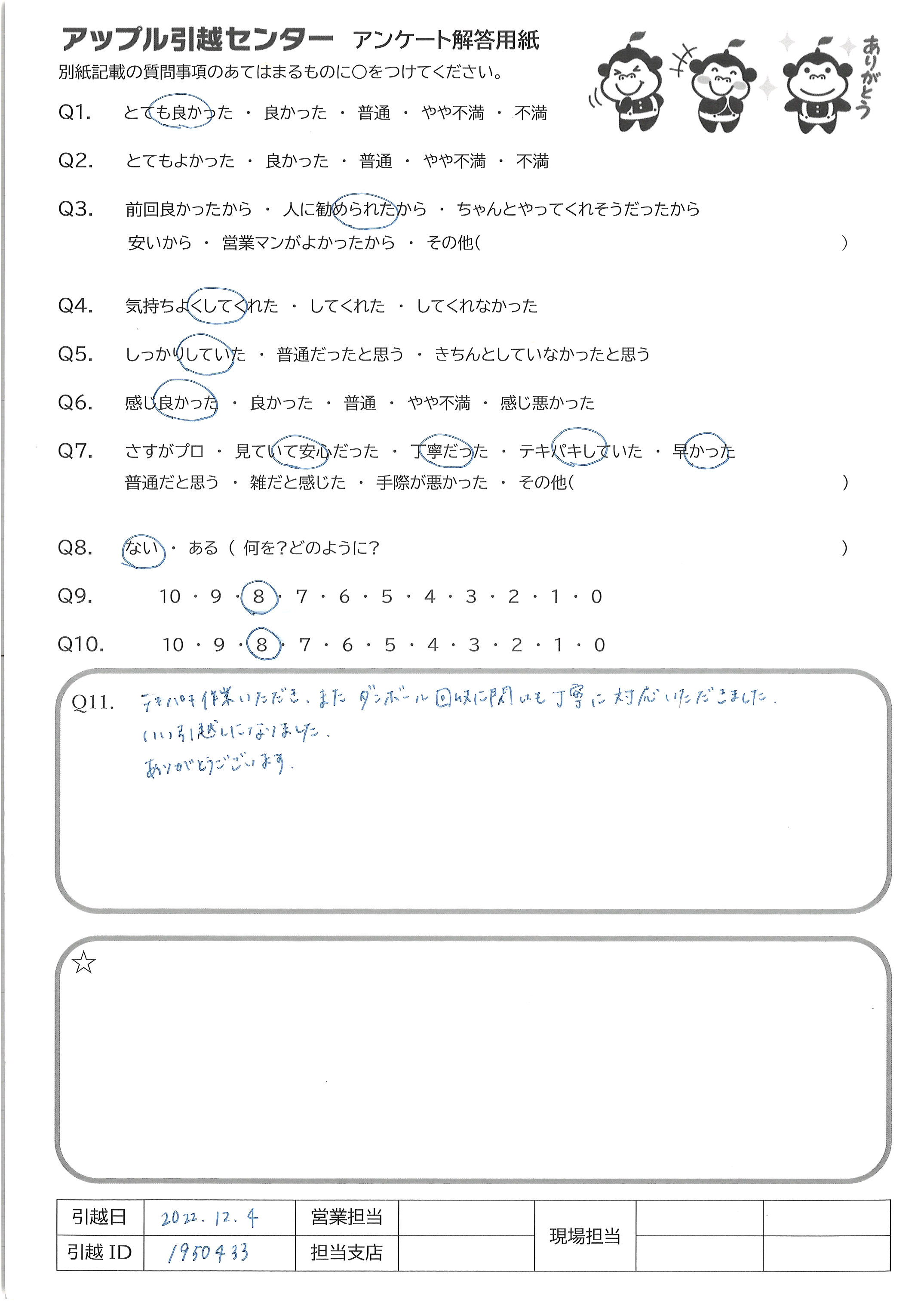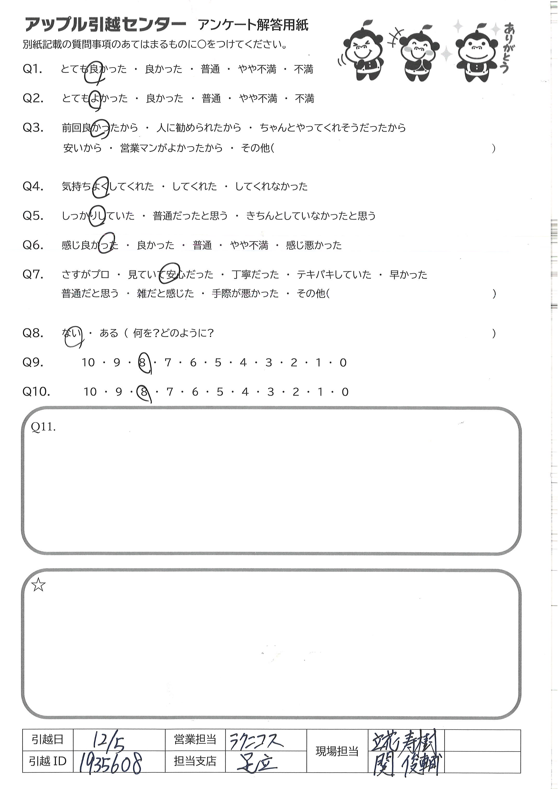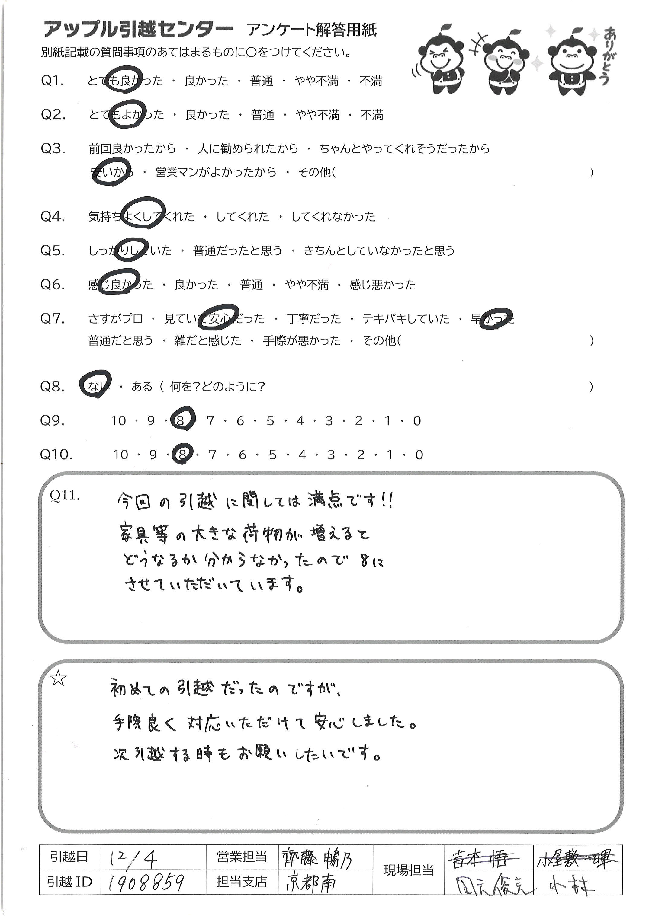 A.今回の引越に関しては満点です!! 家具等の大きな荷物が増えると どうなるか分からなかったので8に させていただいています