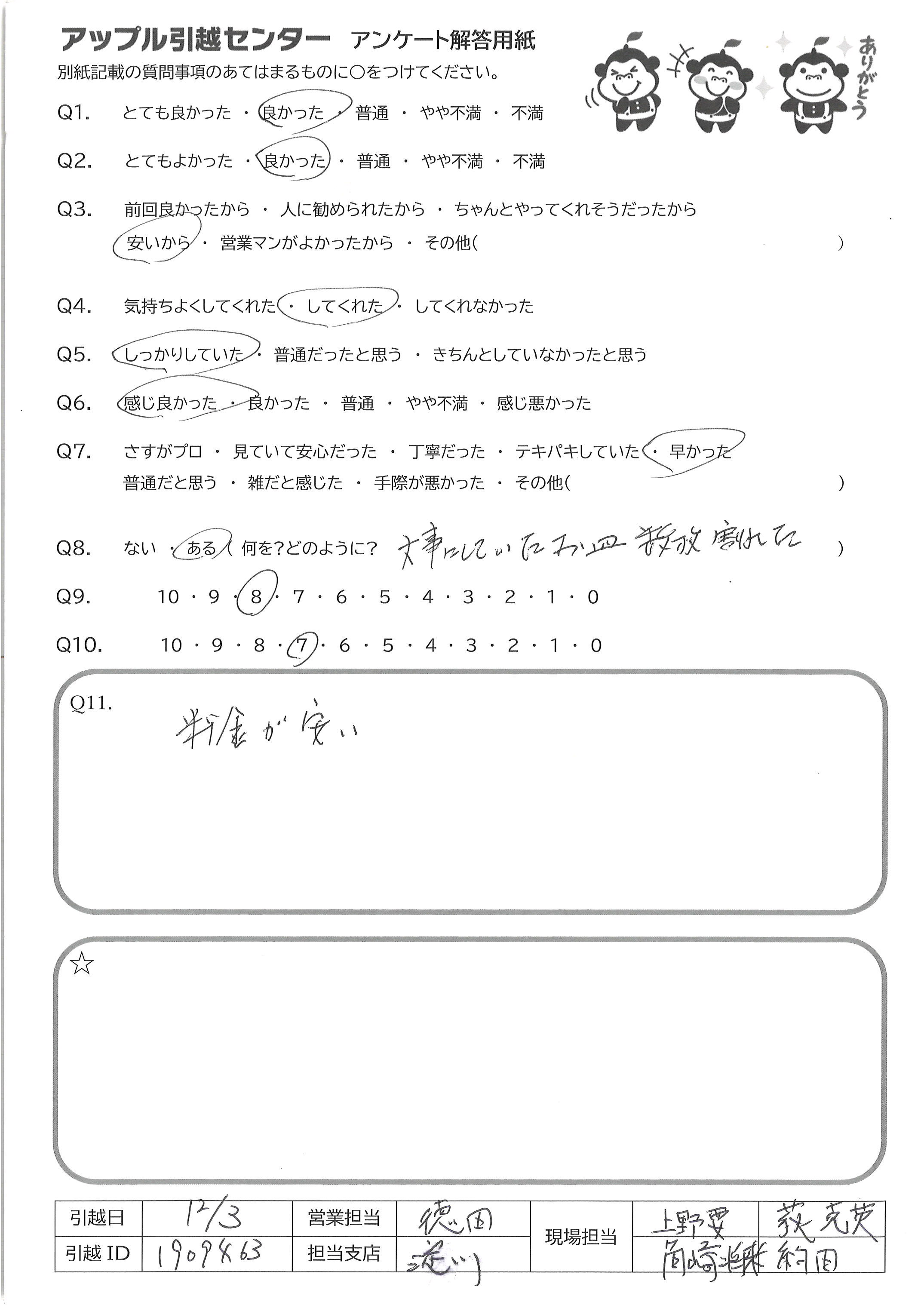 A.相場より安いのに 段ボールや必要なものは 準備してくれて当日もとても 効率よく進められたので