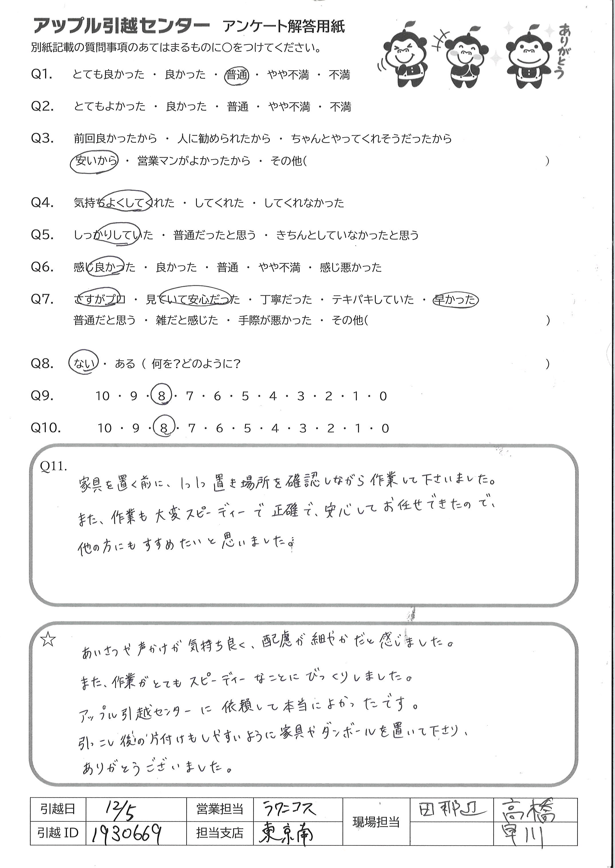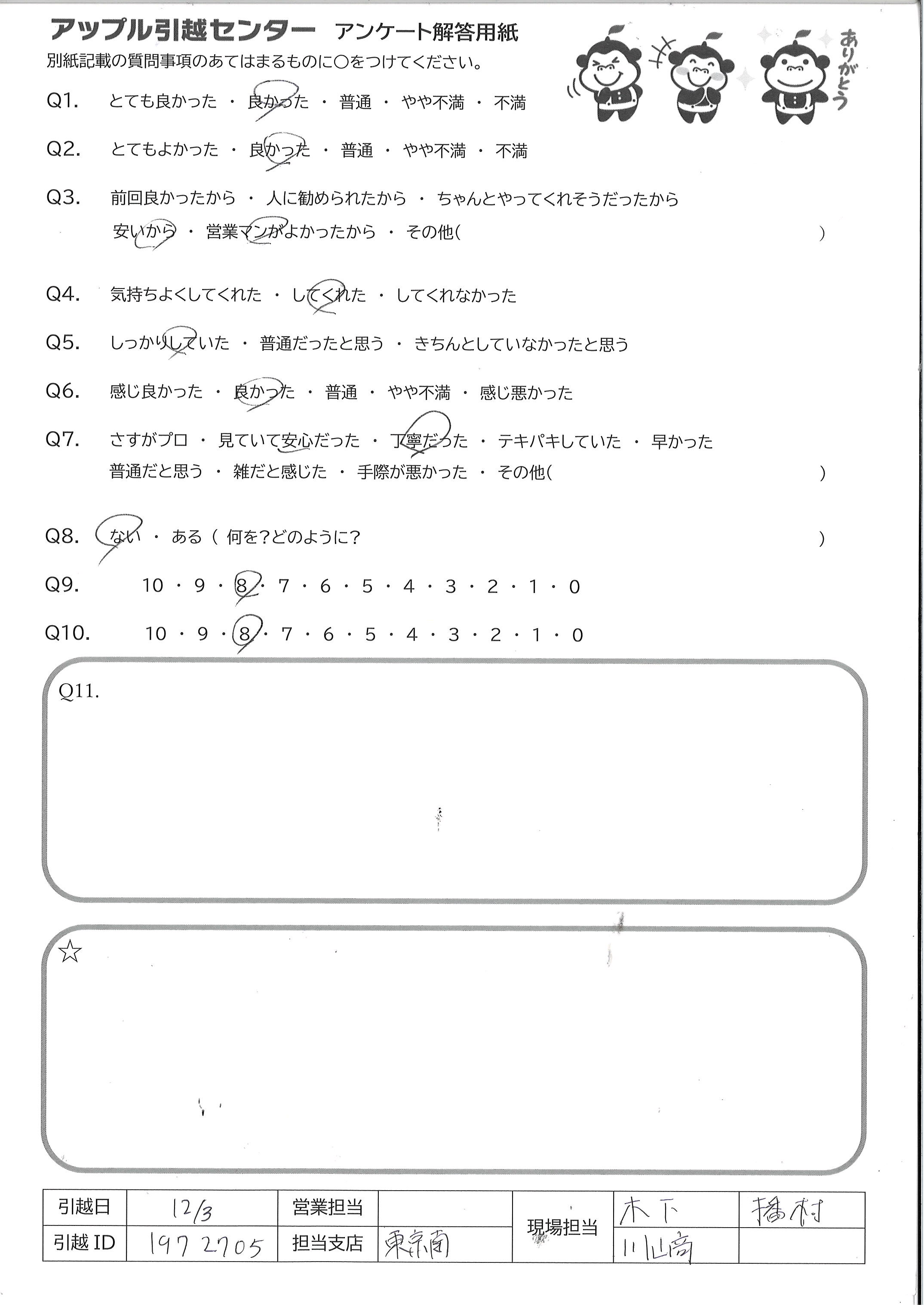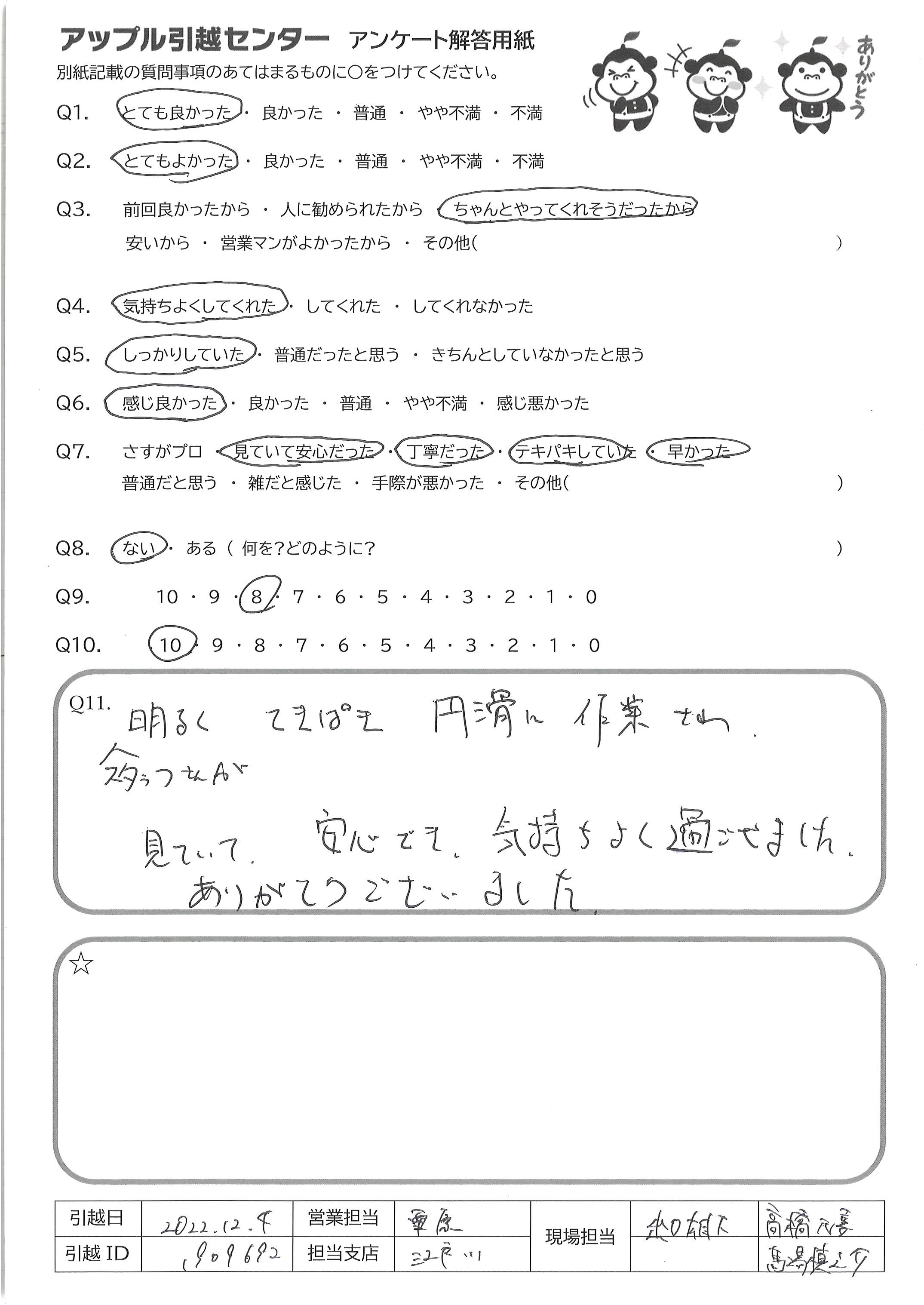 A.とても感じが良く、最後まで丁寧にご対応して下さいました 忙しい中での引越でしたので、無事に終えられるか心配 でしたが、気が付いたらあっという間に終わっていました ご担当いただきありがとうございました