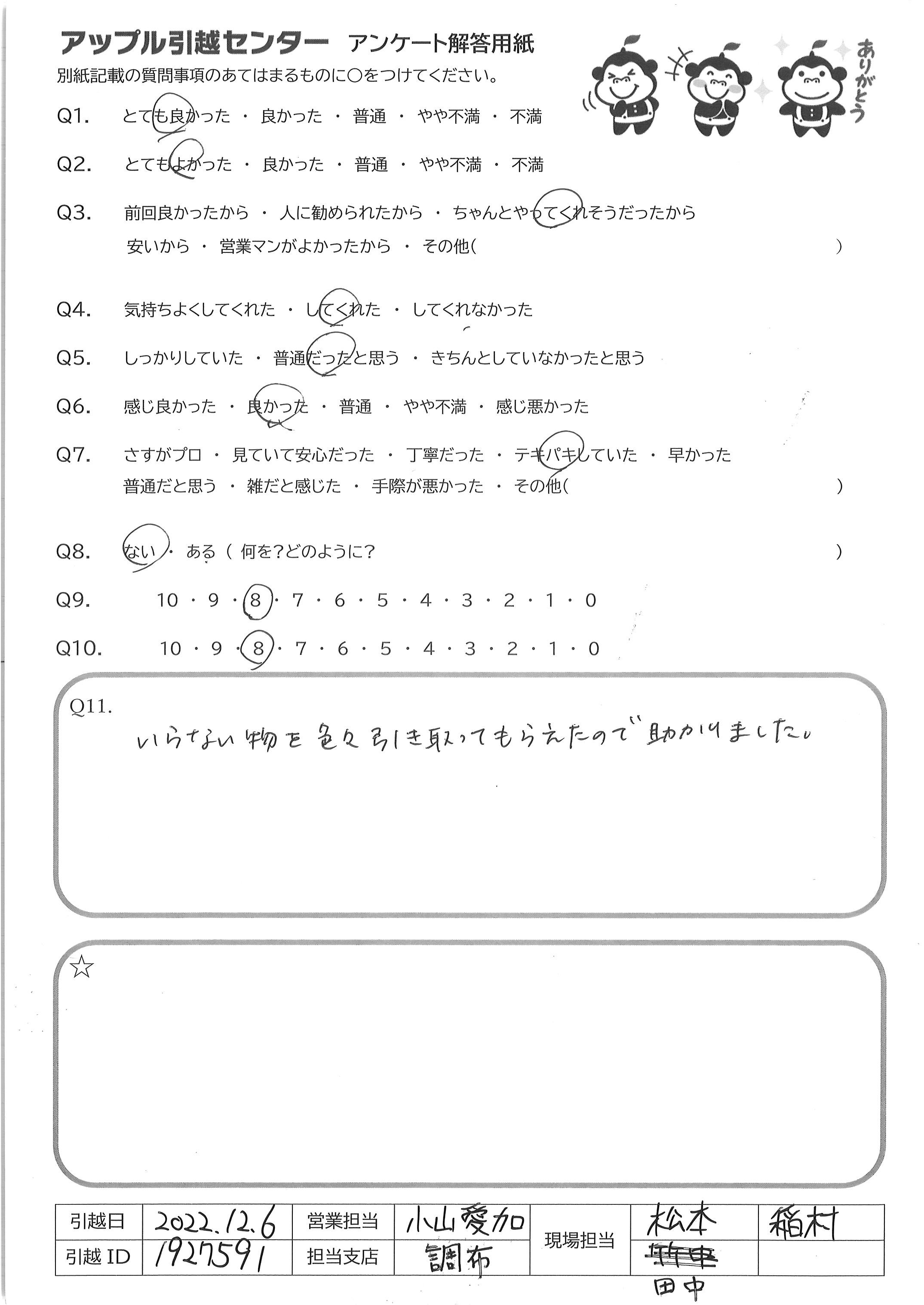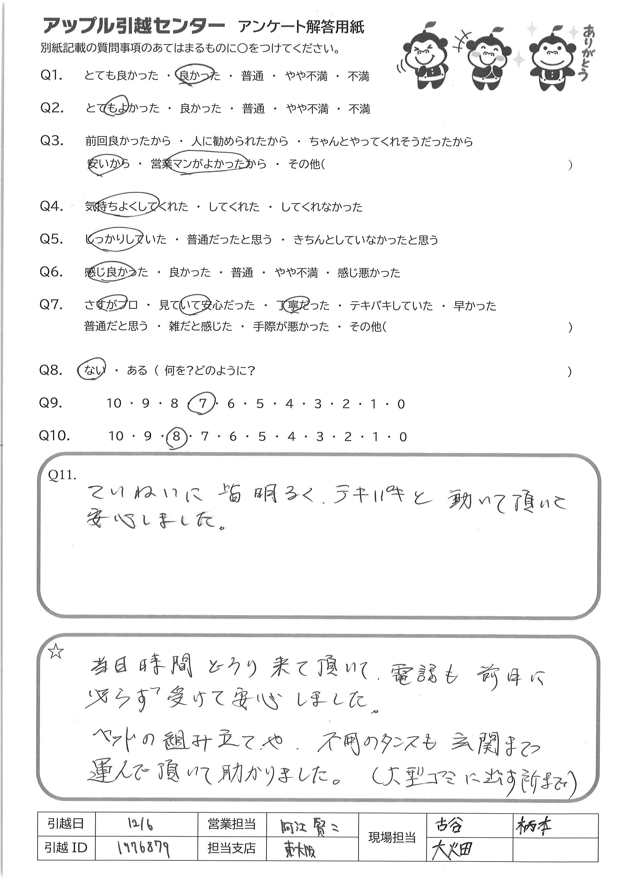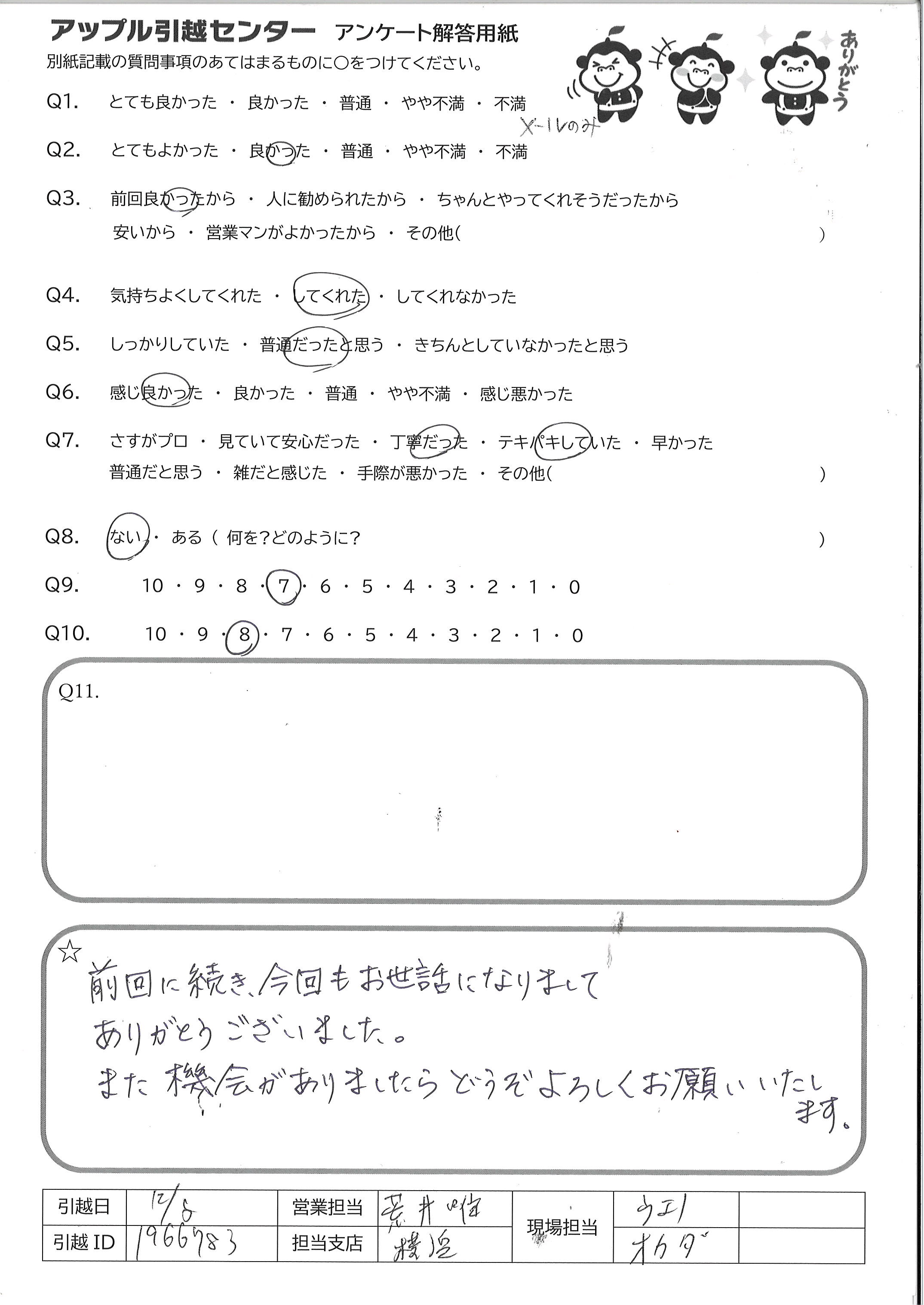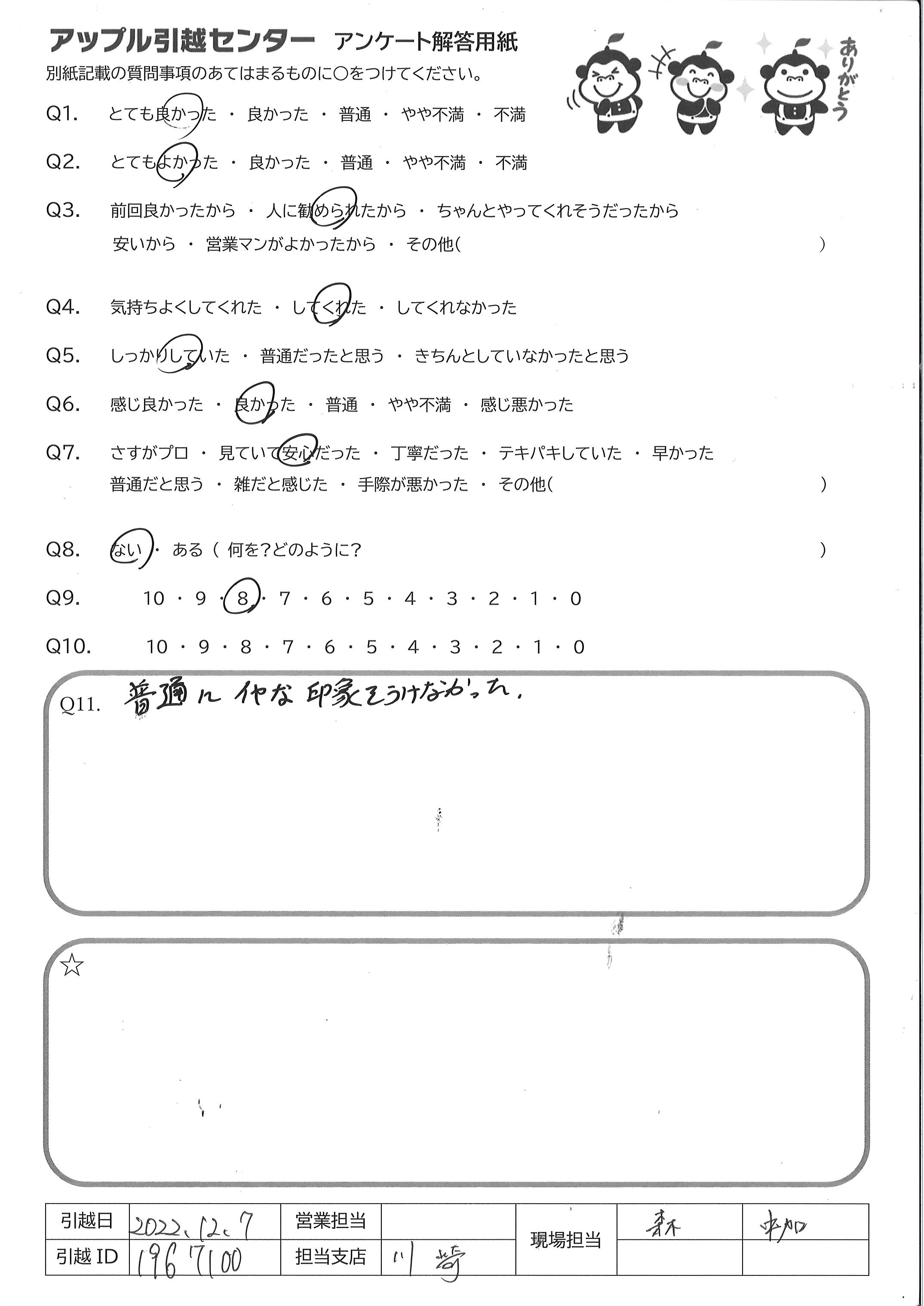 A.とても感じが良く、最後まで丁寧にご対応して下さいました 忙しい中での引越でしたので、無事に終えられるか心配 でしたが、気が付いたらあっという間に終わっていました ご担当いただきありがとうございました