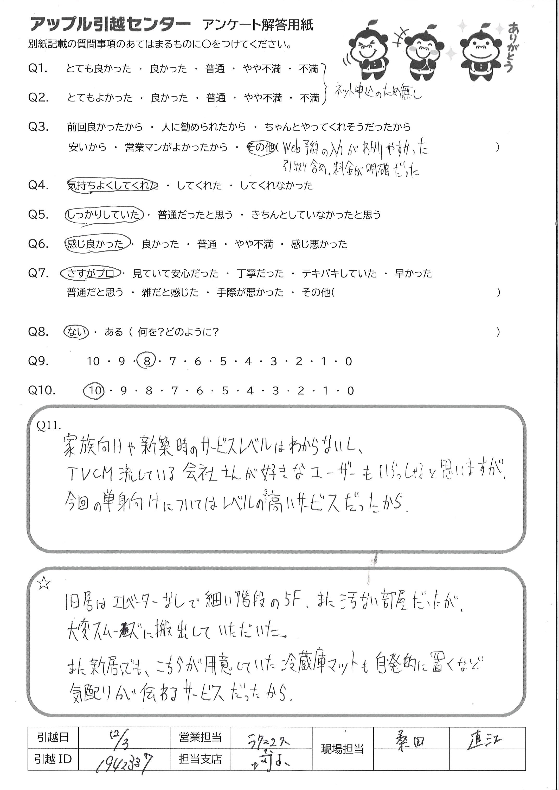 A.旧居はエレベーターなしで、細い階段の5F。また汚い部屋だったが 大変スムーズに搬出していただいた また新居でもこちらが用意していた冷蔵庫マットも自発的に置くなど 気配りが伝わるサービスだったから
