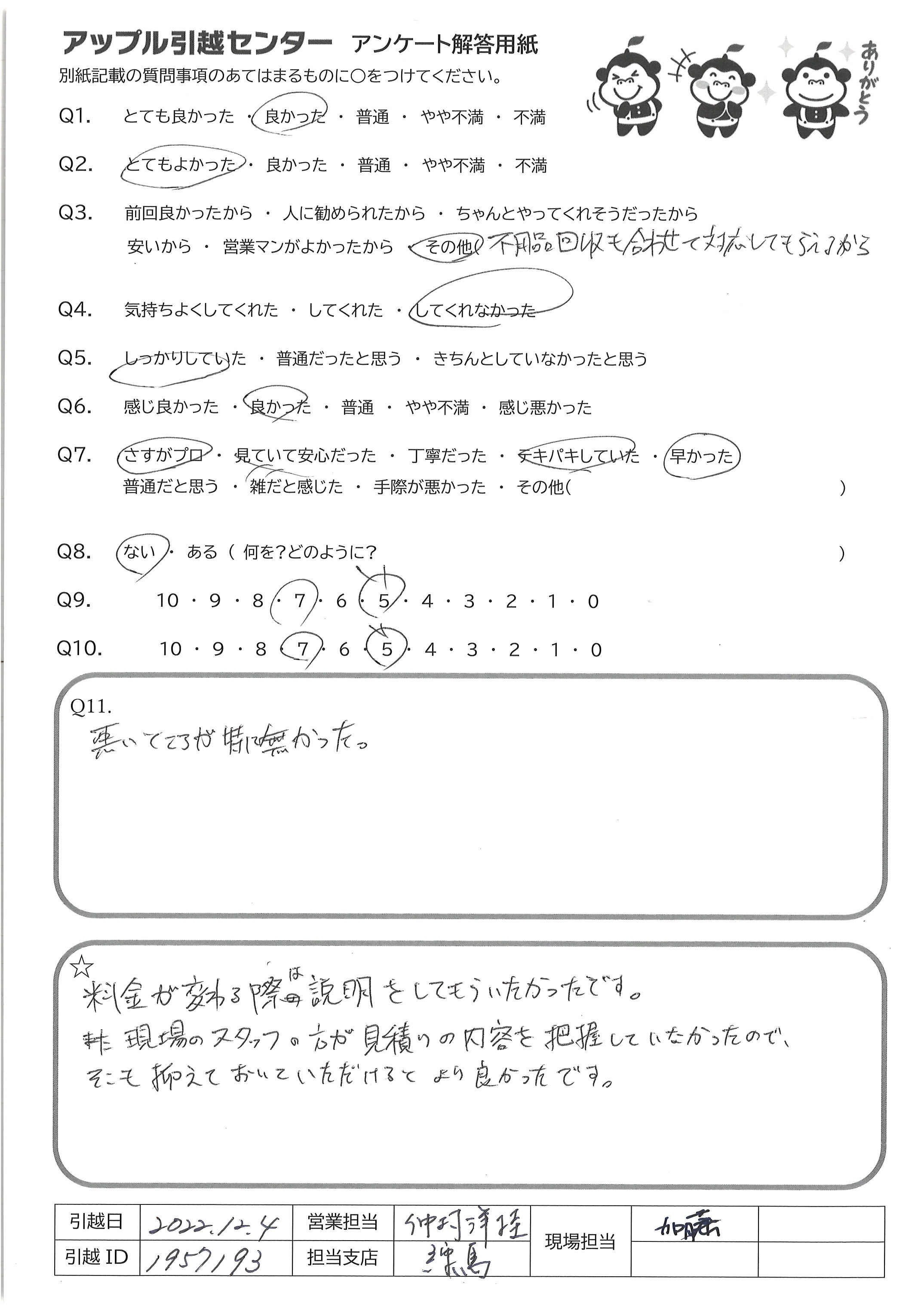 A.料金が変わる際は説明をしてもらいたかったです 現場のスタッフの方が見積りの内容を把握していなかったので そこも押させておいていただけるとより良かったです