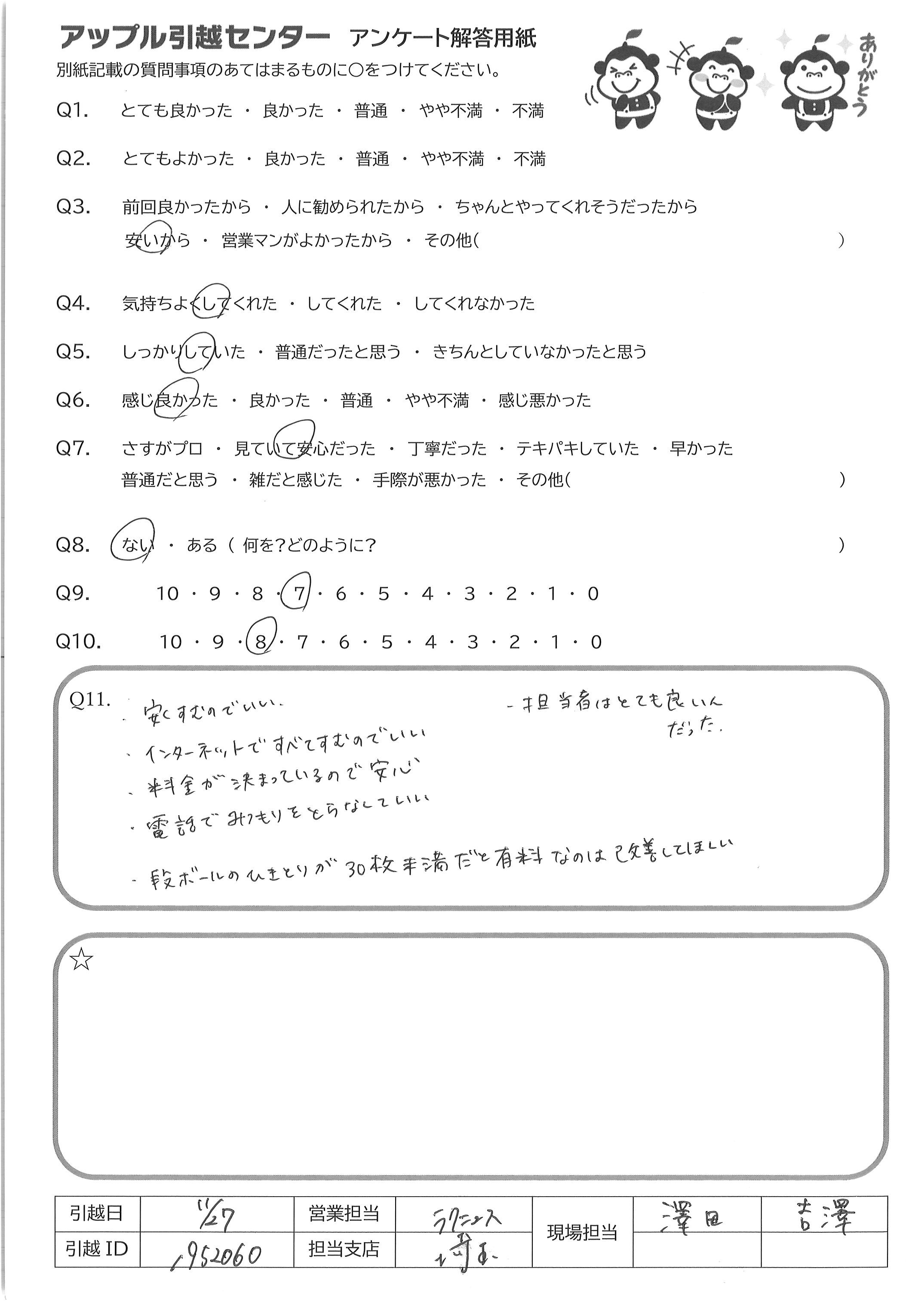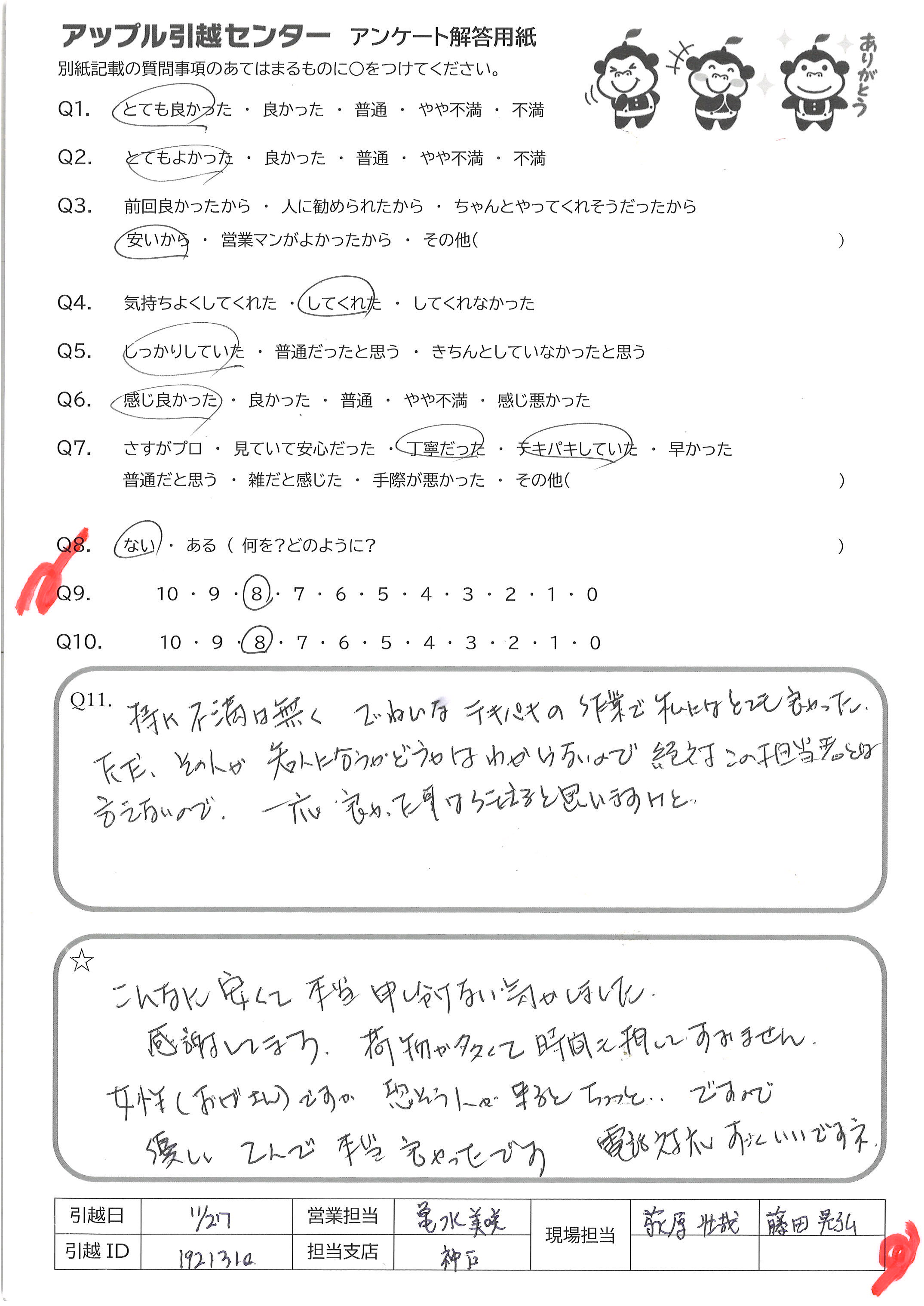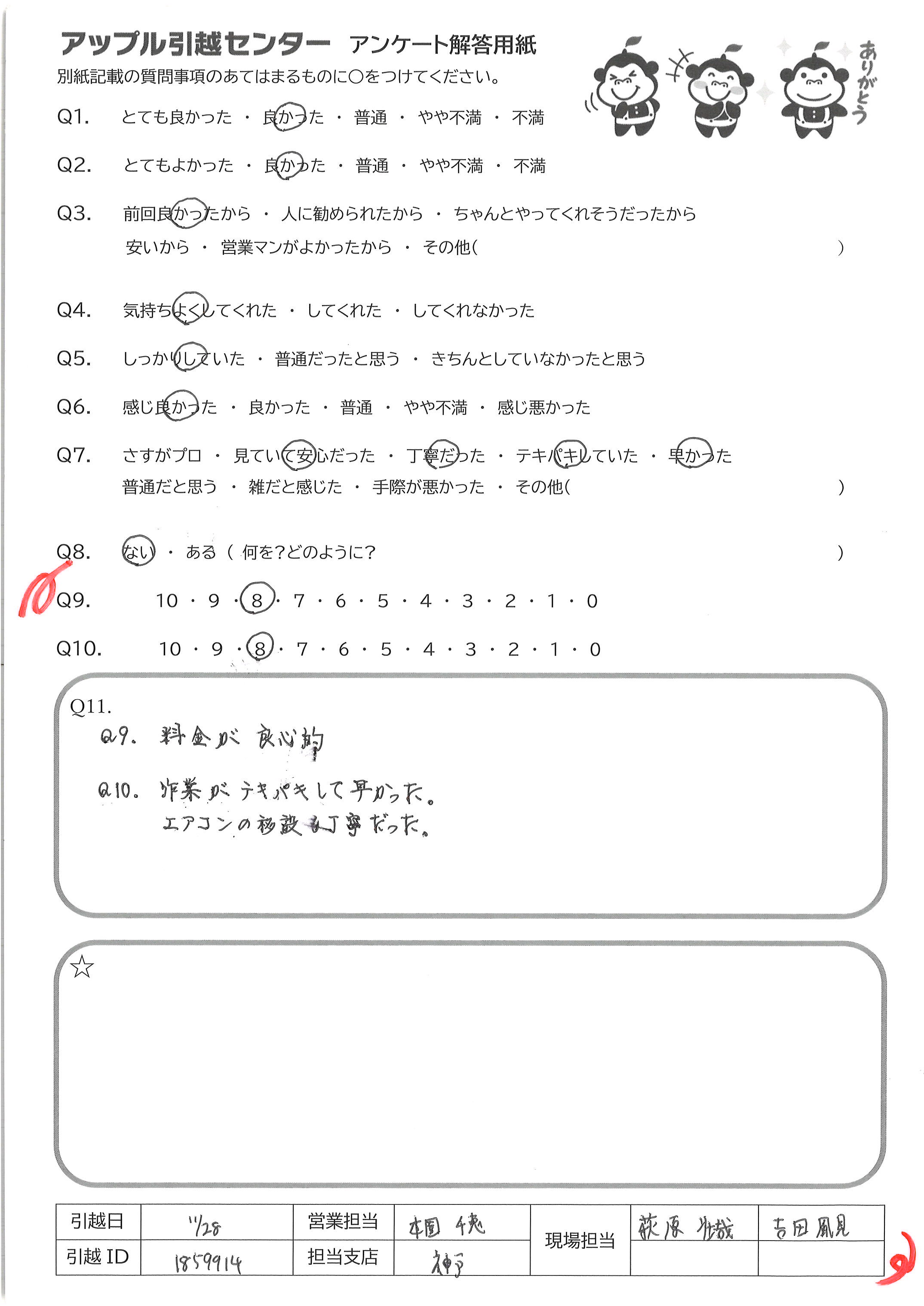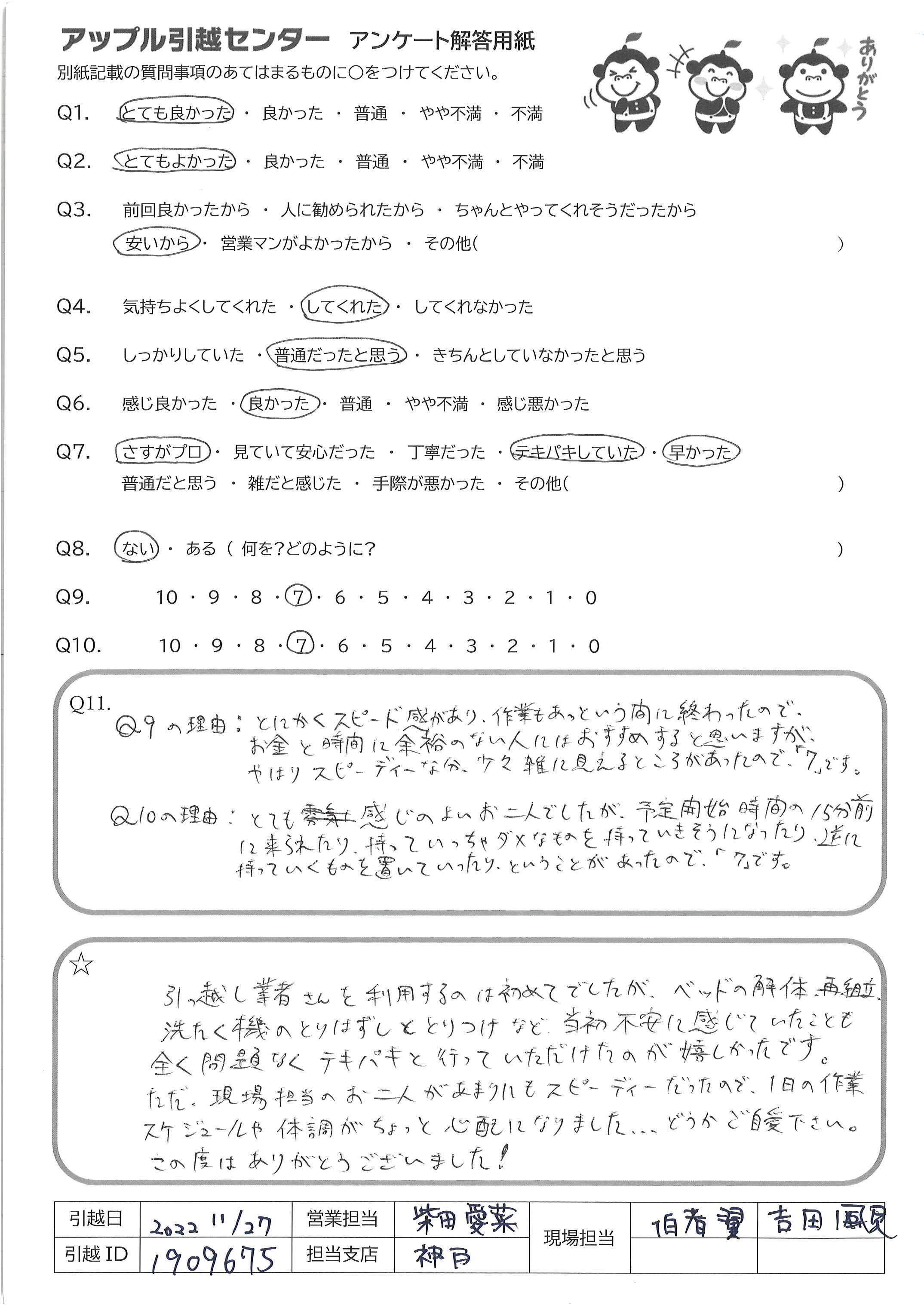 A.Q9の理由:とにかくスピード感があり、作業もあっという間に終わったので、 お金と時間は余裕のない人にはおすすめすると思いますが やはり、スピーディな分、雑に見えるところがあったので「7」です Q10の理由:とても感じのよいお二人でしたが、予定開始時間の15分前 に来られたり、持って行っちダメなものを持っていきそうになったり、逆に 持っていくものを置いていったりということがあったので「7」です