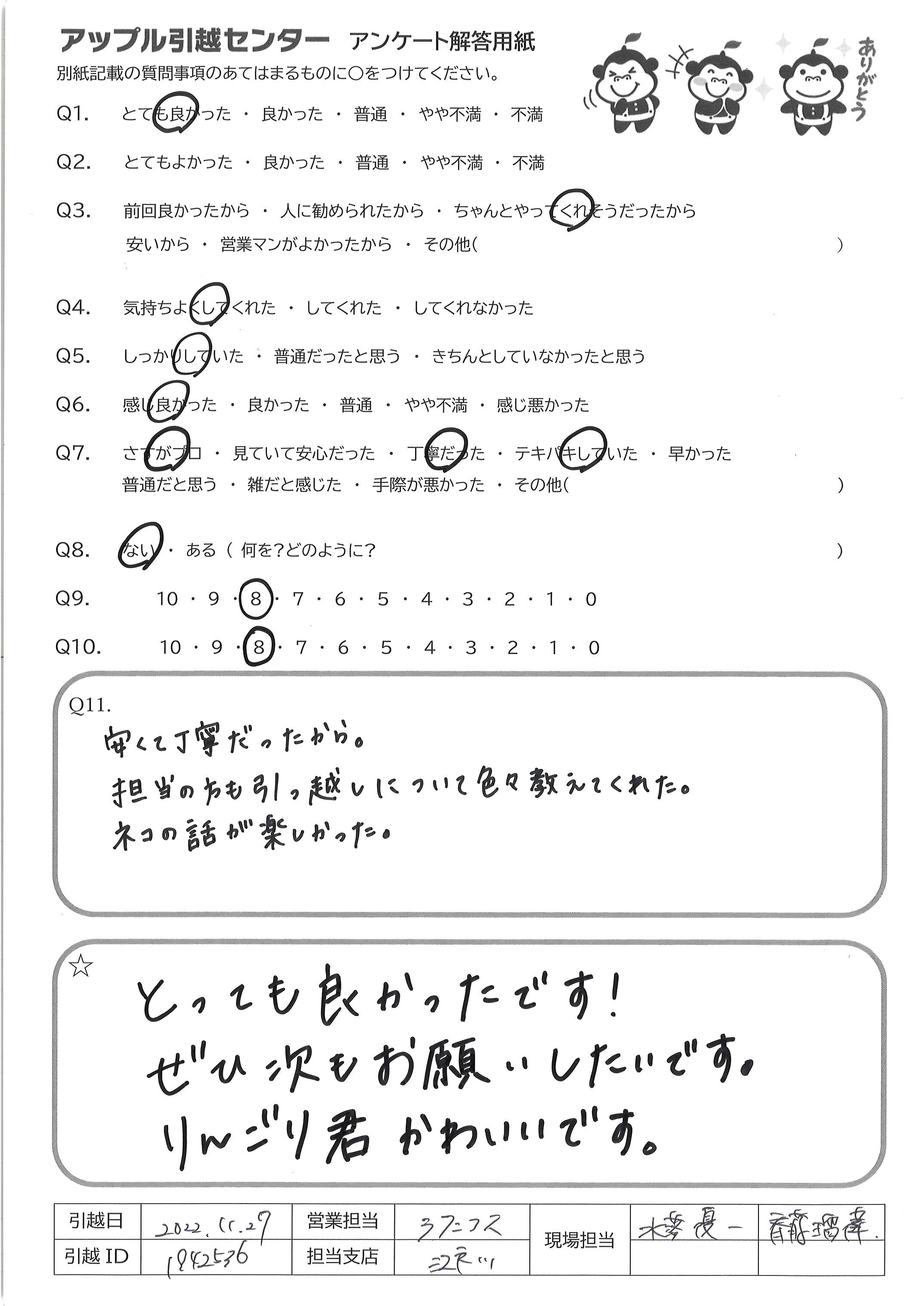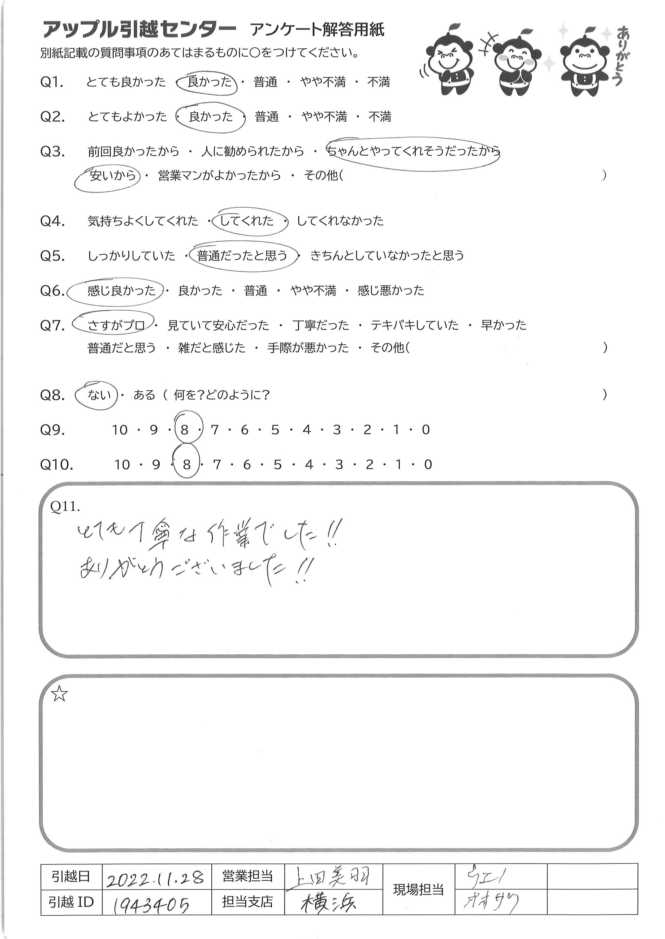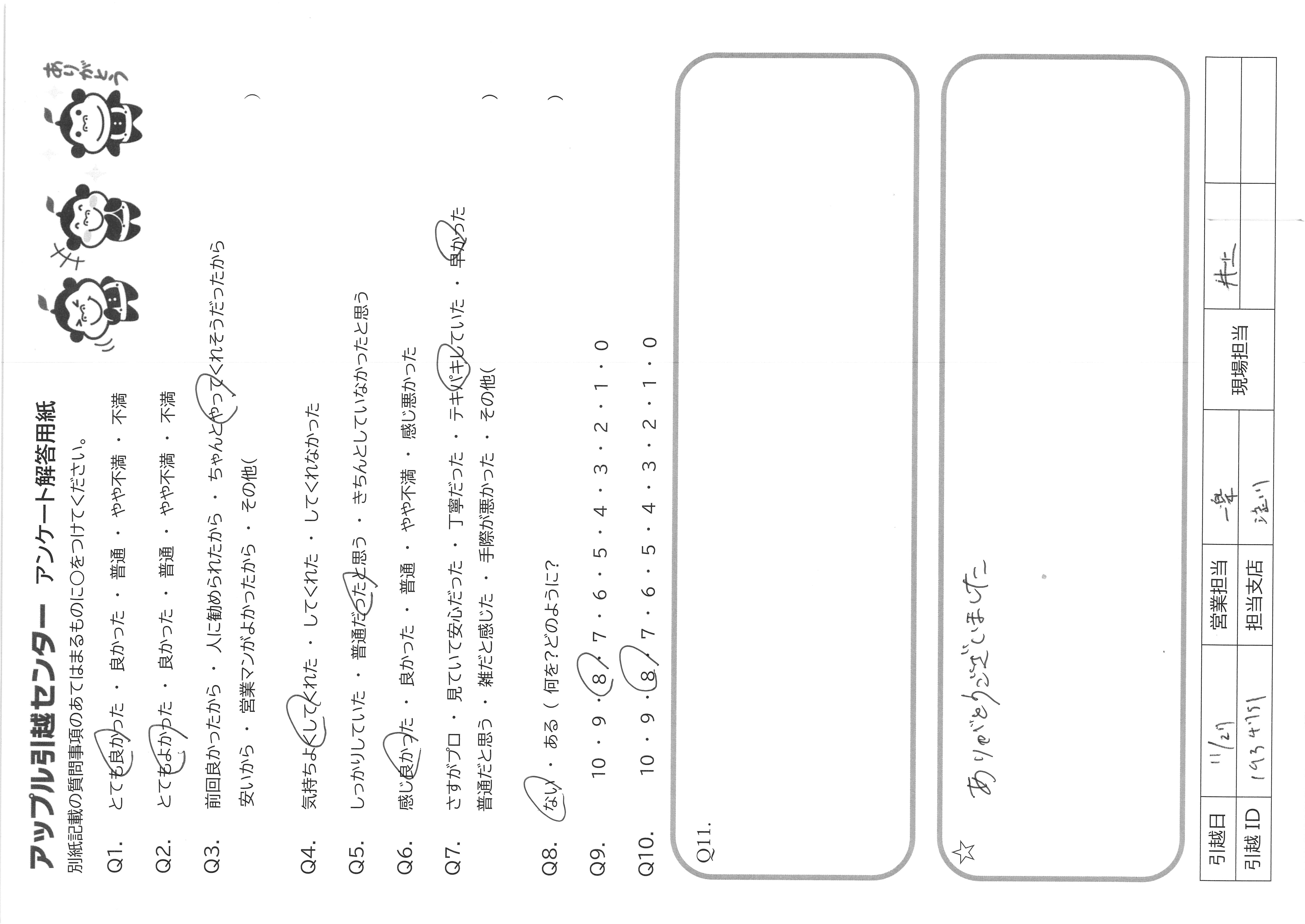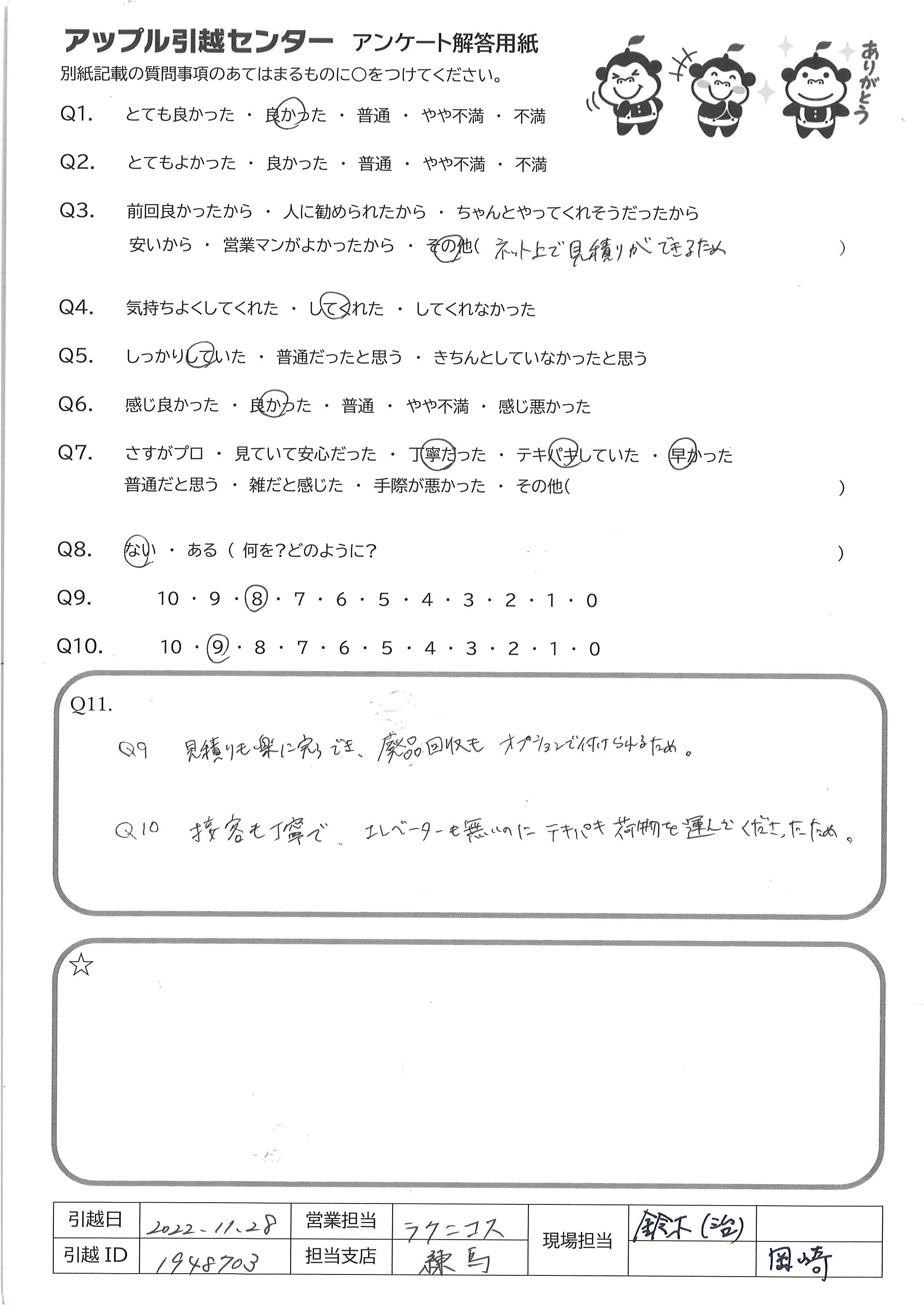 A.Q9 見積りも楽に完了でき、廃品回収もオプションで付けられるため Q10 接客も丁寧で、エレベーターも無いのにテキパキ荷物を運んでくださったため