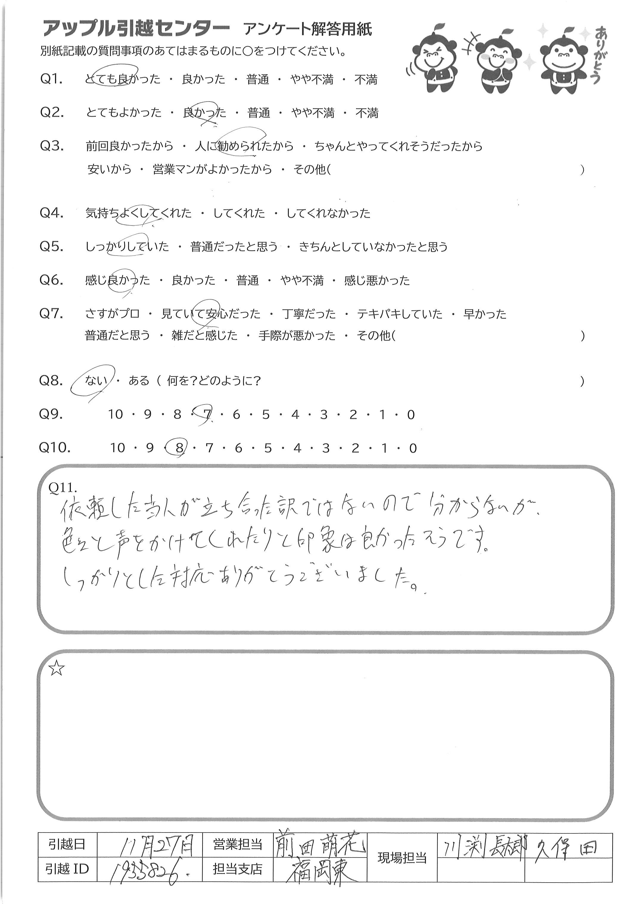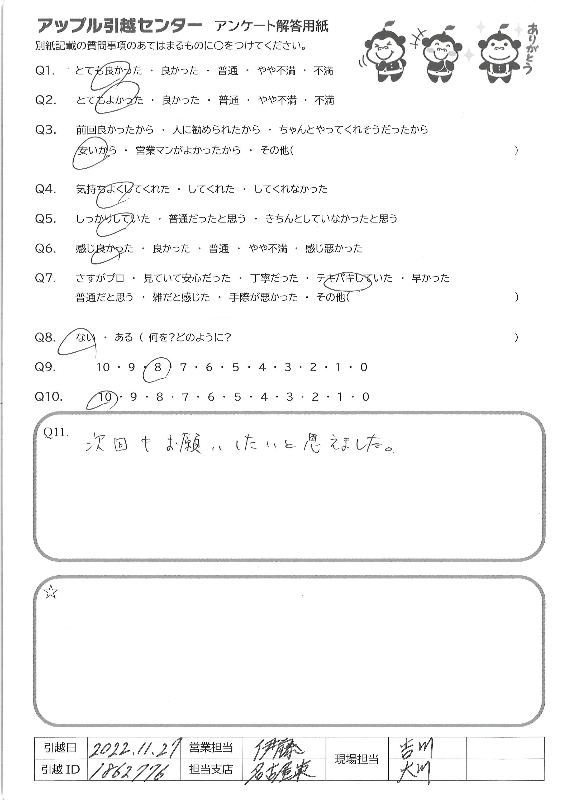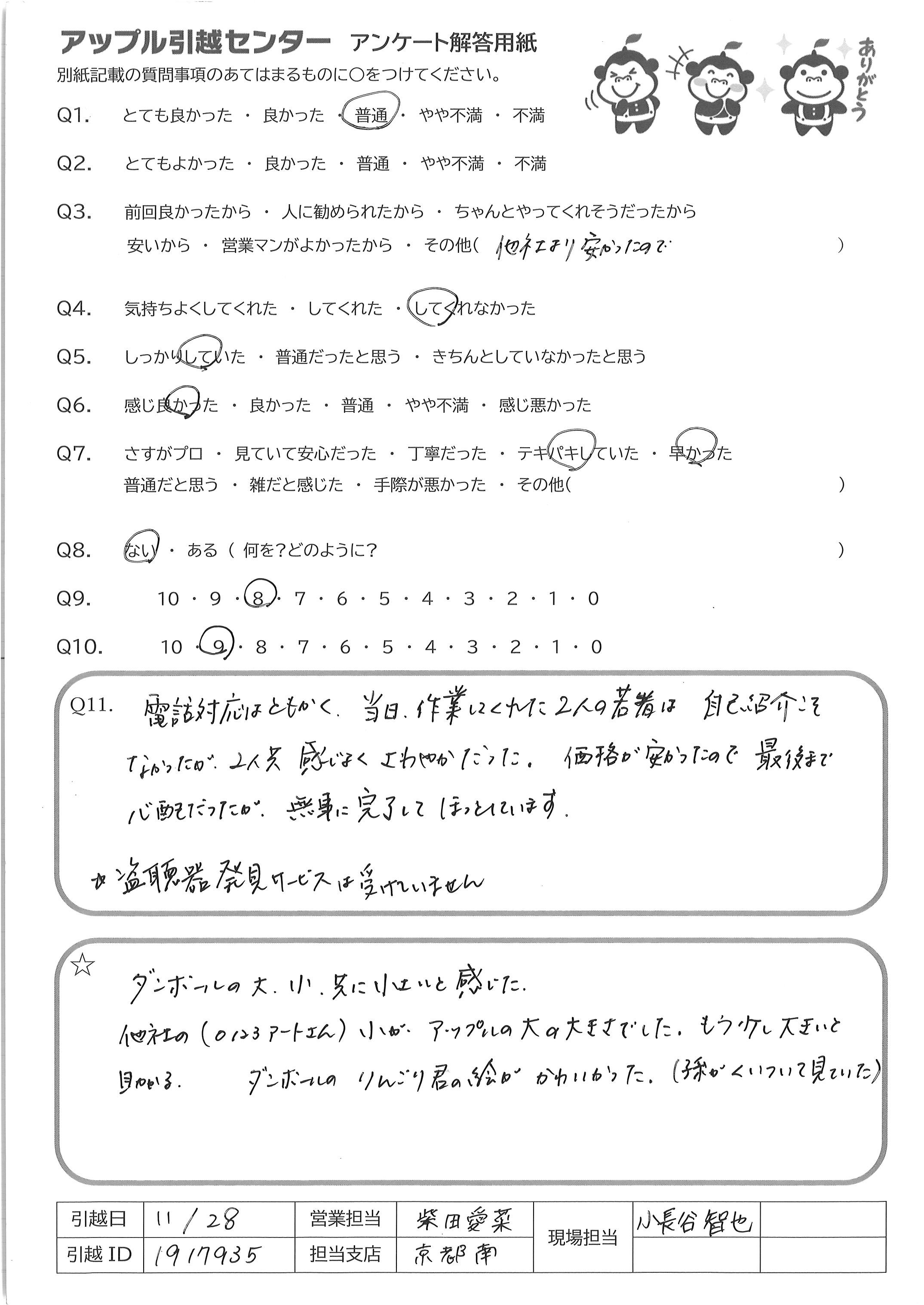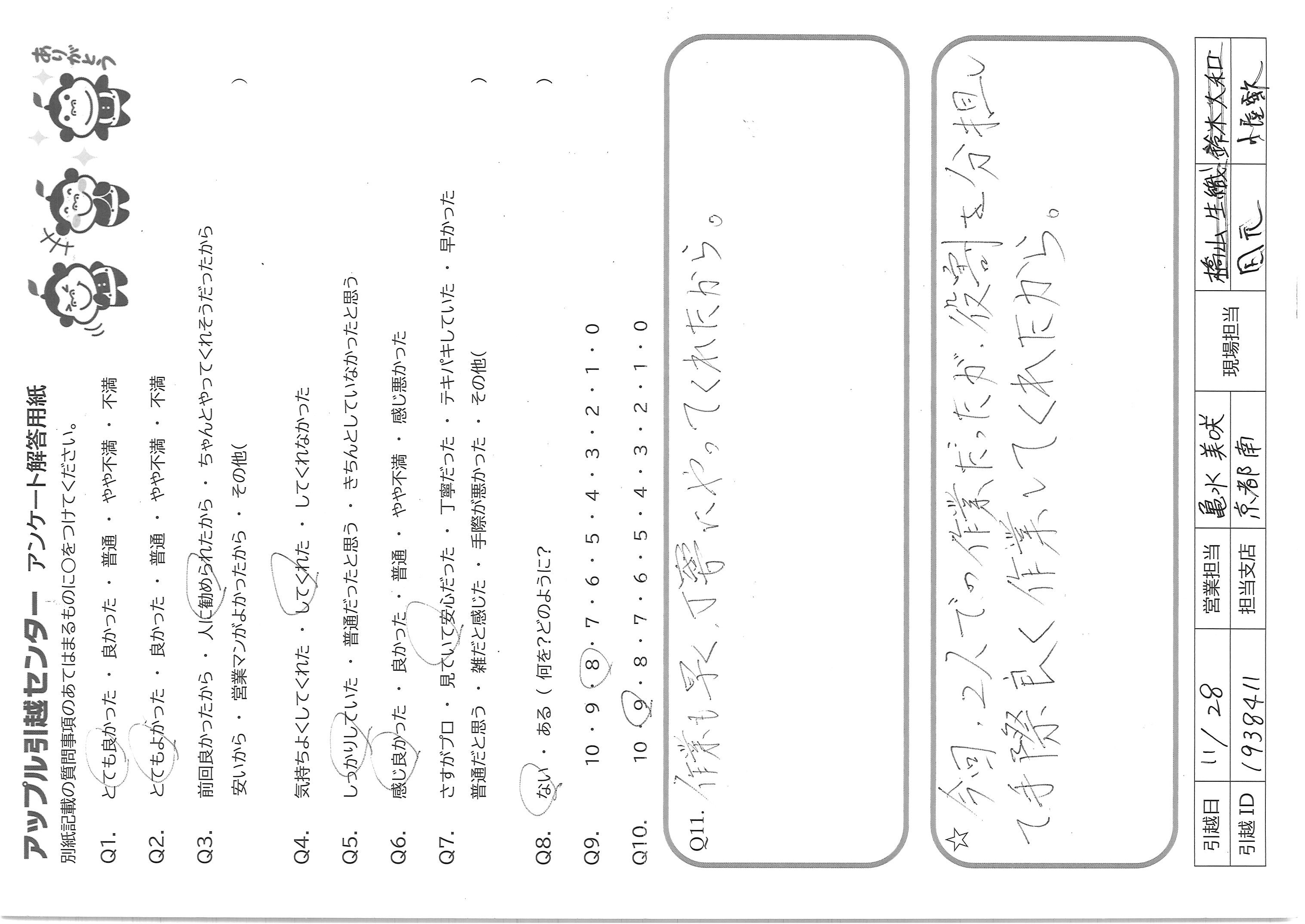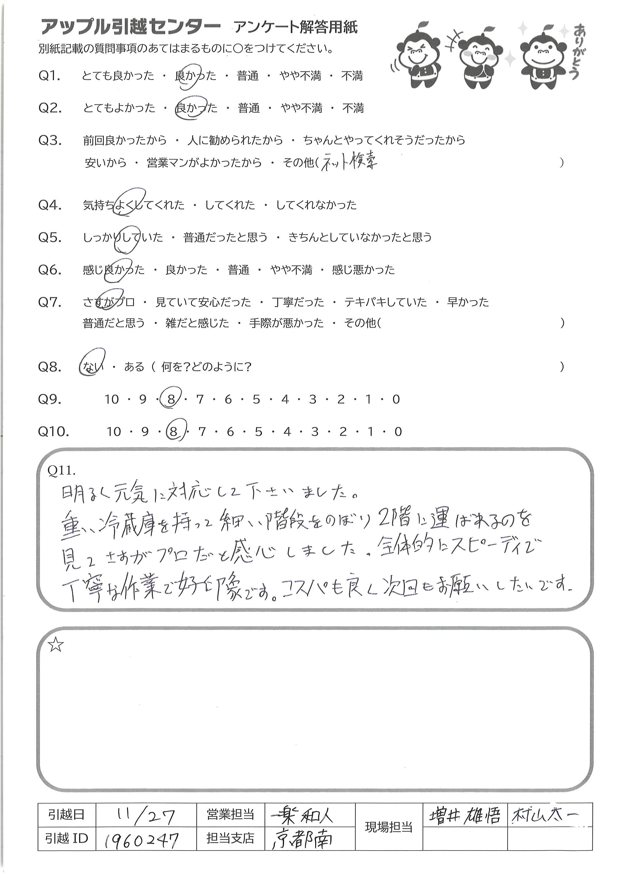 A.Q9 見積りも楽に完了でき、廃品回収もオプションで付けられるため Q10 接客も丁寧で、エレベーターも無いのにテキパキ荷物を運んでくださったため