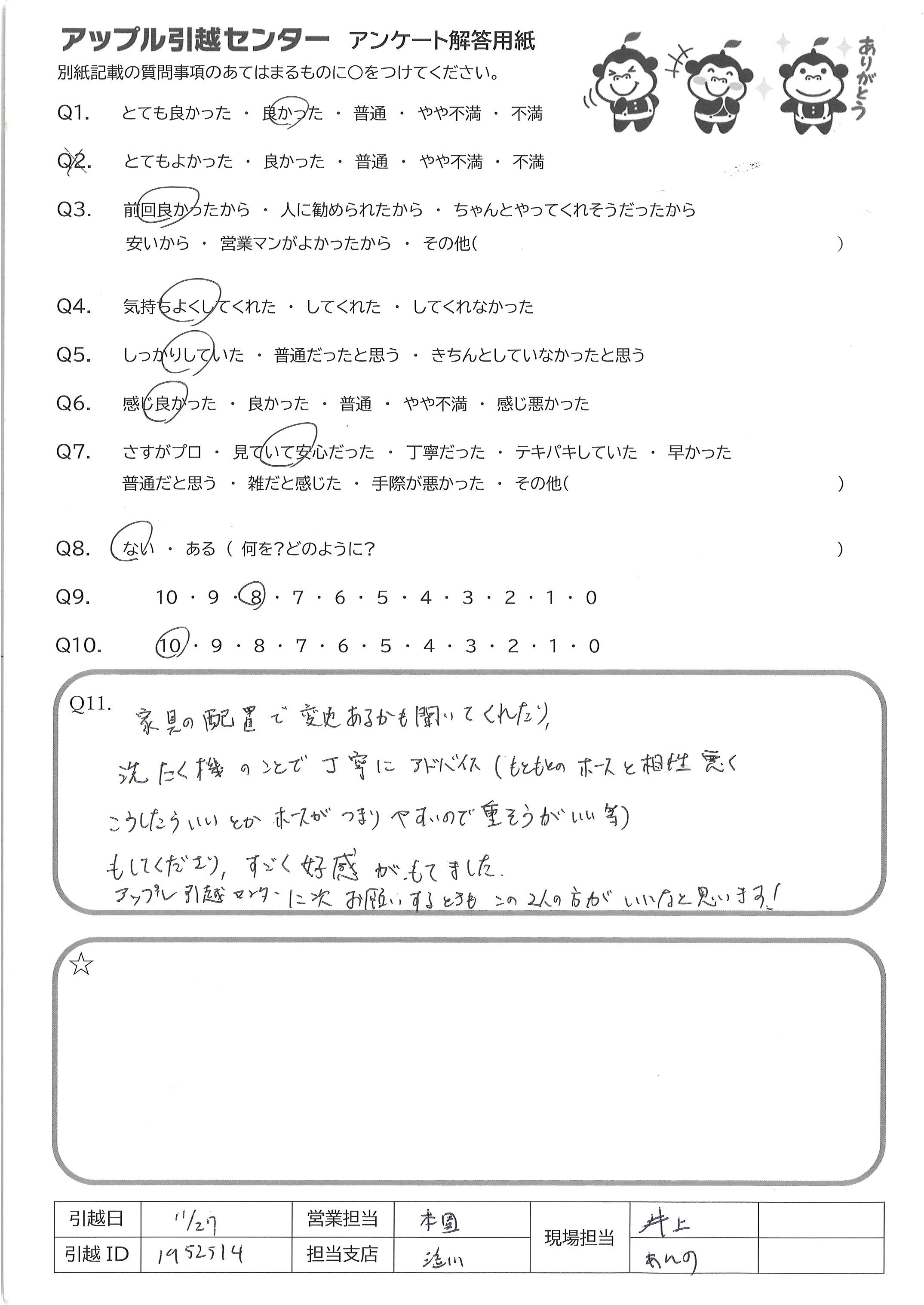A.家具の配置で変更あるかも聞いてくれたり 洗たく機のことで丁寧にアドバイス(もともとホースと愛想悪く こうしたらいいとかホースがつまりやすいので、重そうがいい等) もしてくださり、すごく好感がもてました アップル引越センターに次、お願いする時も、この2人がいいなと思います
