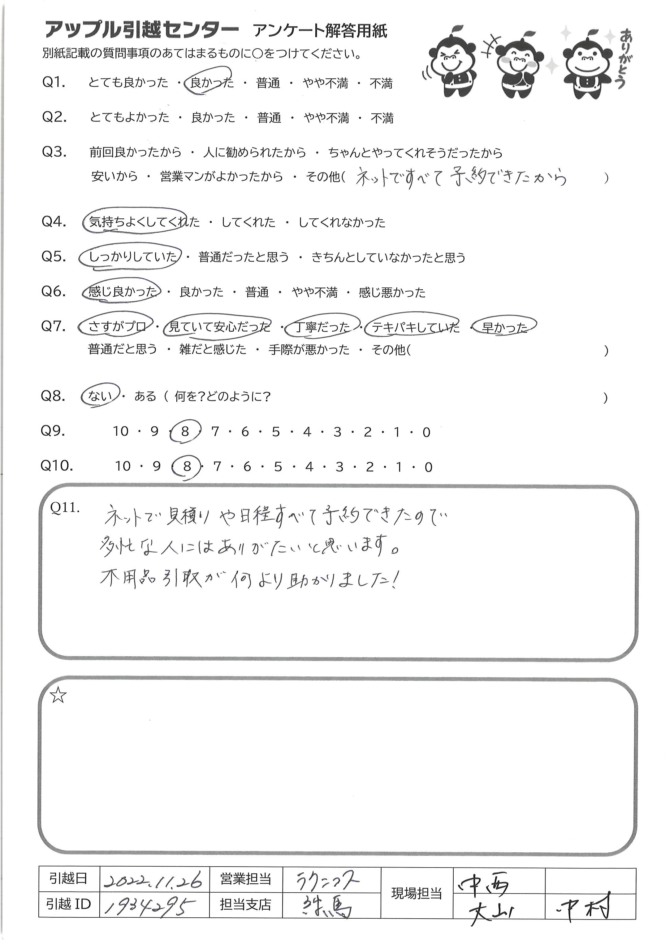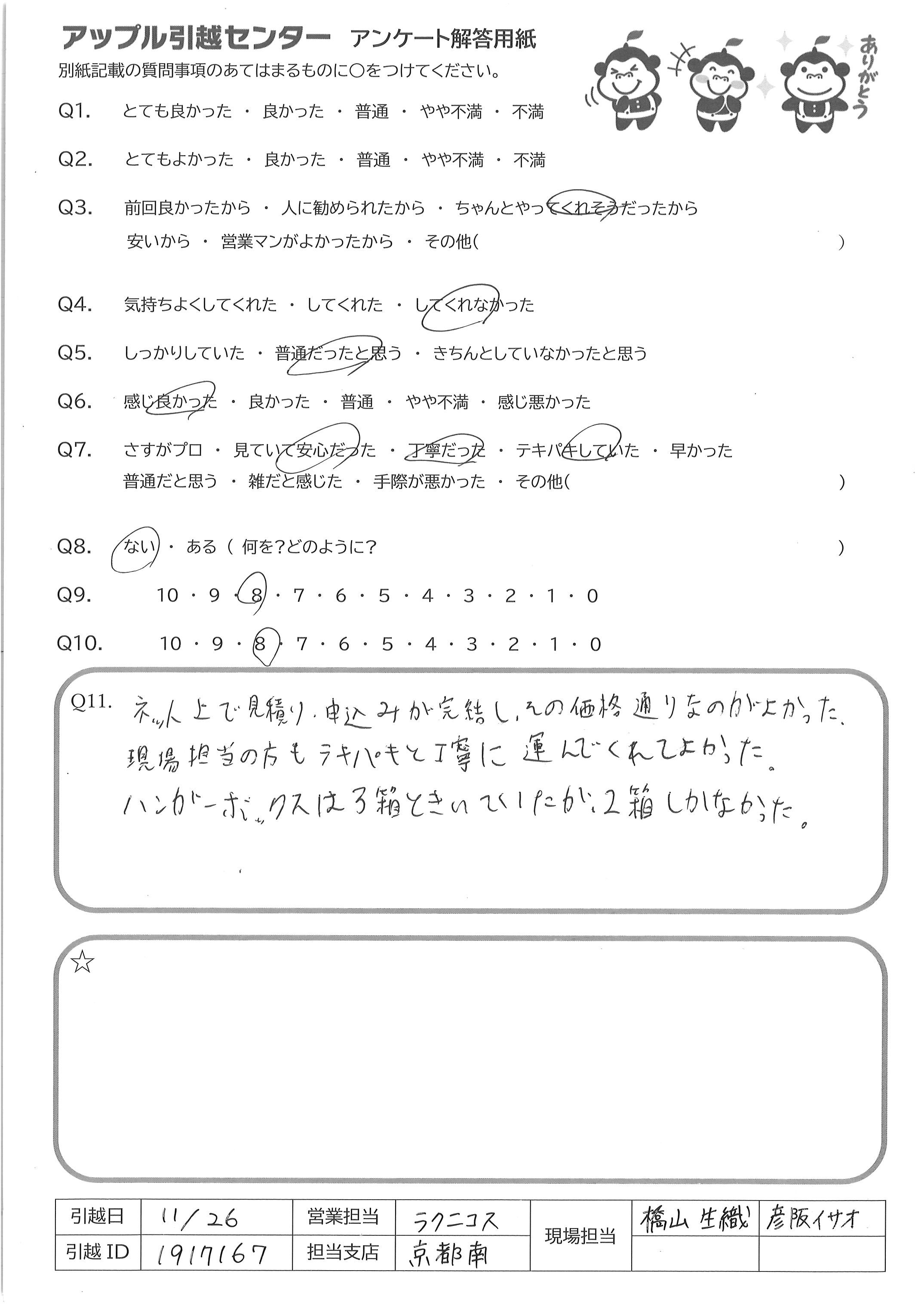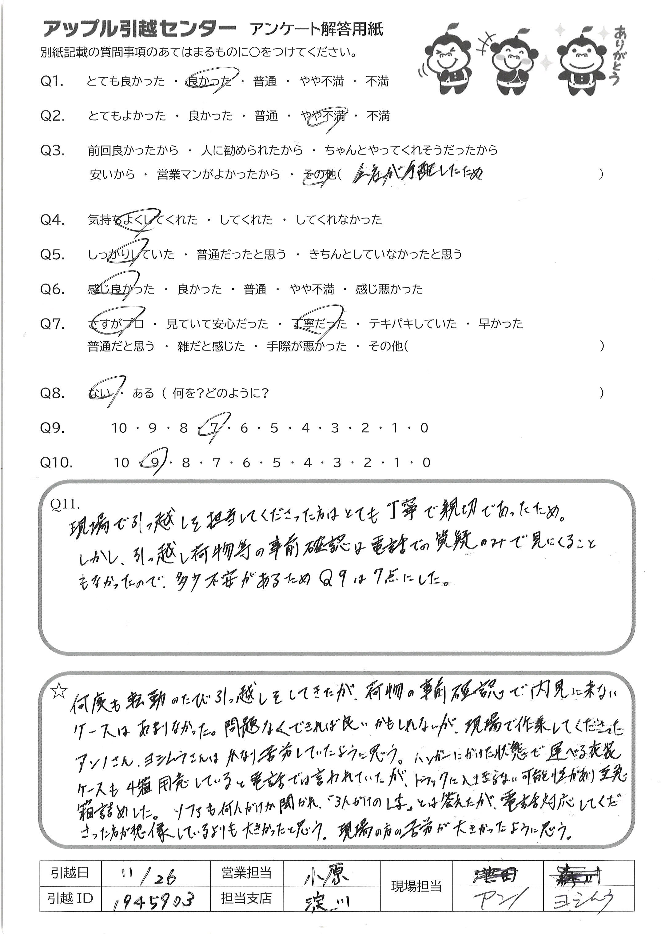 A.現場で引っ越しを担当してくださった方はとても丁寧で親切であったため しかし、引っ越し荷物等の事前確認は電話での疑問のみで見にくること もなかったので、多少の不安があるため、Q9は7点にした