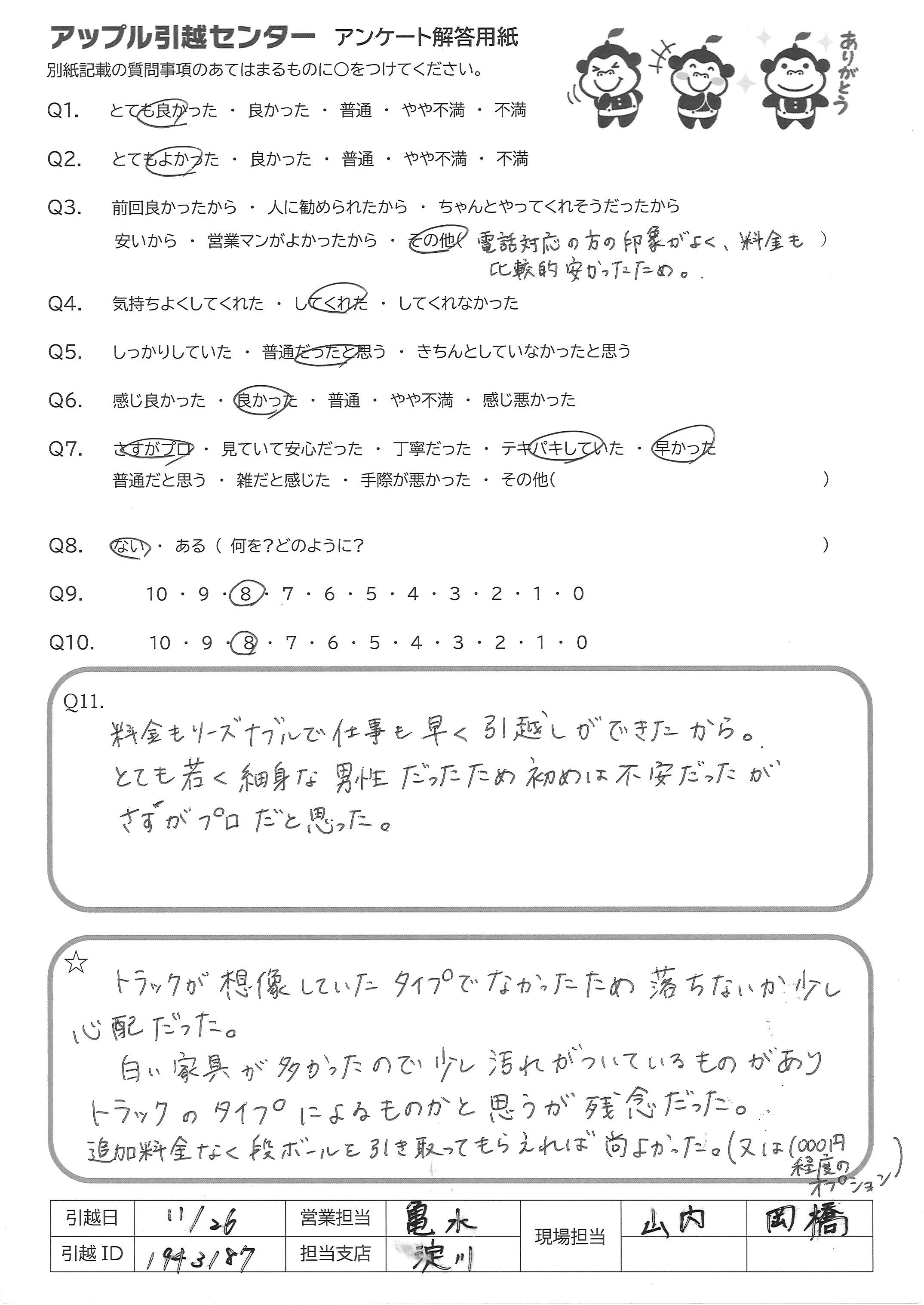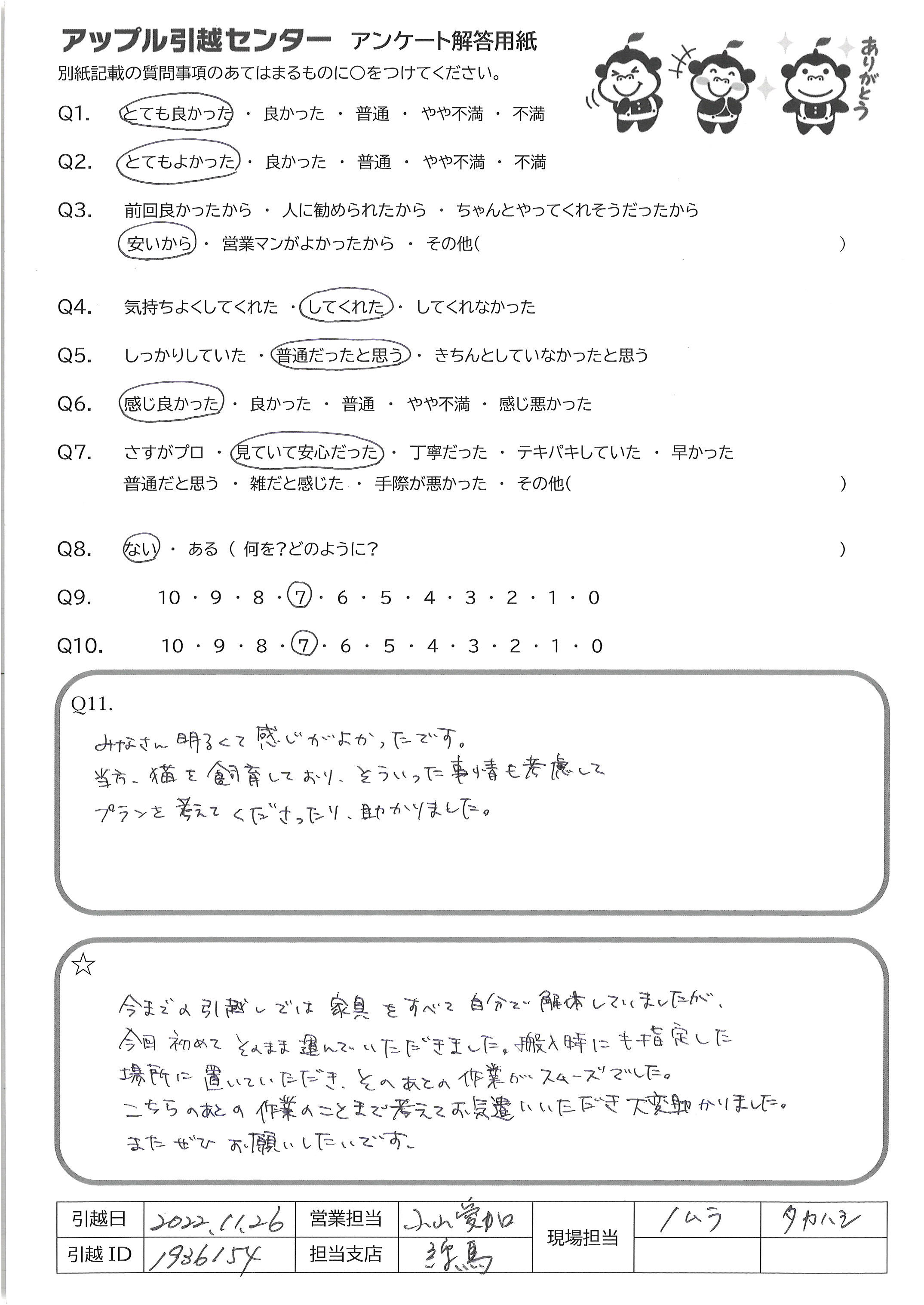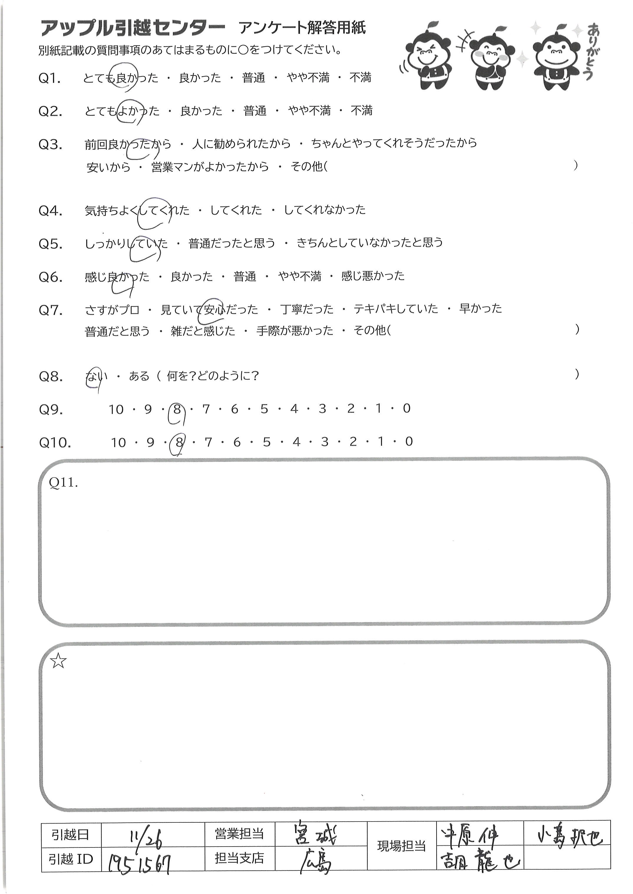 A.現場で引っ越しを担当してくださった方はとても丁寧で親切であったため しかし、引っ越し荷物等の事前確認は電話での疑問のみで見にくること もなかったので、多少の不安があるため、Q9は7点にした