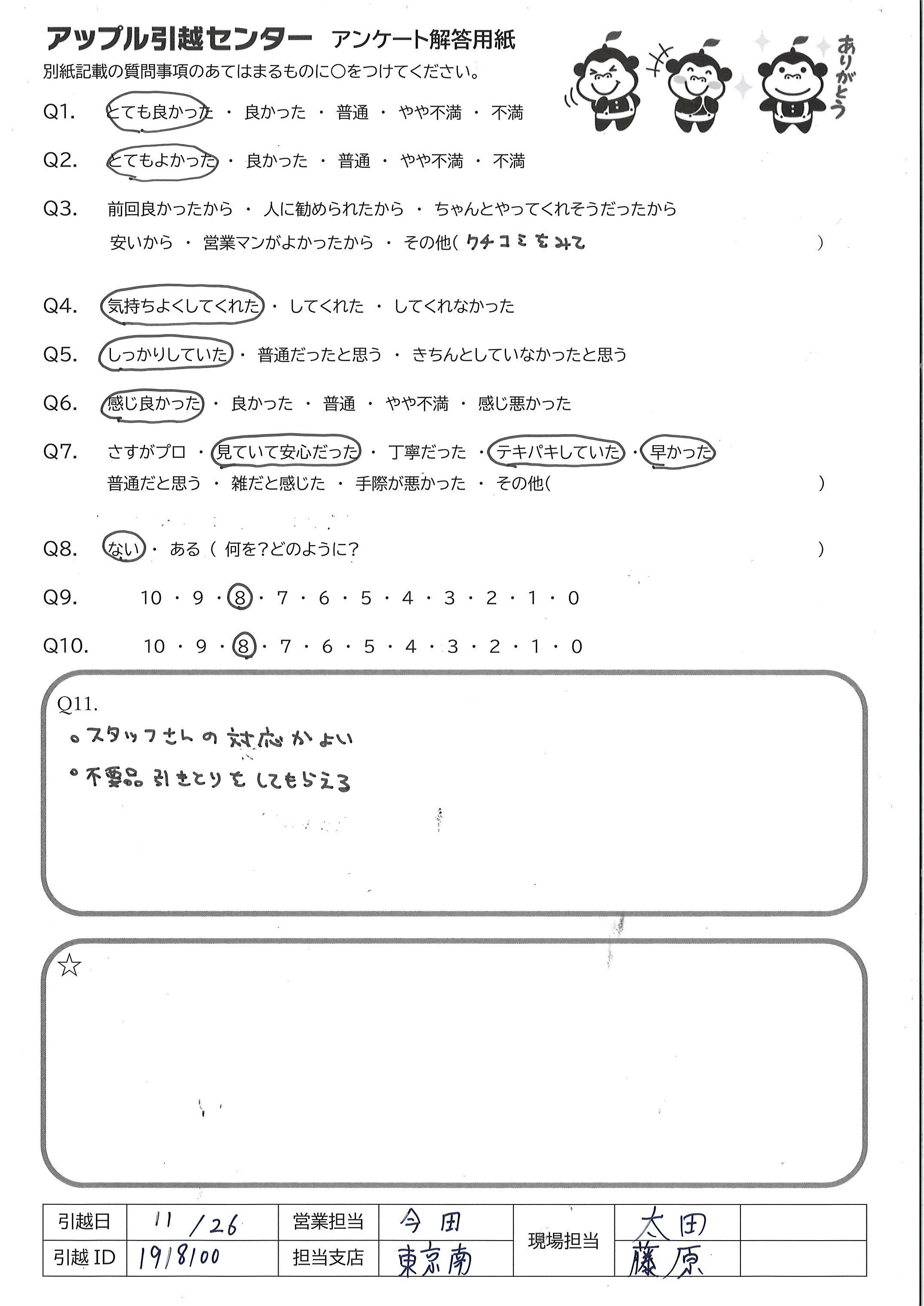 A.テレビのトラブルはありましたが、概ね対応は良く、スムースに引越しが出来ました。ありがとうございました。
