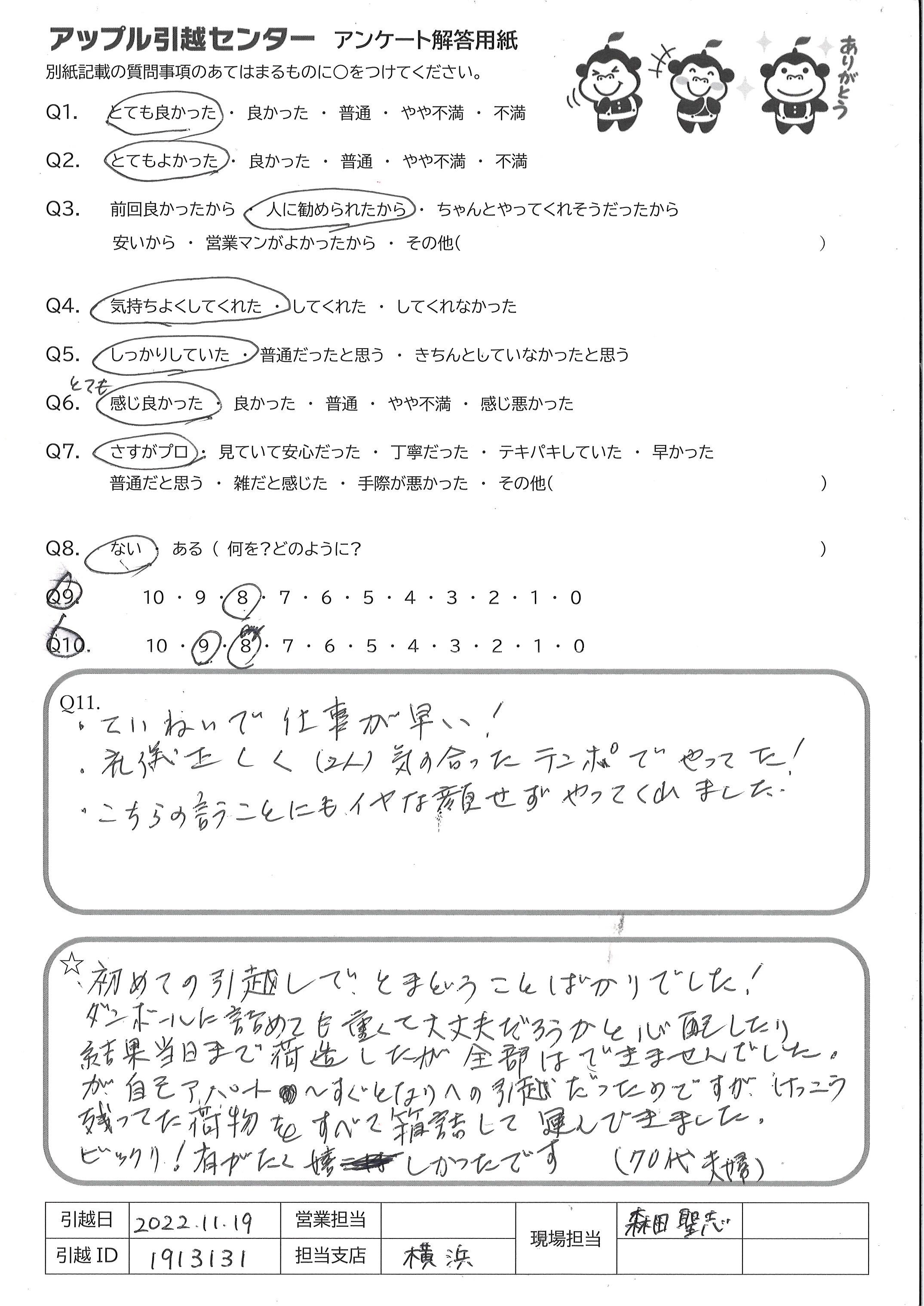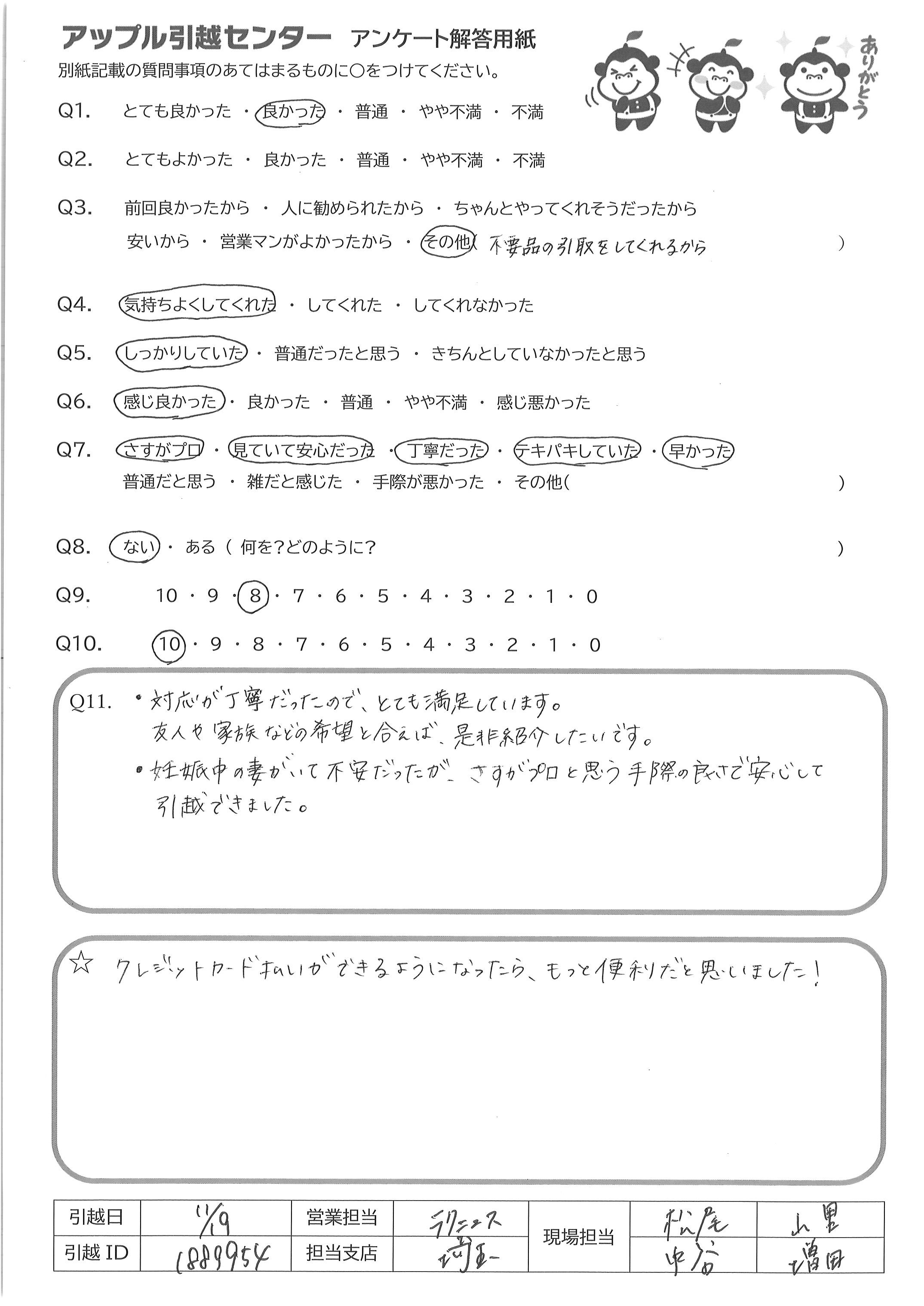 A.・対応が丁寧だったので、とても満足しています。 友人や家族などの希望と合えば是非紹介したいです ・妊娠中の妻がいて不安だったが、さすがプロと思う手際の良さで安心して 引越できました