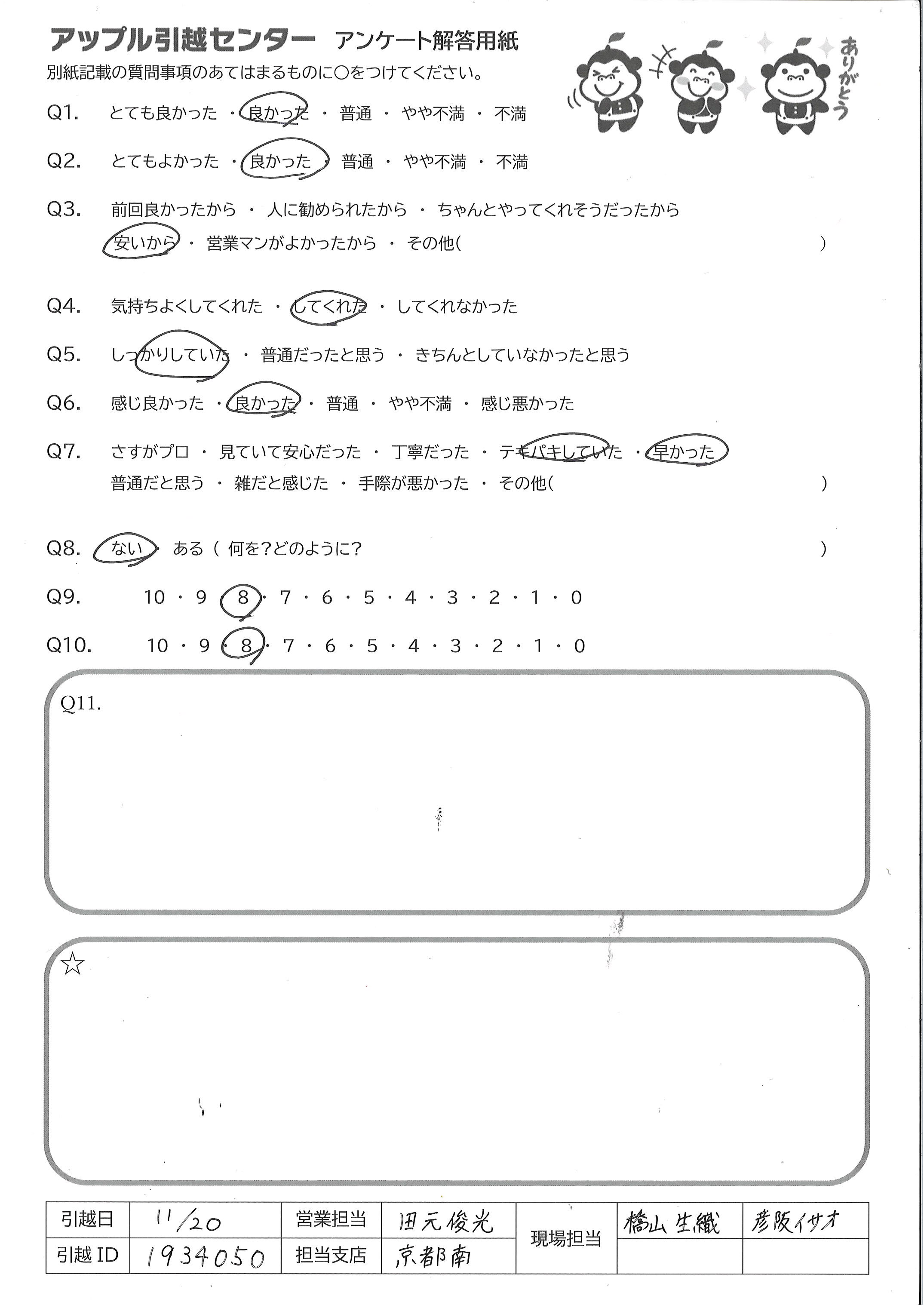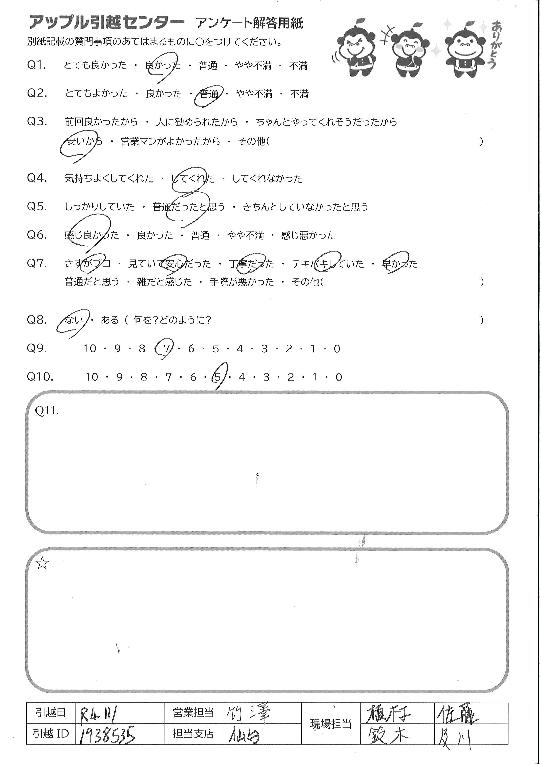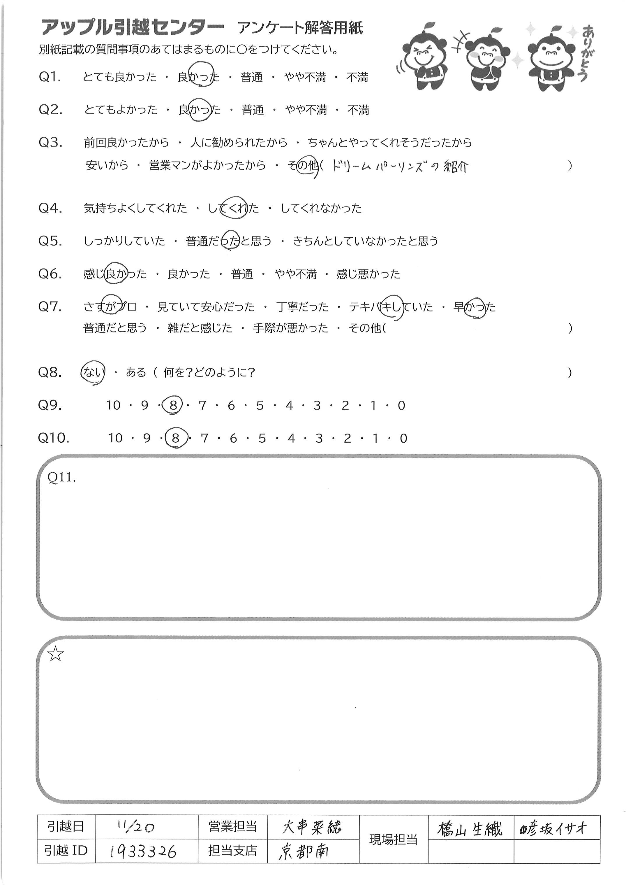 A.おおむね満足していますが、ソファが新居に搬入出来なかった。私が把握していなかったのも悪いが、実はもっと解体でき、他社では指示せずとも解体してくれていたようだった。今回は自分で解体し搬入した。 あとは、領収書が会社控えだったらしく、夜取りに来ていたので、そこは残念でした。
