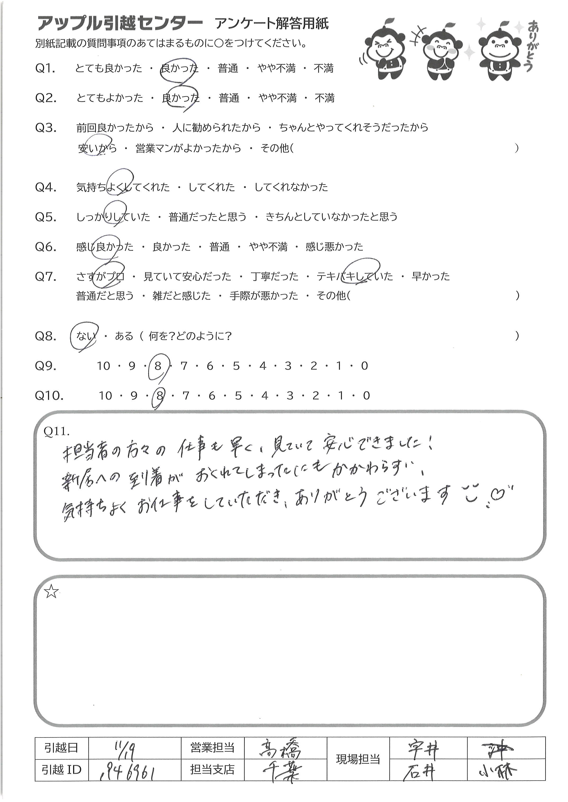 A.担当者の方々の仕事も速く、見ていて、安心できました! 新居への到着がおくれてしまったにもかかわらず 気持ちよくお仕事をしていただき、ありがとうございます