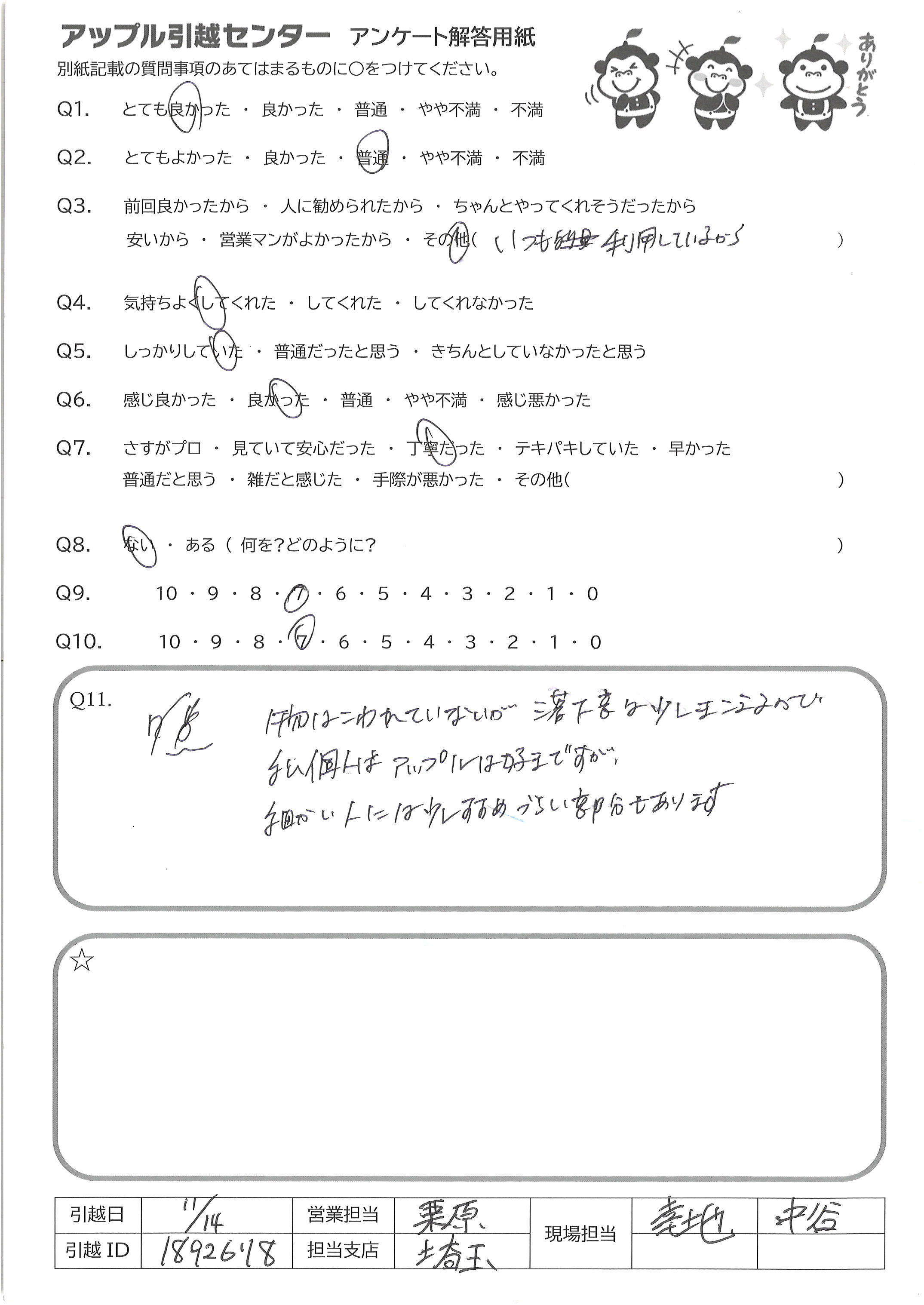 A.1日3件回る日だったようで、エレベーターなしの2階から4階の引っ越しで大変だったかと思います。 迅速ながら丁寧に対応するのは大変だと思いますが、私はとてもちょうどいいコミニケーションでありがたかったです。 また転居することがあればお願いします!