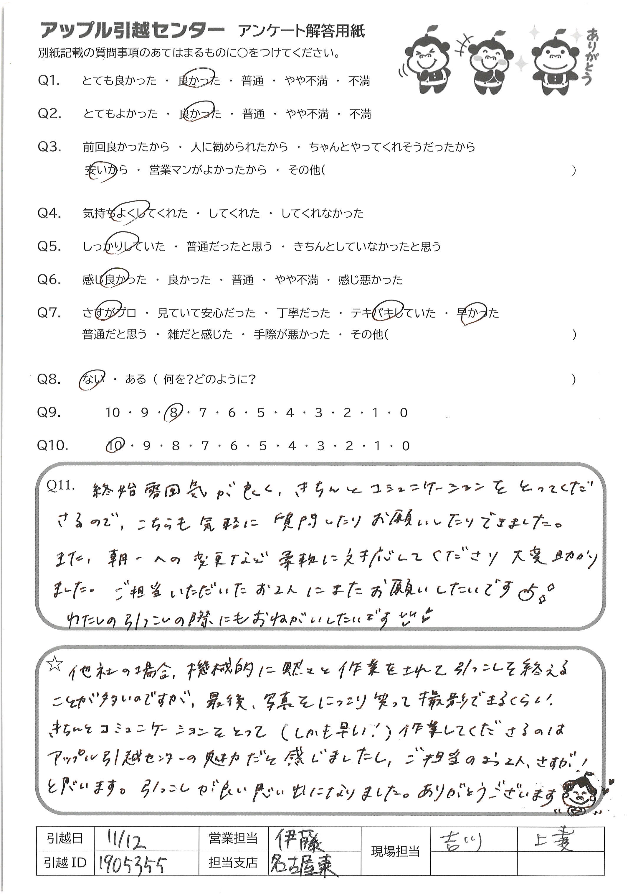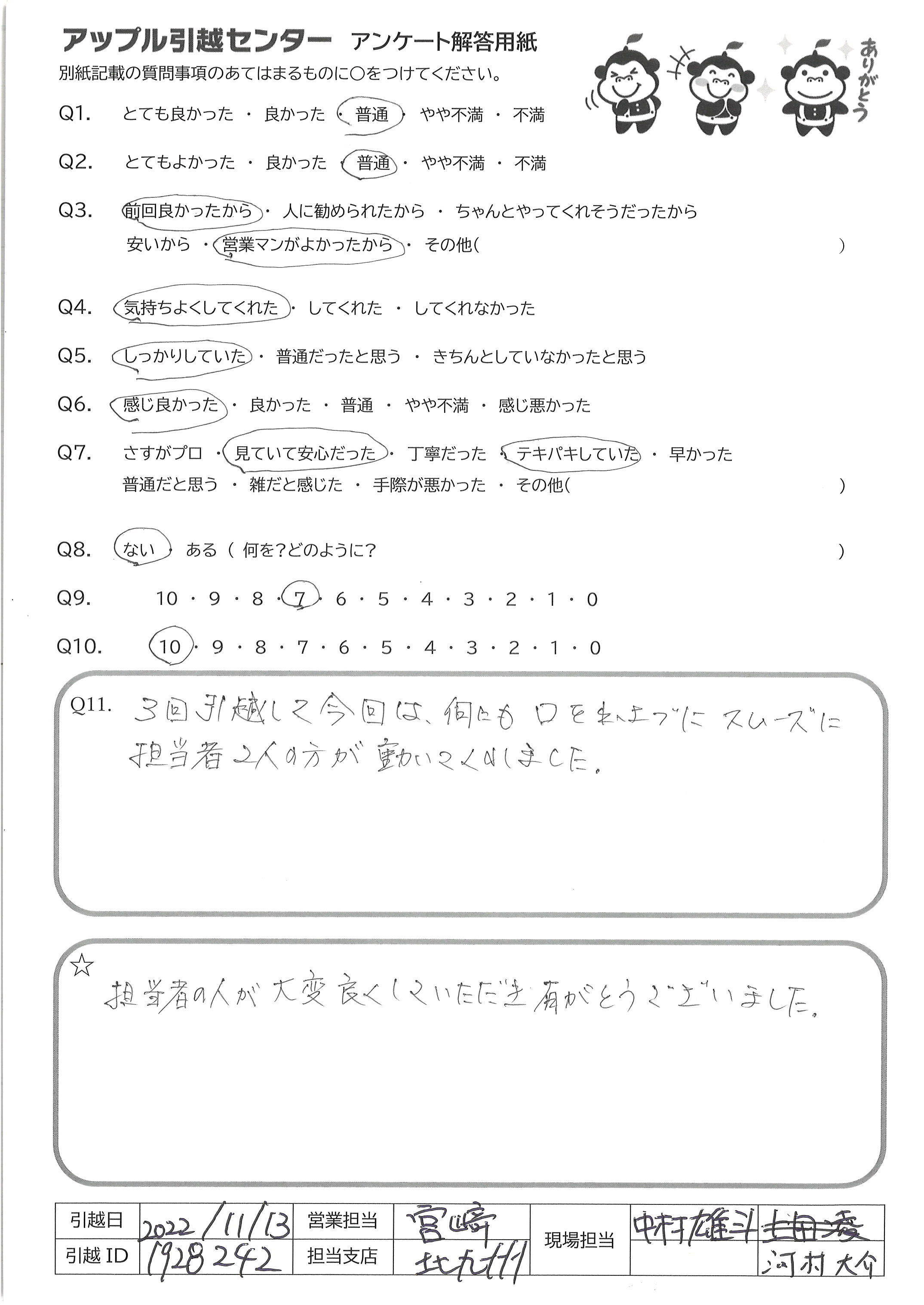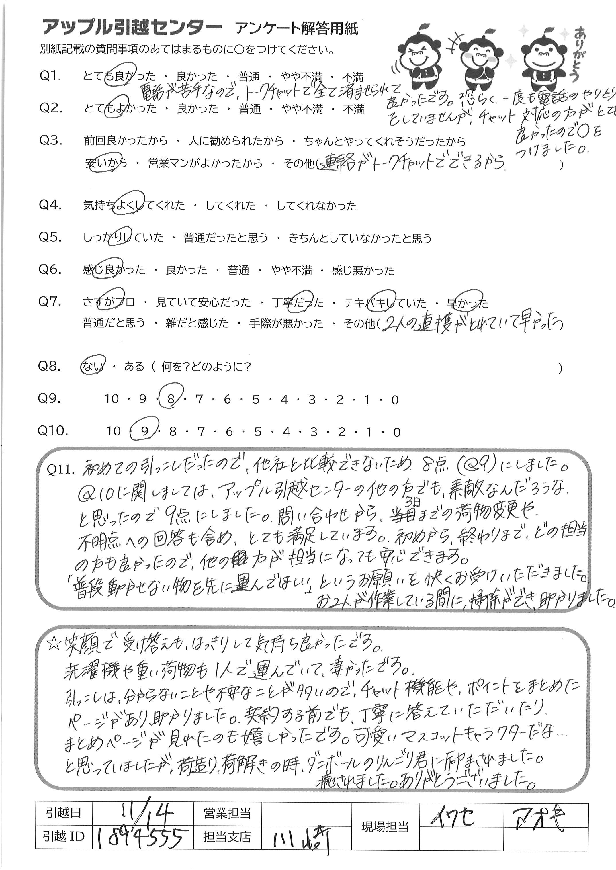 A.初めての引っこしだったので他社と比較できないため、8点(Q9)いしました Q10に関しましては、アップル引越センターの他の方でも、素敵なんだろうな と思ったので9点にしました。問い合わせから3日までの荷物変更や 不明点への回答も含め、とても満足しています。初めから終わりまでどの担当の方も良かったので、他の方が担当になっても安心できます。 「普段動かせない物を運んでほしい」というお願いを快くお受けいただきました。 お2人が作業している間に掃除ができ、助かりました
