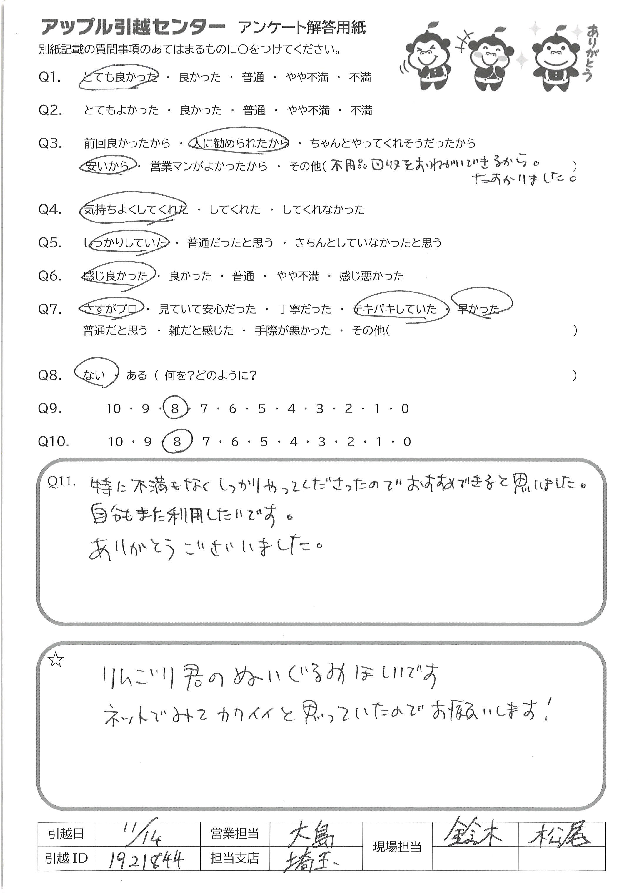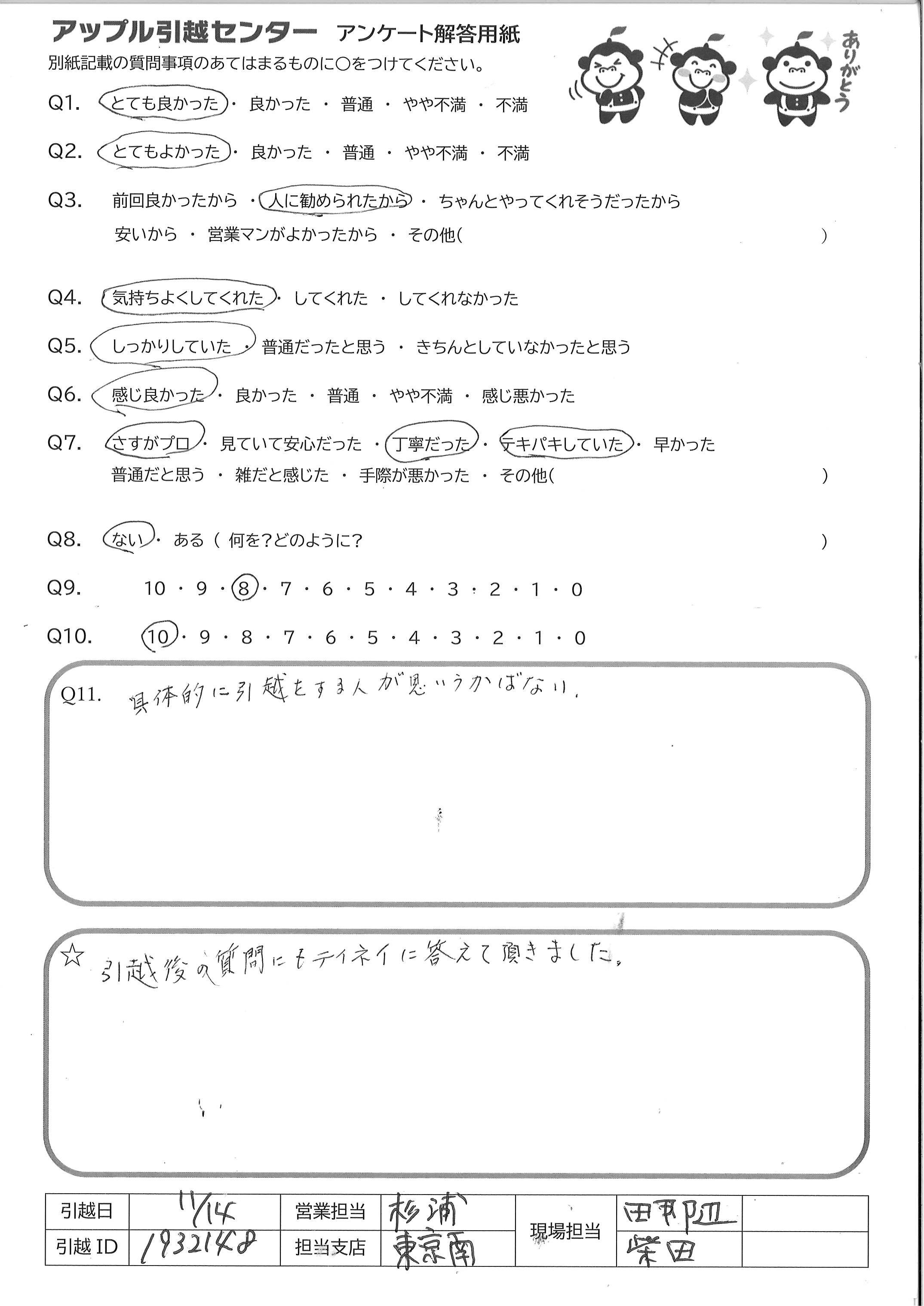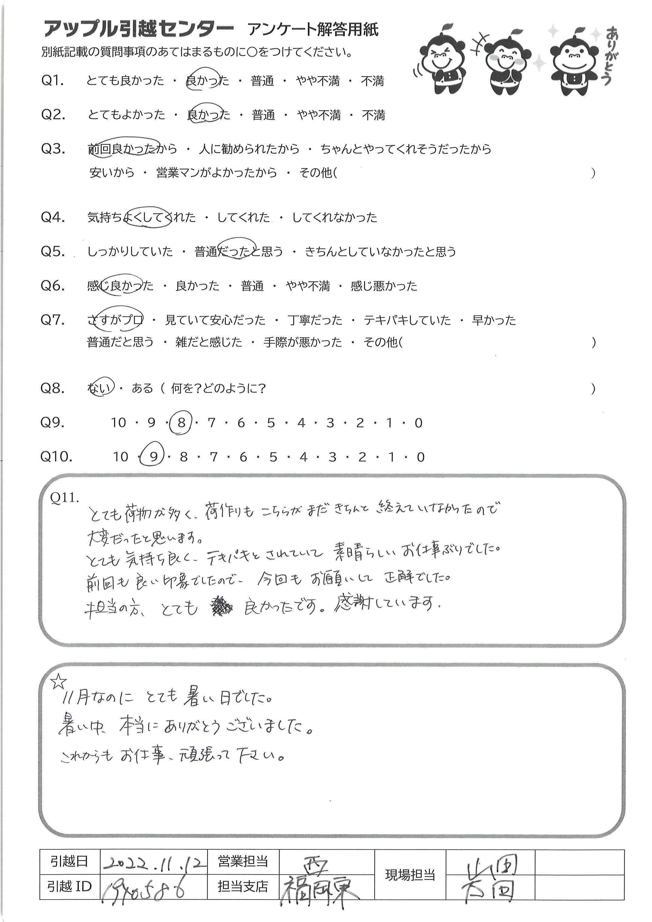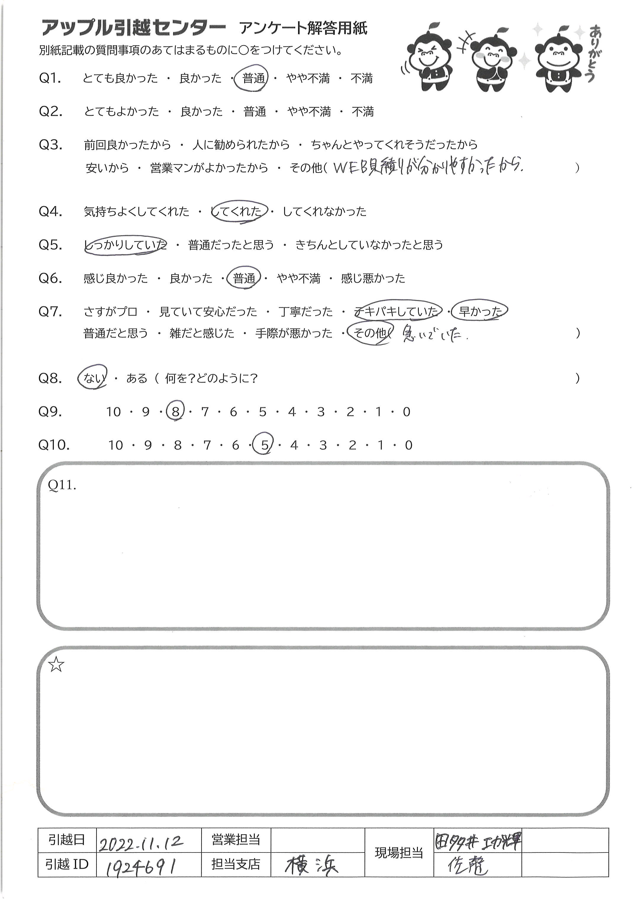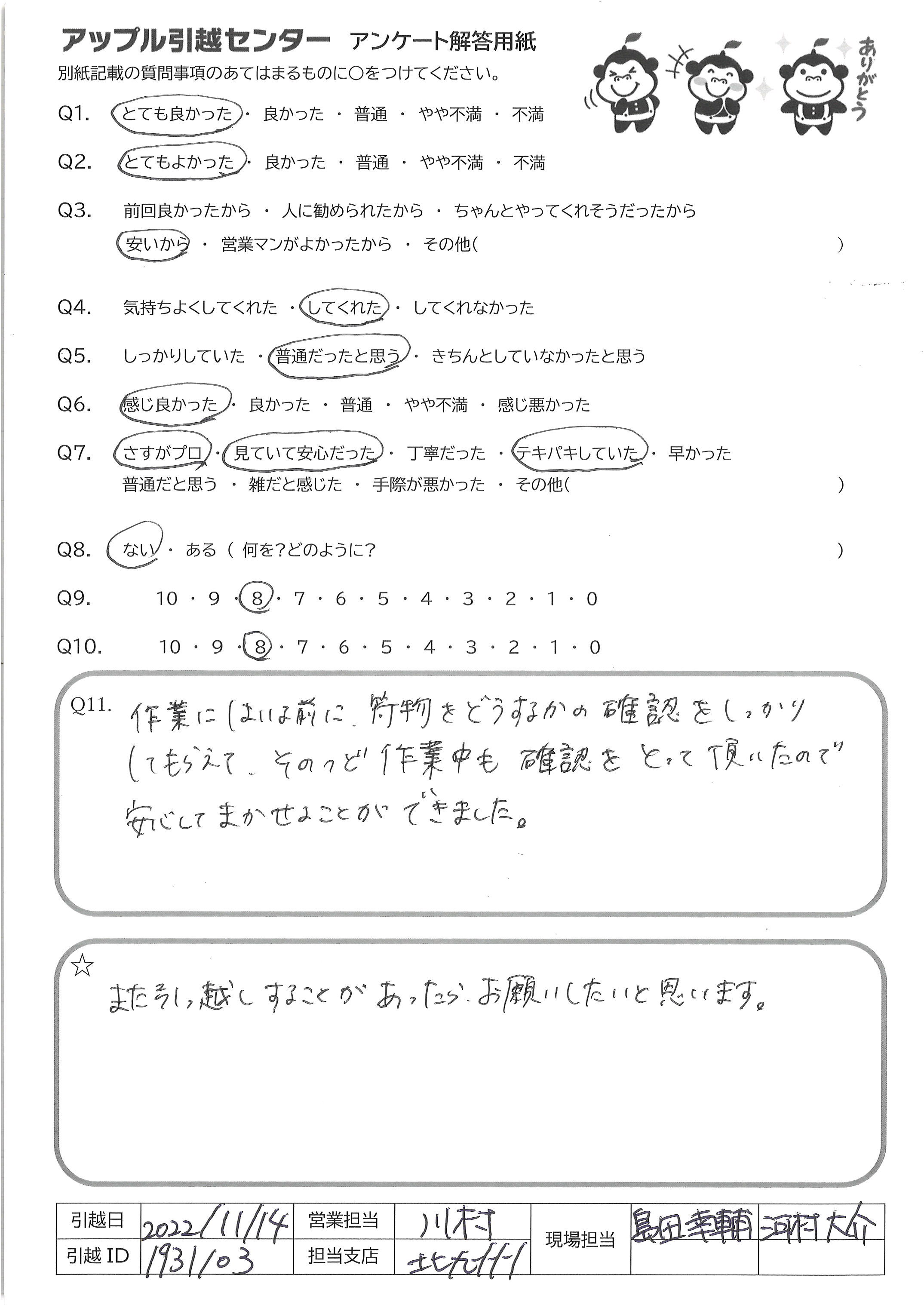 A.丁寧かつ速やかに作業をして頂きありがとうございました。 また、引越しをする際はアップルさんにお願いしたいと思います。 ありがとうございました。