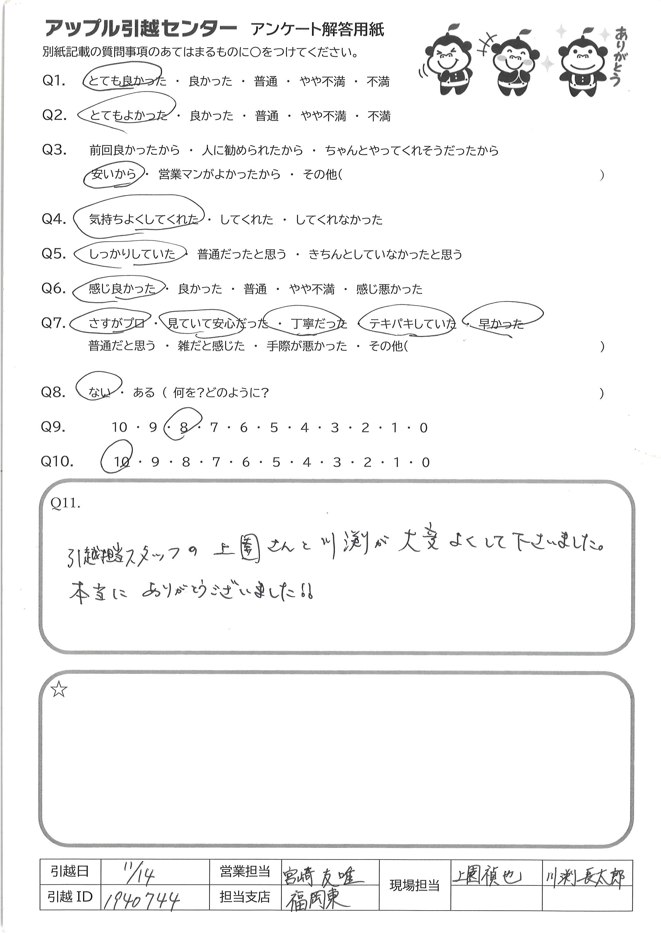 A.引越担当スタッフの上園さんと川渕が大変よくしてくださいました 本当にありがとうございました!!