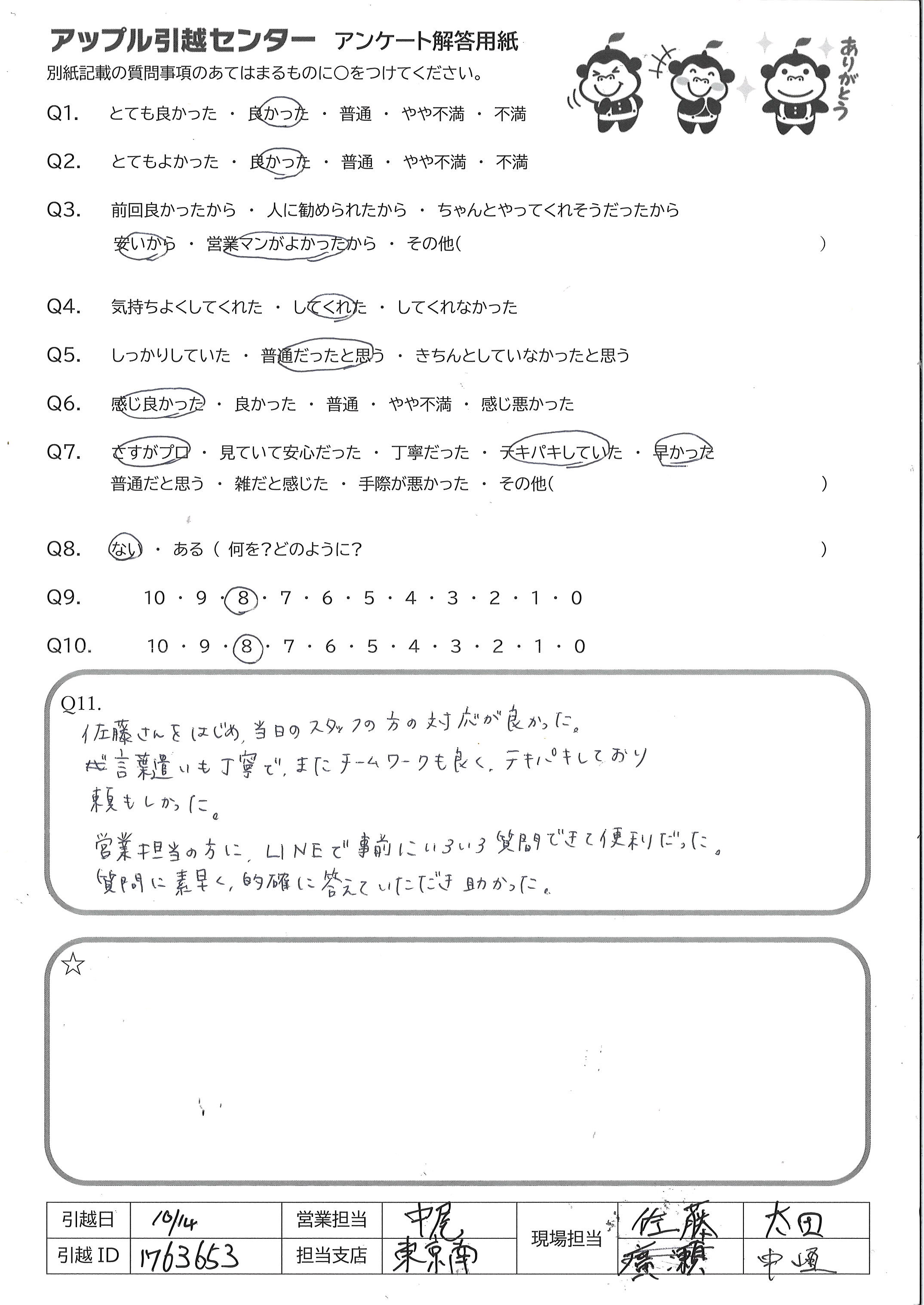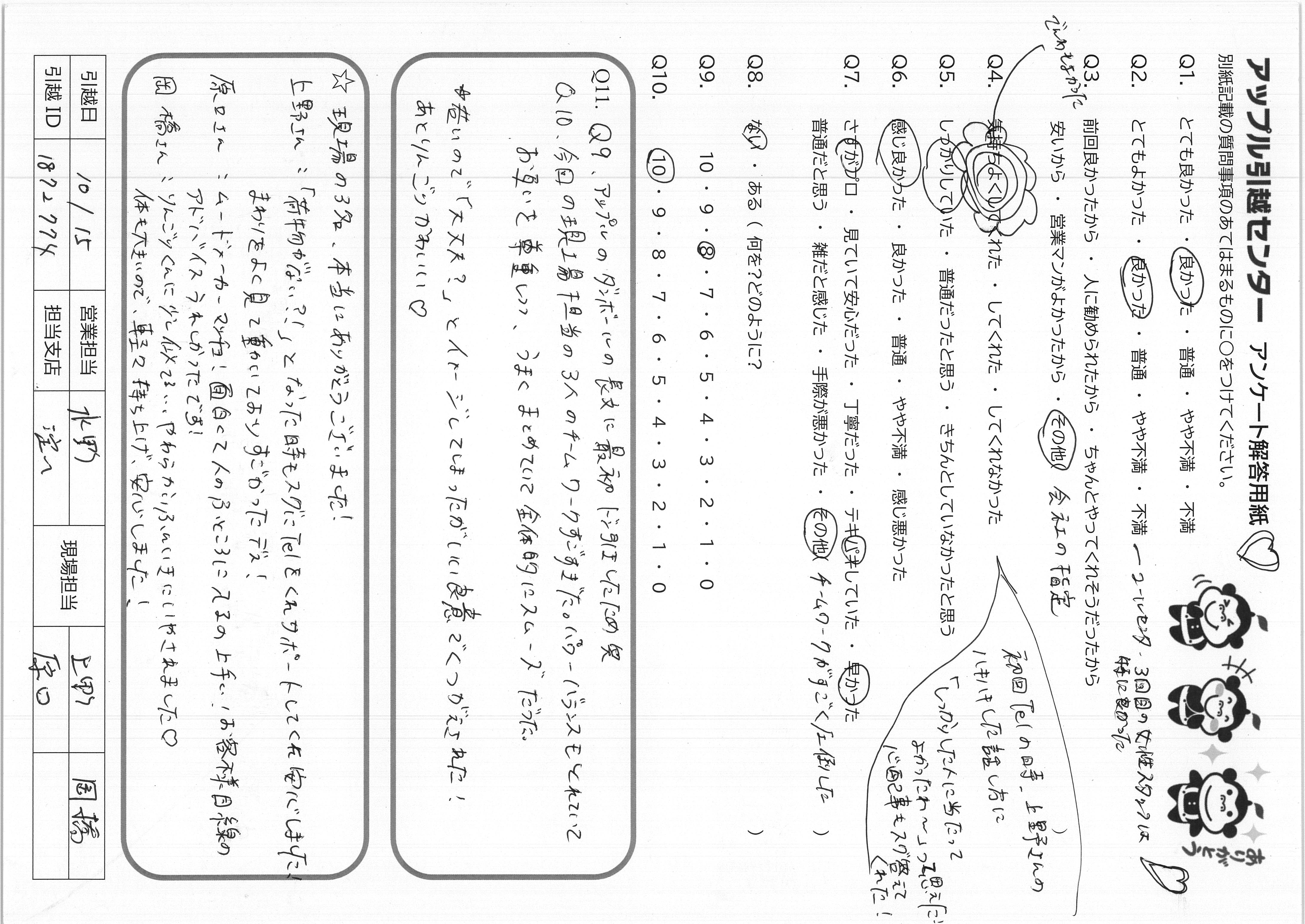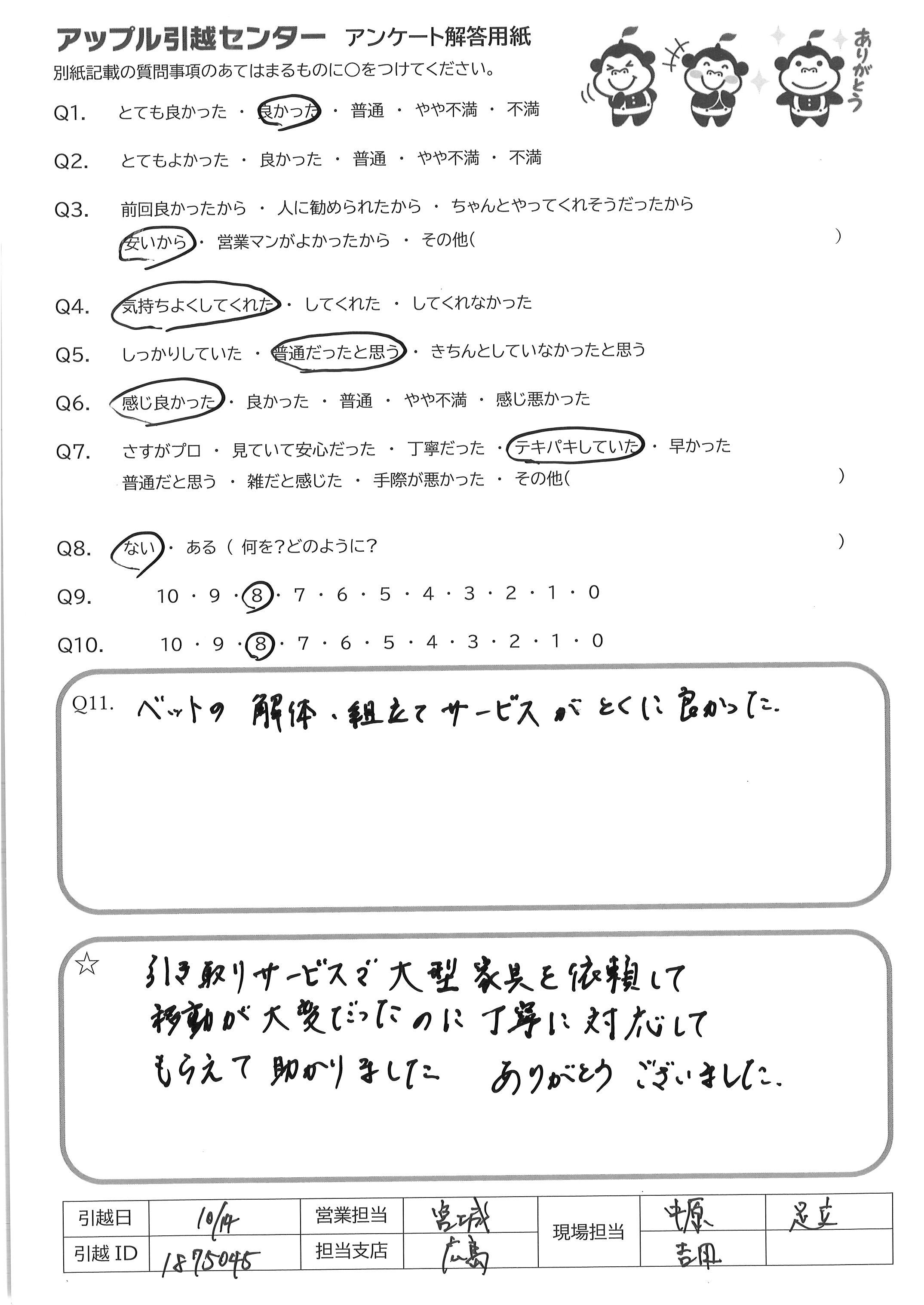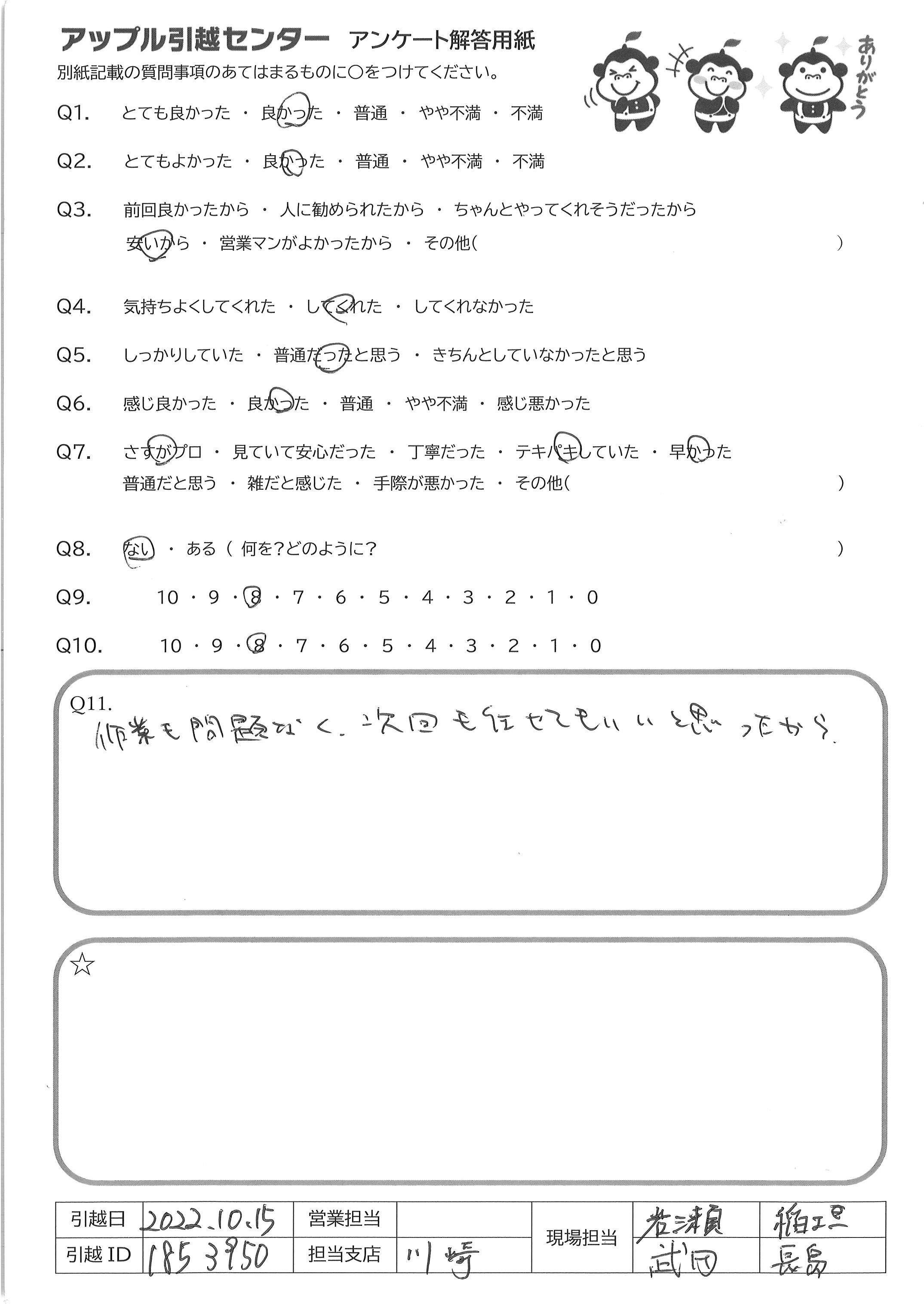 A.初めて利用させていただきましたが、傷や壊れたものもなく全体的には本当に満足です! 次回引越しすることあればぜひアップルさんで再度お任せしたいです。 ネットで見積もりが完結するのもとても便利で助かりました。 特にメール対応して下さった荒井様、大田区営業所の3名の作業スタッフの方々には感謝しかありません。 本当にありがとうございました!