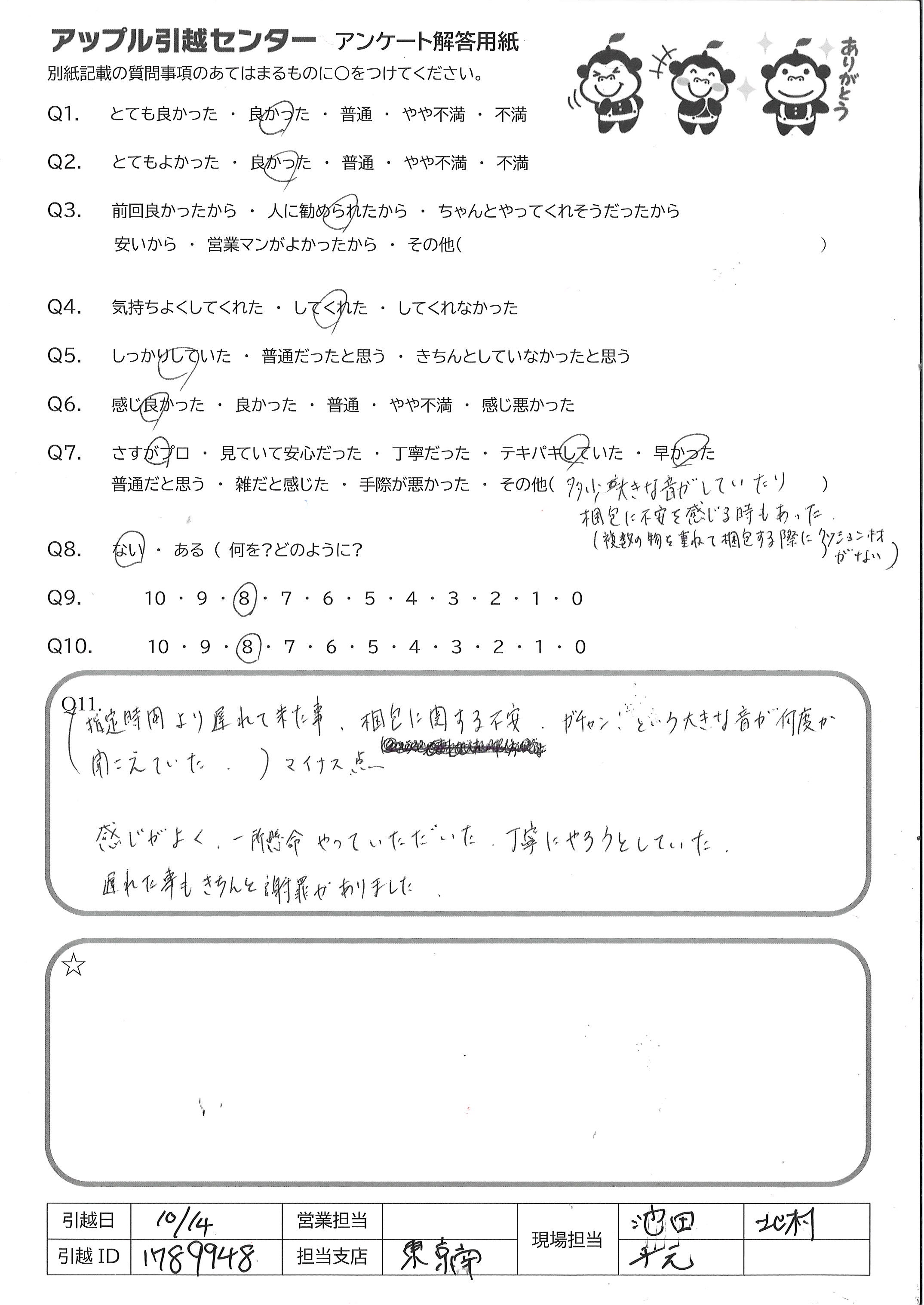 A.現場の3名、本当にありがとうございました! 上野さん:「荷物がない?!」となった時もスグにTELをくれサポートしてくれ安心しました まわりをよく見て動いておりすごかったデス! 原口さん:ムードメーカー マッチョ!面白くて人のふところに入るの上手い! お客様目線の アドバイスうれしかったです! 岡橋さん:りんごりくんに少し似ている・・・やわらかいふにきにやされました♡ 身体も大きいので軽々持ちあげ、安心しました!
