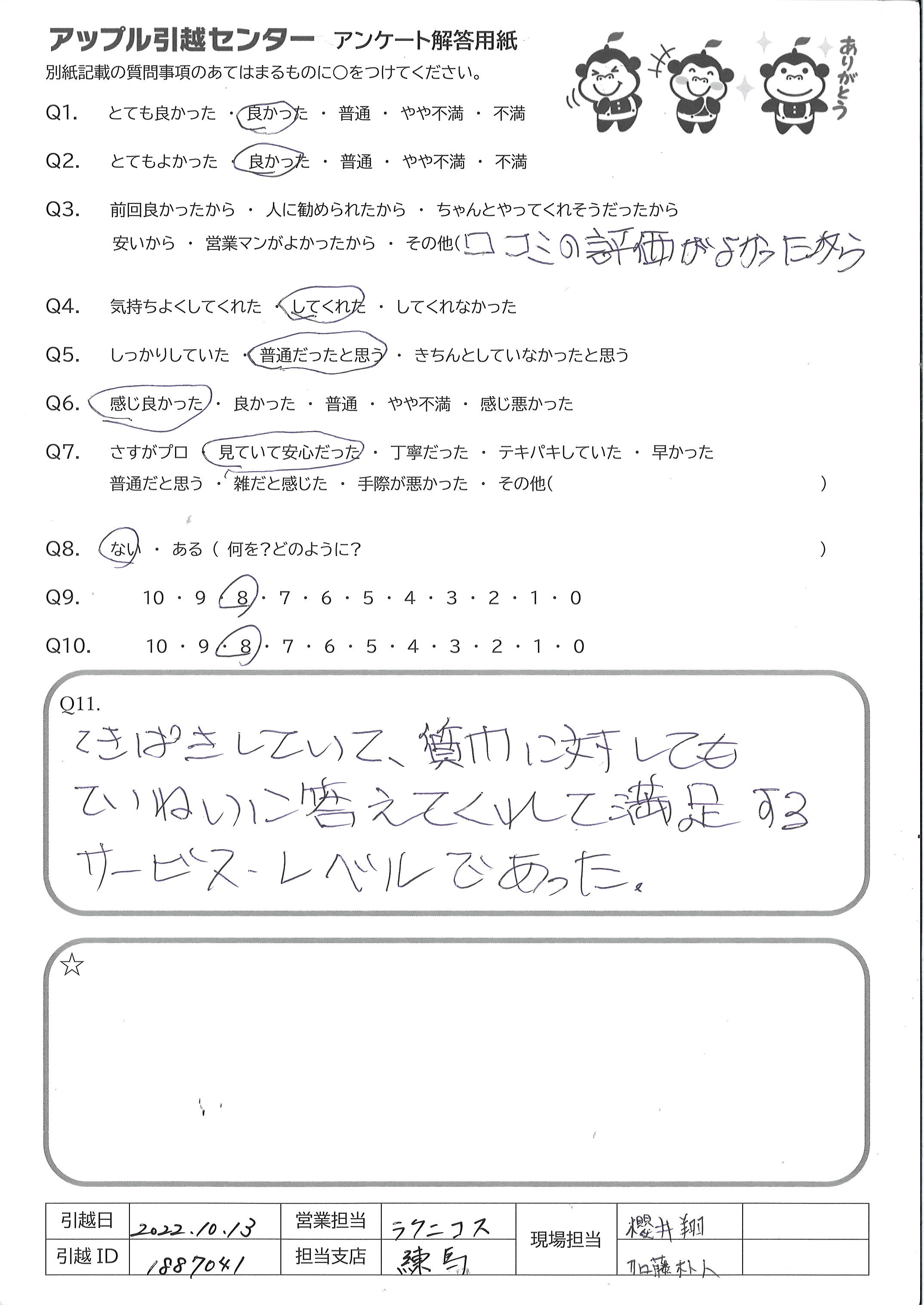 A.2回目の利用でしたが、迅速、丁寧な仕事ぶりで安心してお任せすることができました。 今後引っ越しする機会がありましたら、その時はよろしくお願いします。