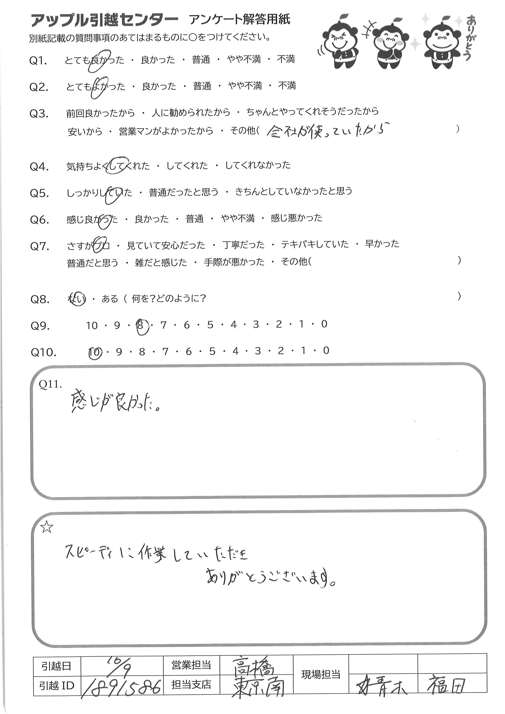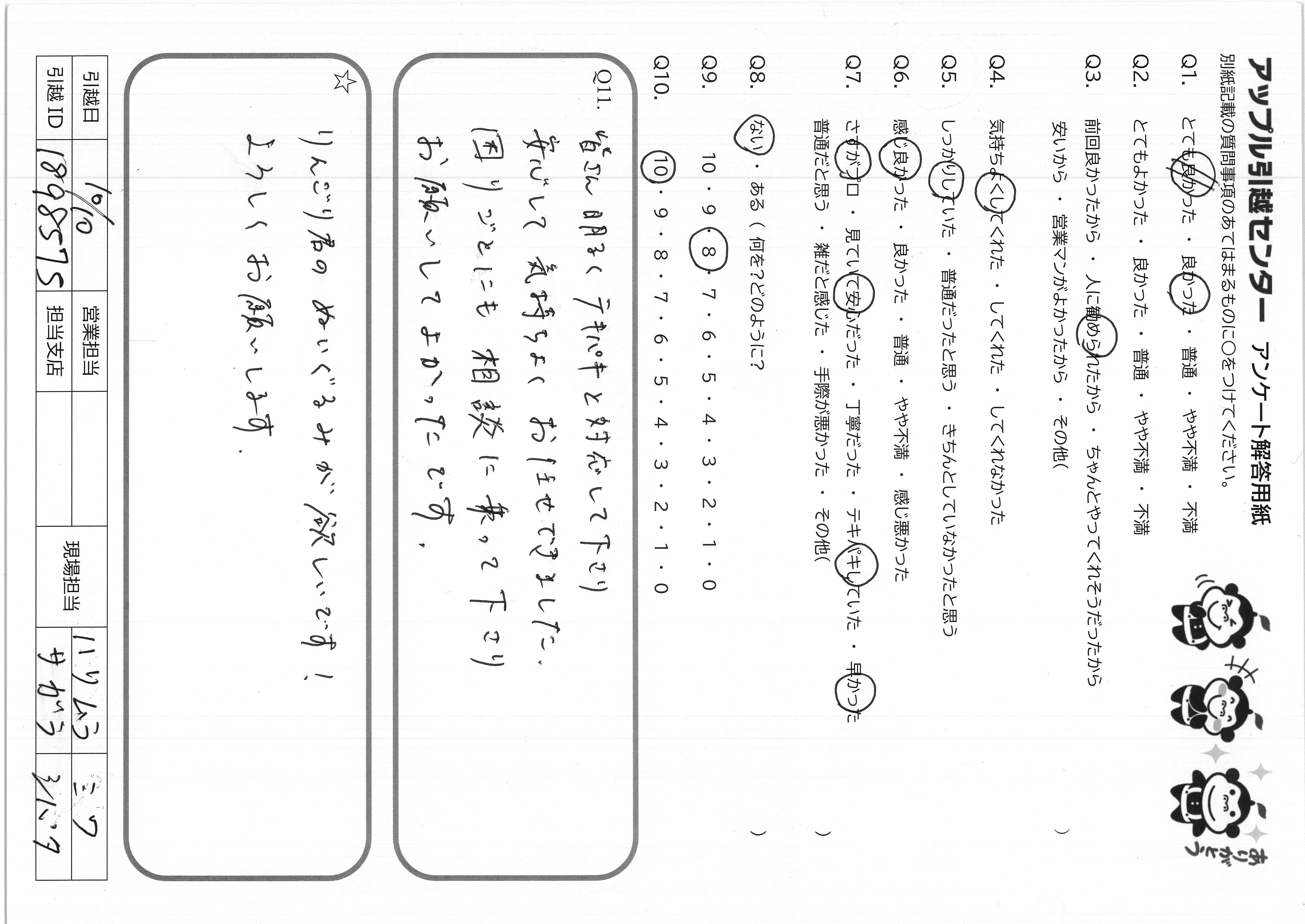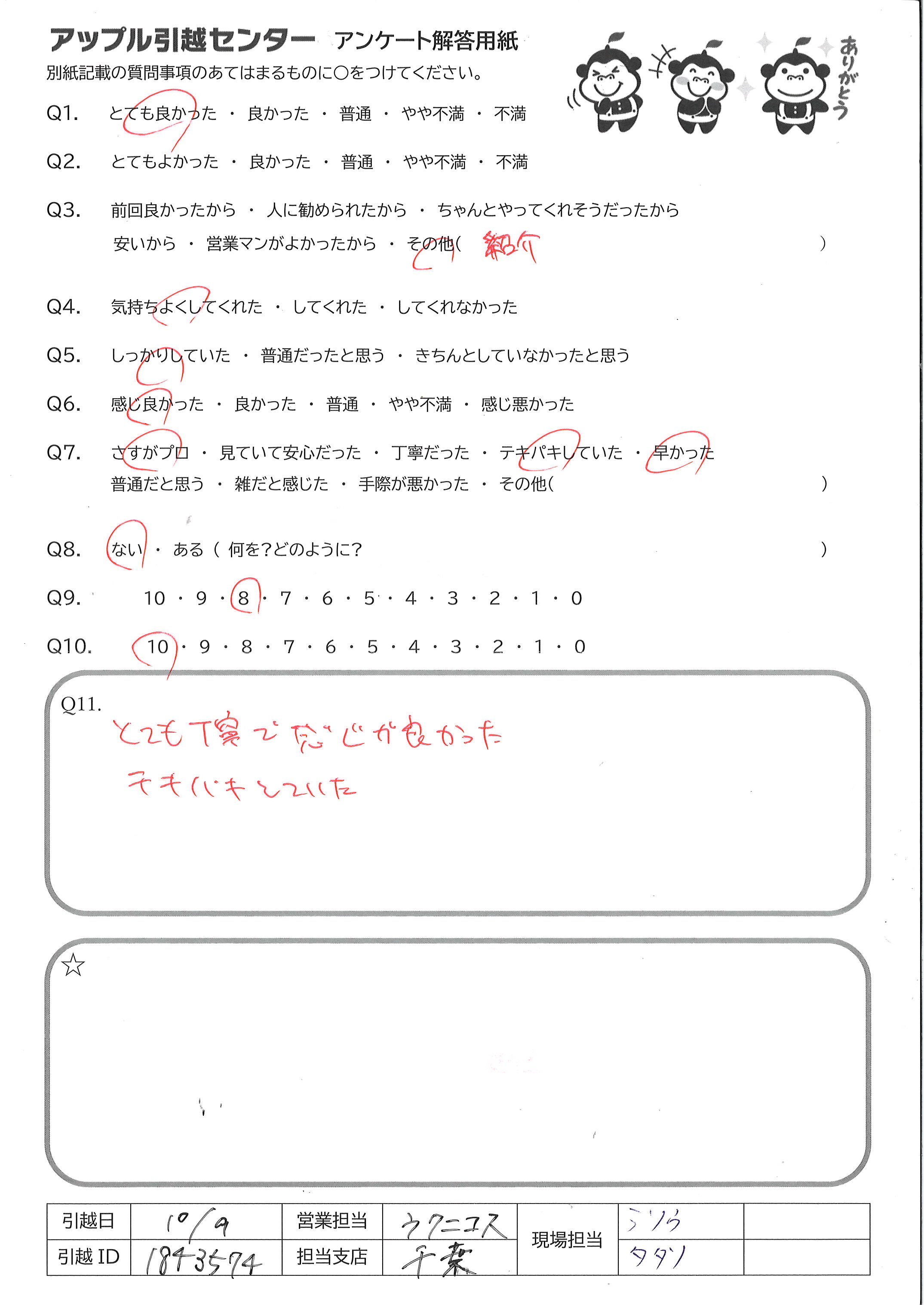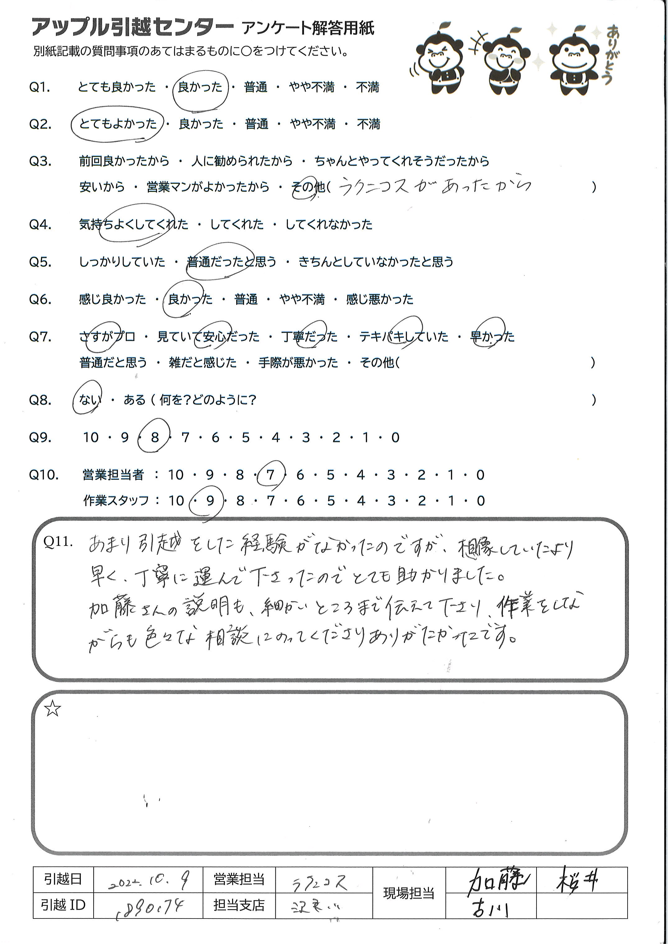 A.あまり引越をした経験がなかったのですが、想像していたより 早く、丁寧に運んで下さったのでとても助かりました 加藤さんの説明も細かいところまで伝えて下さり、作業をしな がらも色々な相談にのってくださりありがたかったです