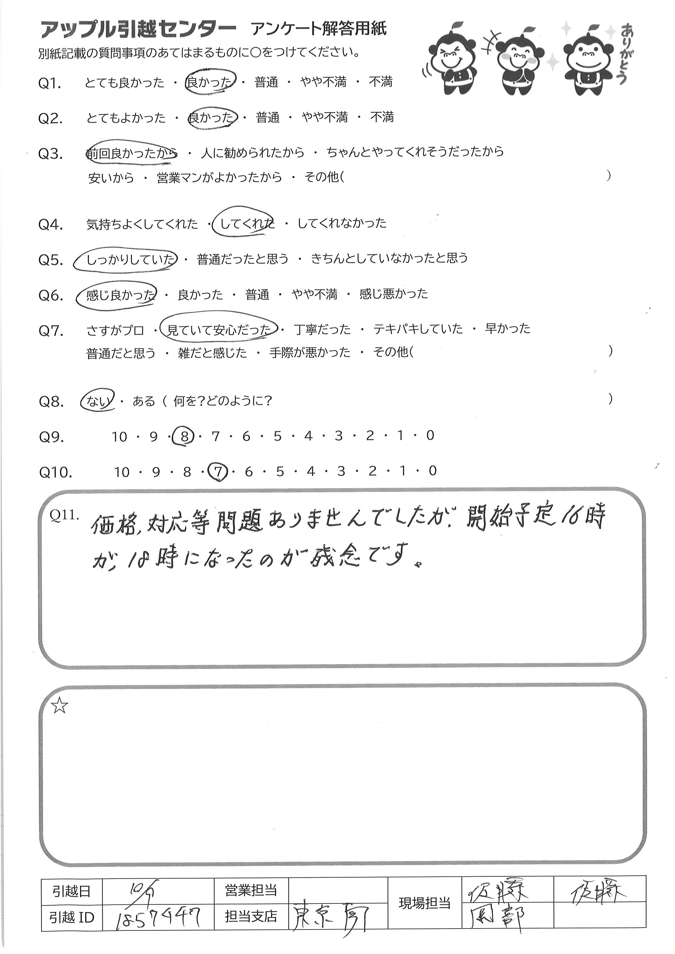 A.仕事が丁寧でとても早かったです。荷物全てが梱包済みでは無かったのですが、柔軟に対応していただけて助かりました。引越しはもっと時間がかかると思っていましたが、半日で完了。おかげで開梱に時間をかけることが出来ました。人当たりの優しいスタッフの方で安心してお任せ出来ました。ありがとうございました。