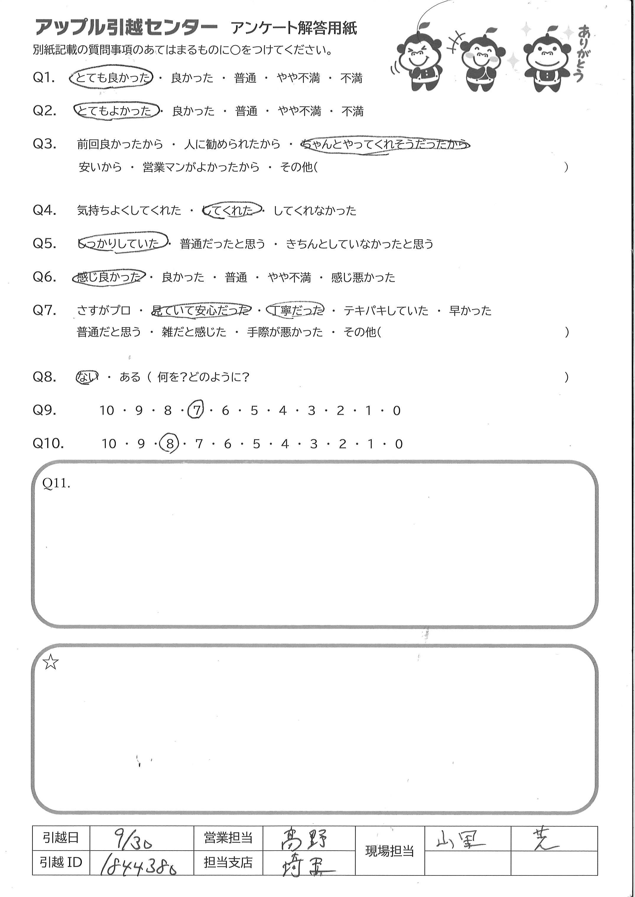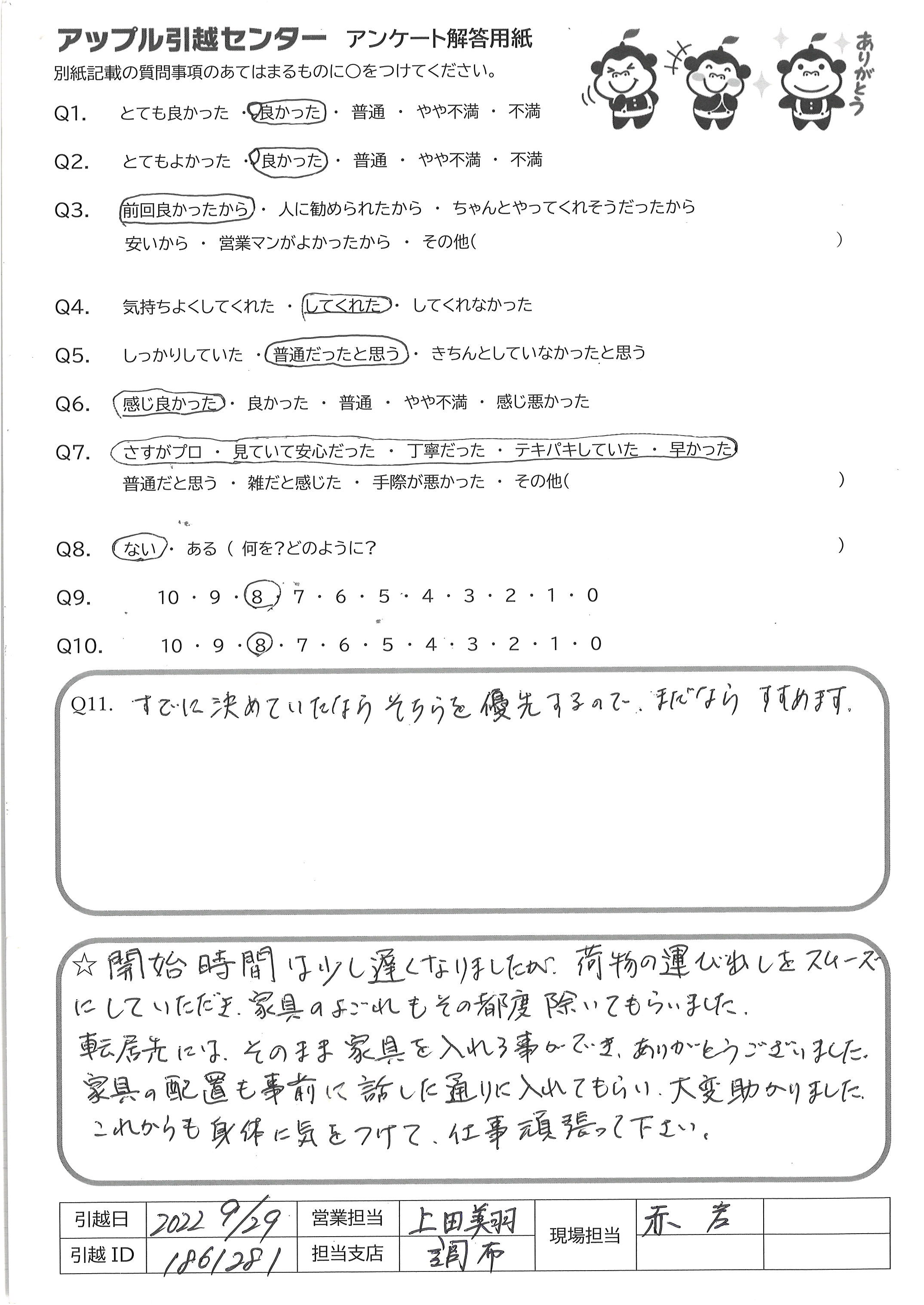 A.こちらの荷物量が多かったこともありご迷惑をお掛けしました。 遅くまで、いやな顔をせずに丁寧にご対応をしてくださり、おかげさまでなんとか入居が完了したので感謝しております。 ただ、上野さんでない方(おそらく新人の方)が運び出しをしてくださった洗濯ラックでの紛失や一部家財の破損があったことと、人数も一人少なかったですが、前回の方々と比べてペースが遅く感じたので満点ではなく少し減点をさせていただきました。