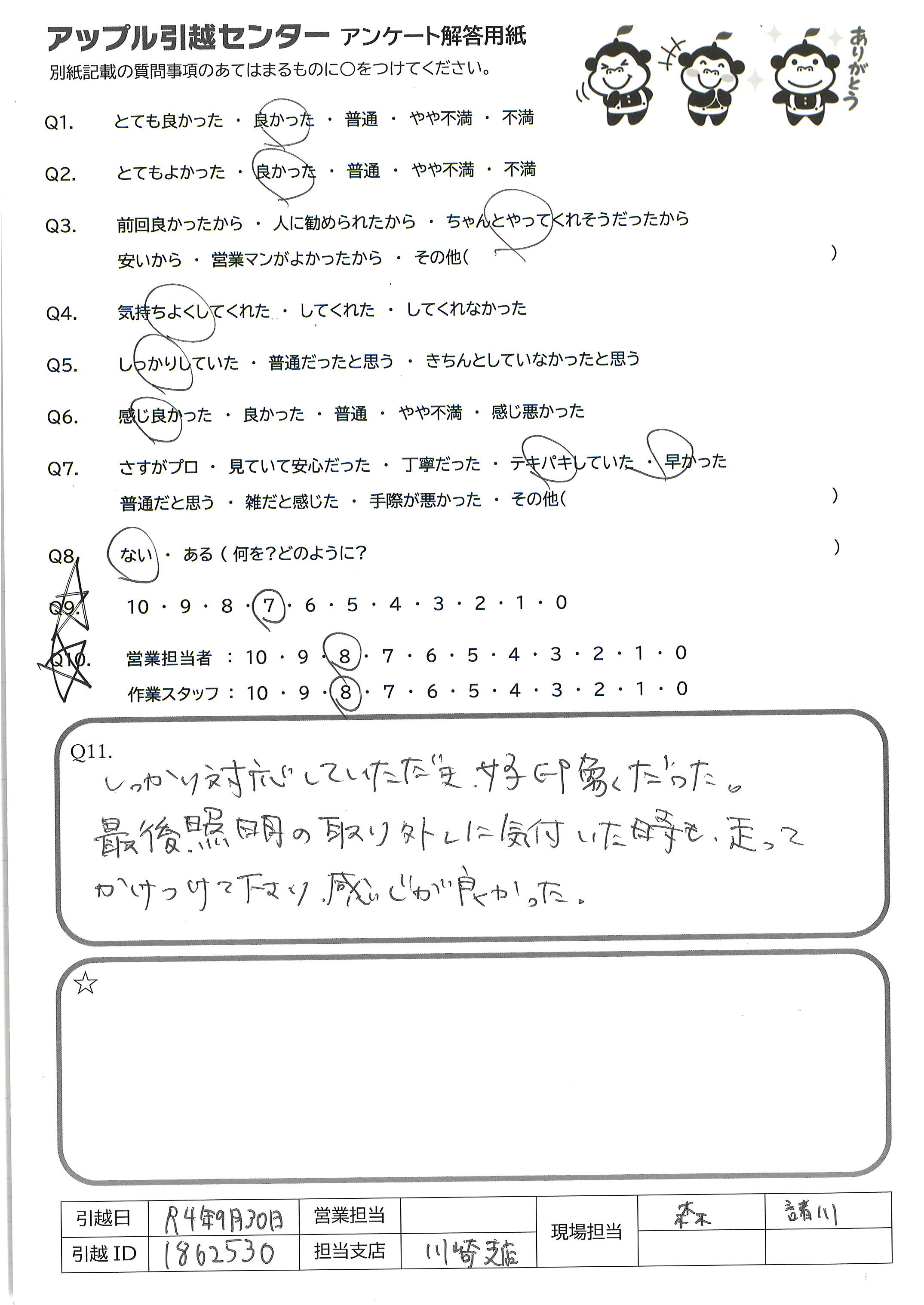 A.無事に転居が完了をし、大変感謝しております。 急遽応援で他のスタッフの方のお力も借りることになり、大変恐縮です。 一方で、できうることを最大限していただいたのですが、当初の予定時間と大幅に乖離してしまったので、こちらも前住所と新住所とを複数回往復することになってしまいましたので、予定が狂ってしまいました。 次の日もお休みだったこともあり、とにかく遅くなってもその日のうちに無事に転居が完了したので良かったですが、多少追加の費用が発生しても破損、紛失がなく予定の時間で終わるとありがたかったです。 担当のスタッフさんによって差があるかとは思いますが、非常に感じ良くご対応をいただき、また次回の引っ越しの際も御社を利用したいとは思っております。 減点させていただいた破損、紛失の件だけ少し残念なので何かしらご対応をいただける場合はご連絡いただけますと幸いです。 どうぞよろしくお願いいたします。