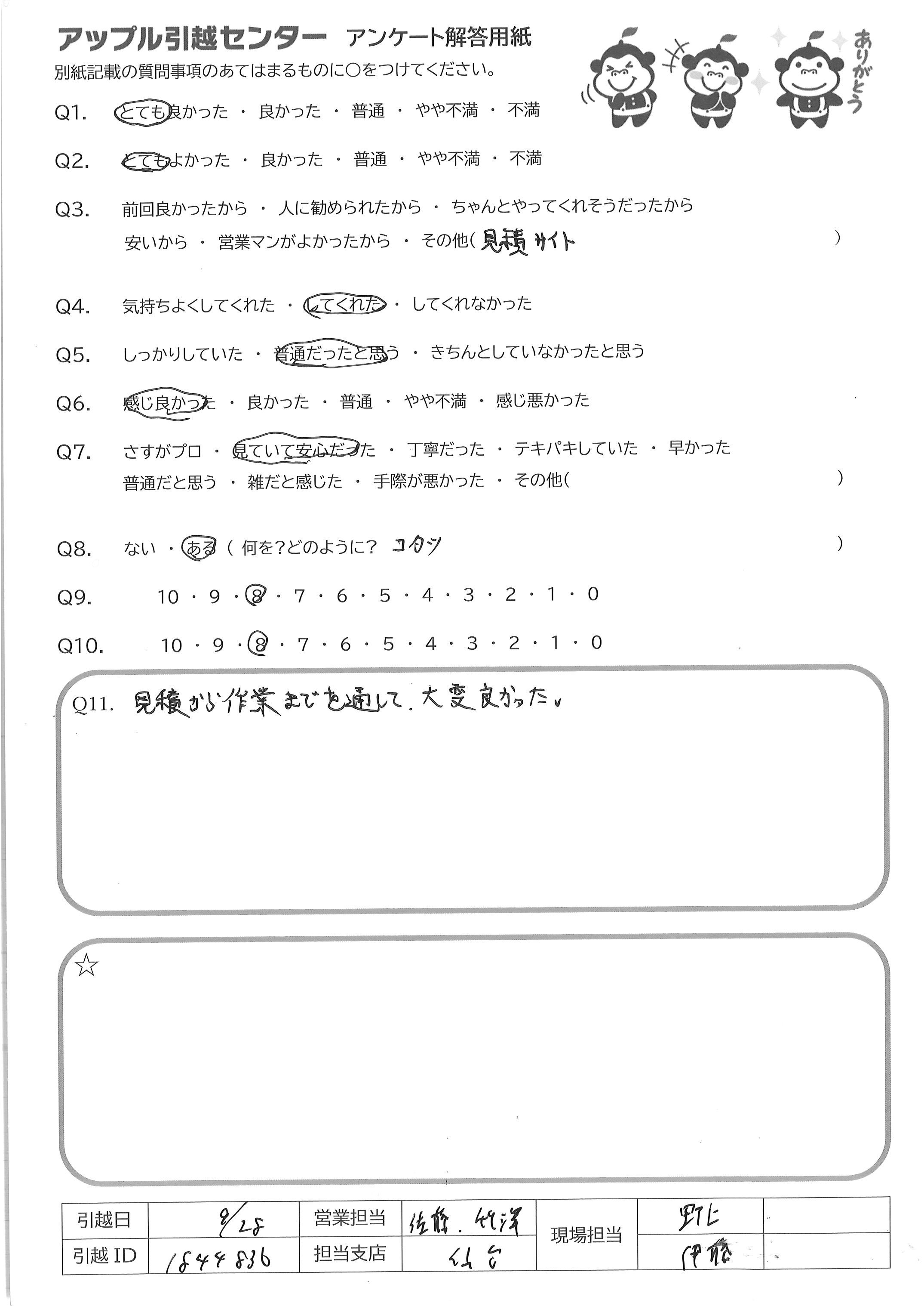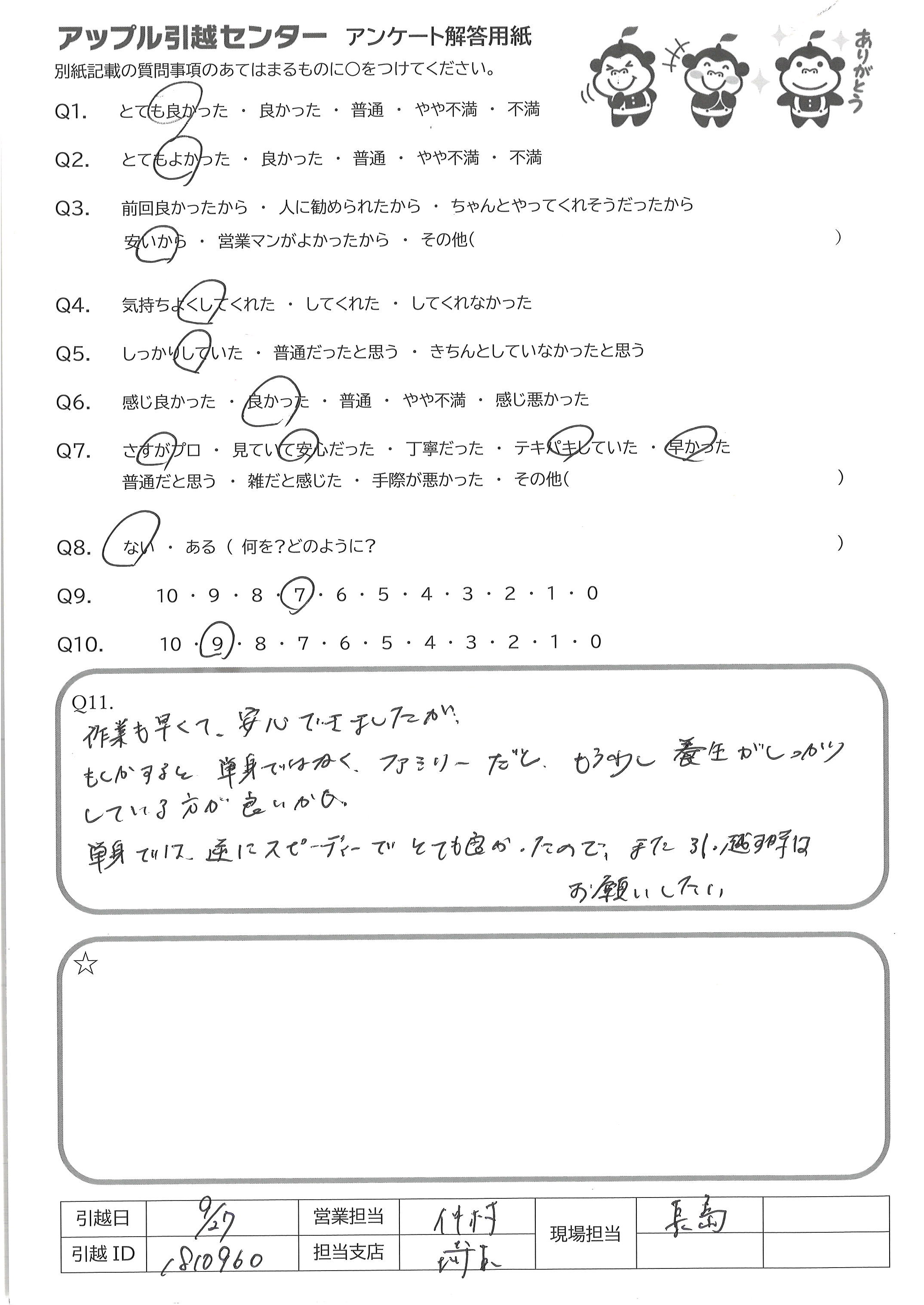 A.作業も早くて安心できましたが もしかすると単身ではなく、ファミリーだともう少し養生がしっかり している方が良いかも 単身では逆にスピーディーでとても良かったので、また引っ越す時はお願いしたい