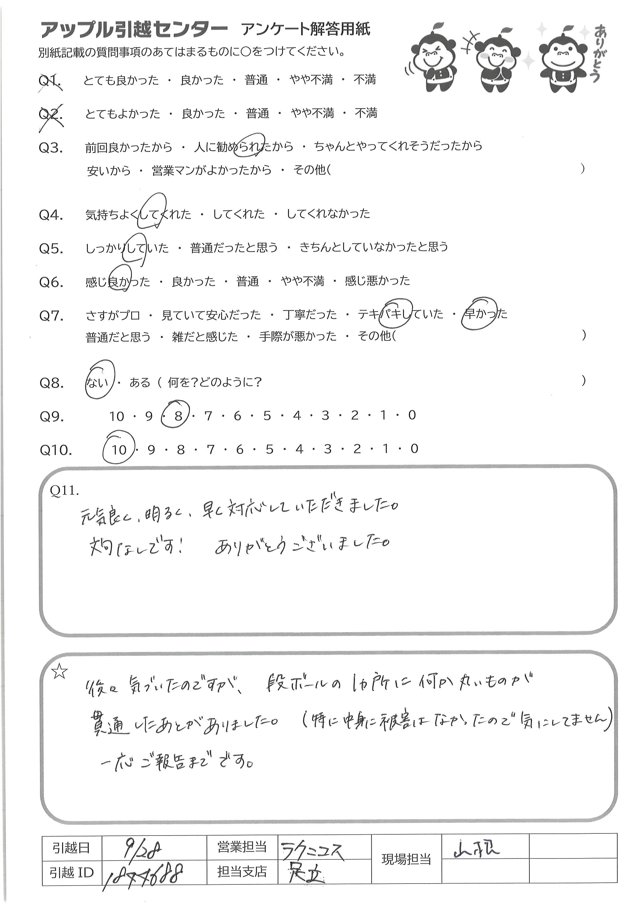 A.責任者の方はすごく感じがよかったです。 ただ一緒にいた方がマスクせずに作業していたり、私が新居に着いた時、トラックで待機中に車の前部に足を乗っけてたばこを吸っていたりで印象が悪かったです。責任者の方や他の方はすごくテキパキして素晴らしいなと思っていただけに残念でした。
