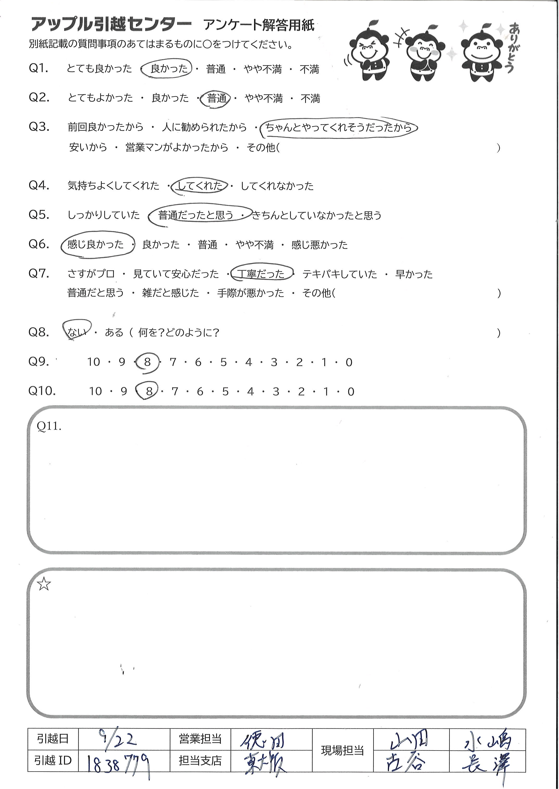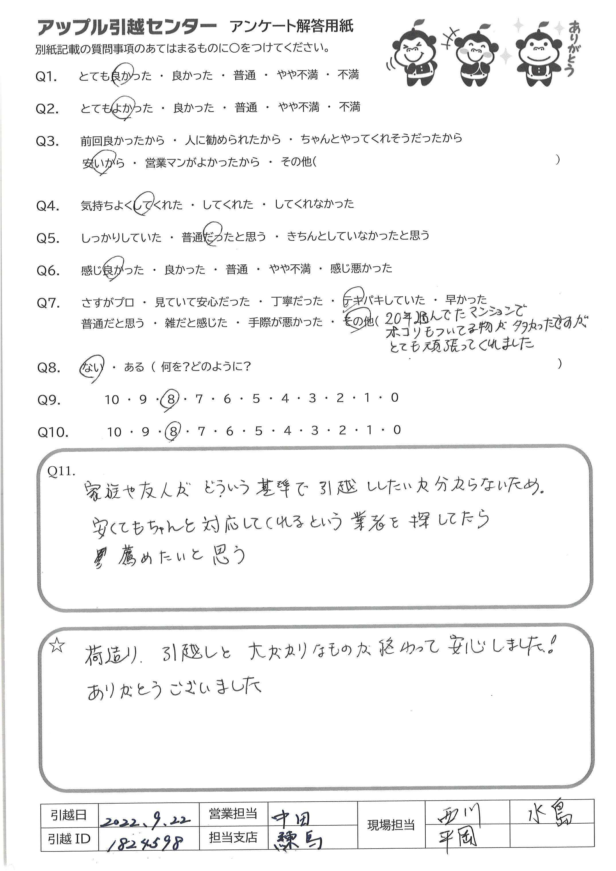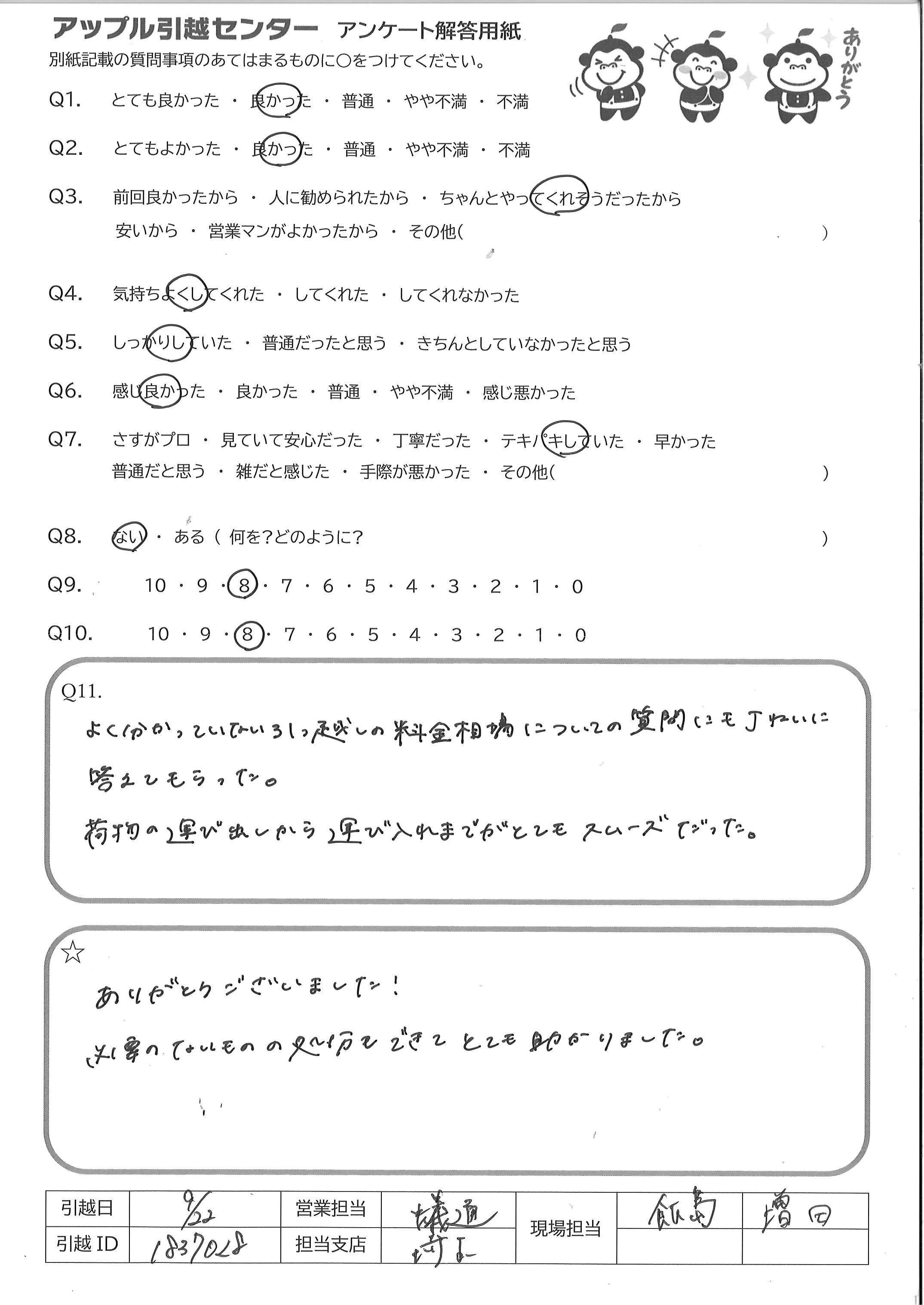 A.よく分かっていない引っ越しの料金相場についての質問にも丁ねいに 答えてもらった 荷物の運び出しから運び入れまでがとてもスムーズだった