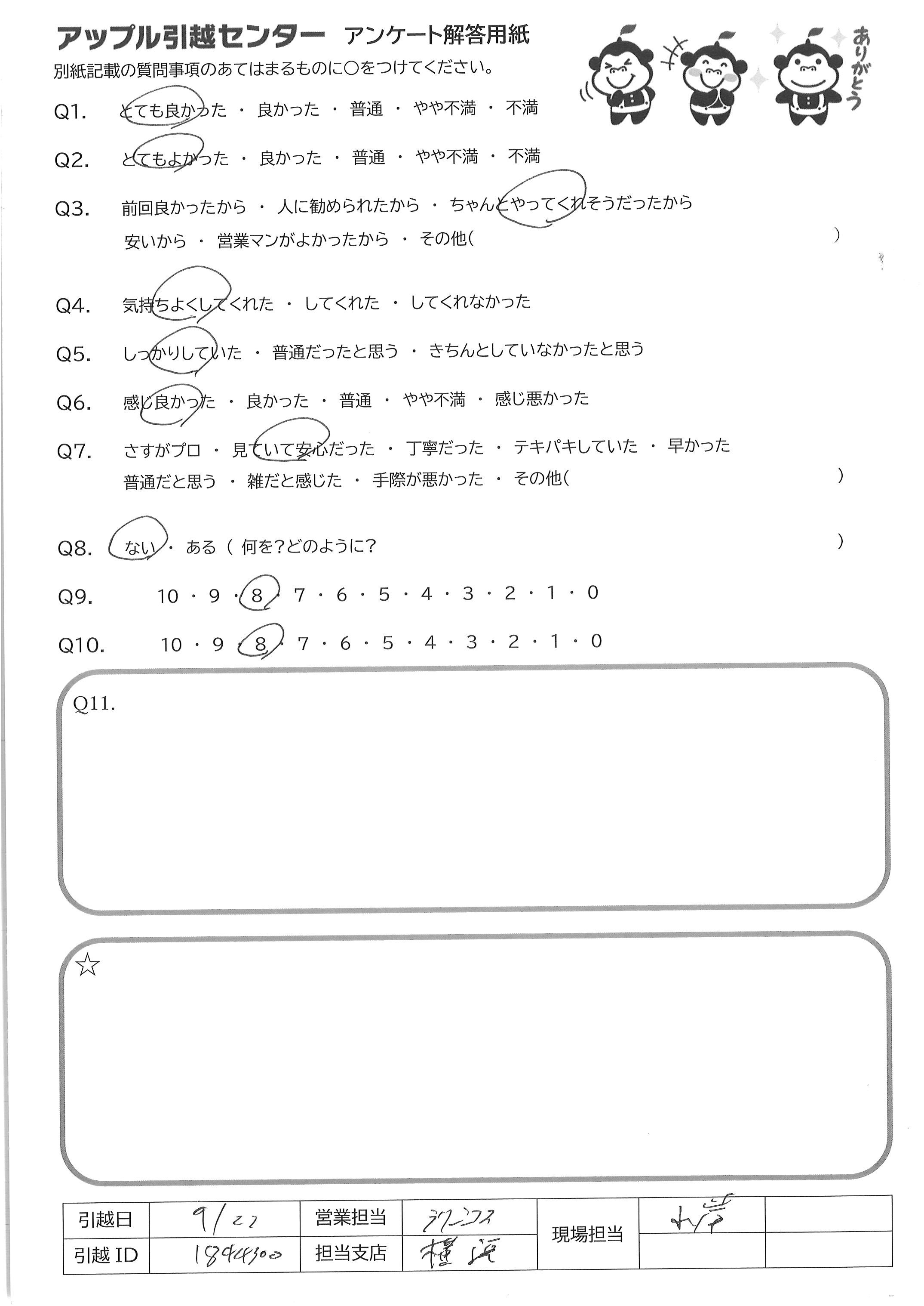 A.営業担当の方はテレビ電話での荷物確認だったのですが、とてもテキパキとわかりやすかったです。時間も早く、忙しいなかとても助かりました。 作業スタッフの方も長時間に及ぶ引越しの中、対応も丁寧でありがたかったです。